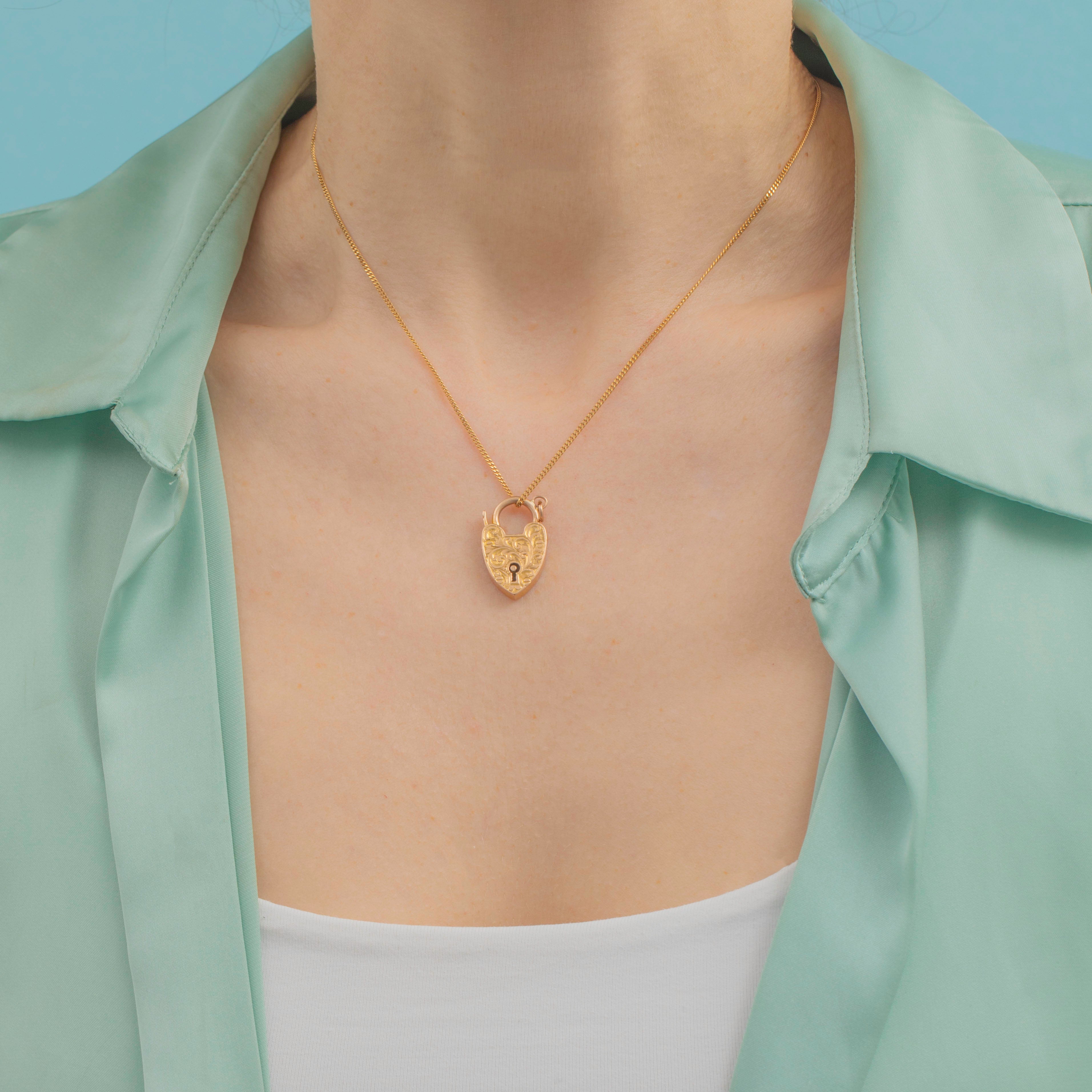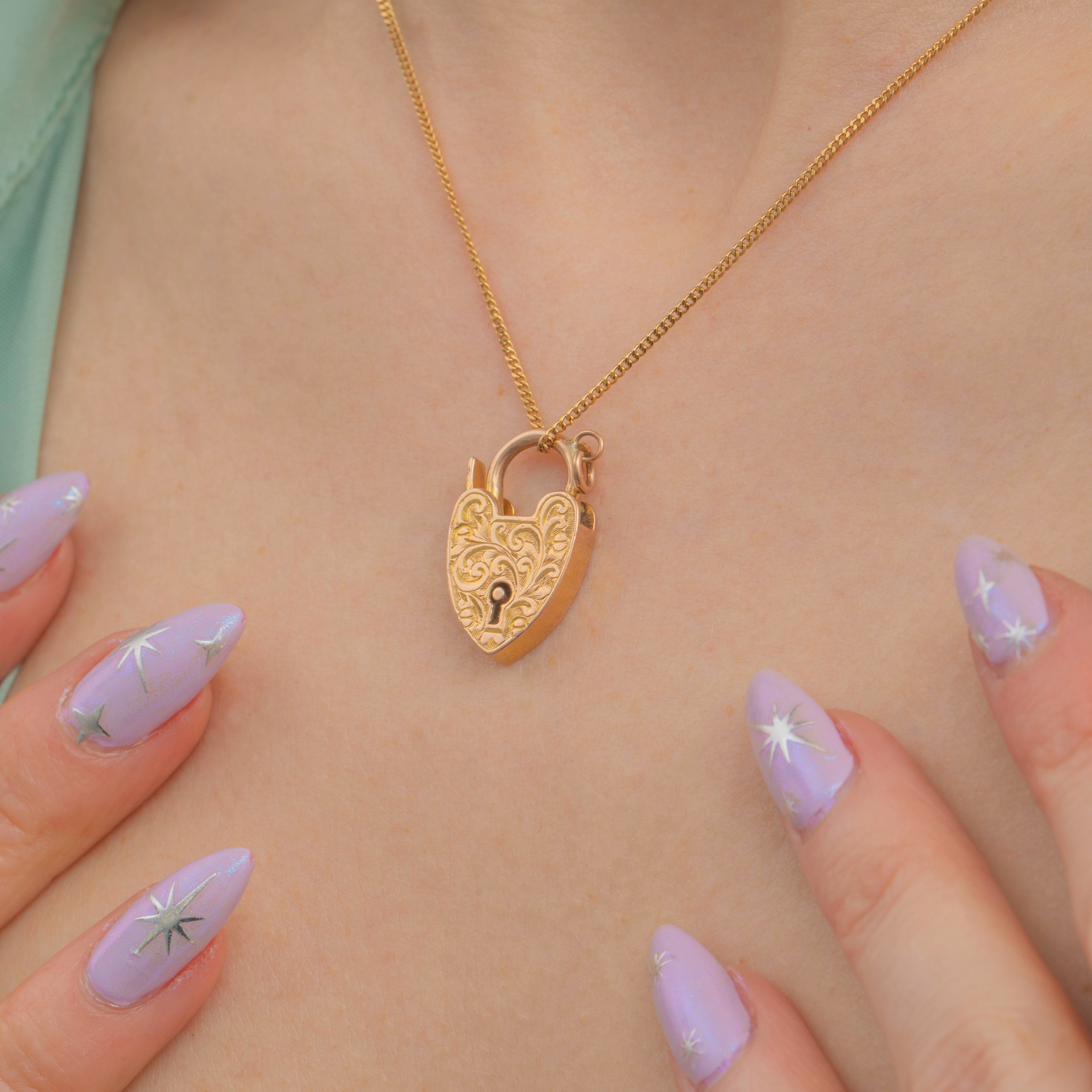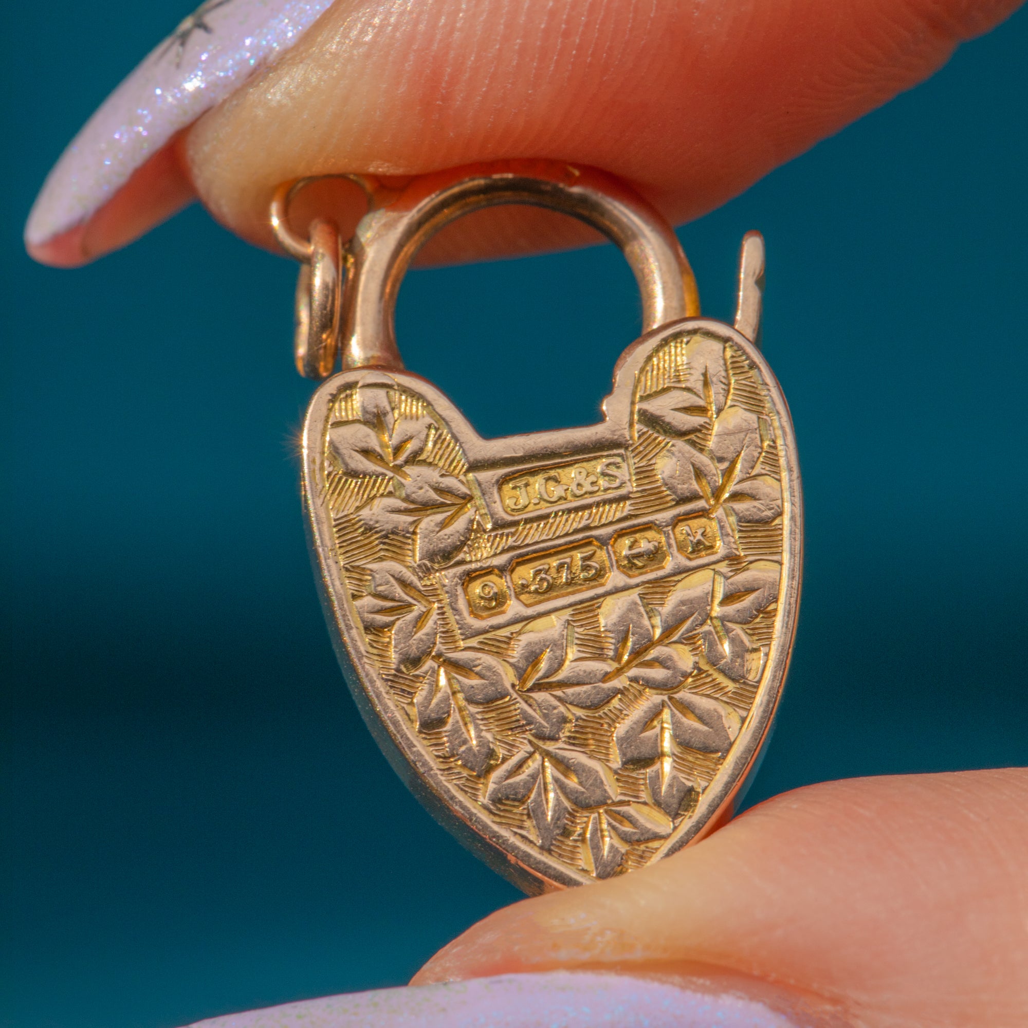 EXCELLENT. This Edwardian 9ct Gold engraved heart padlock pendant is in excellent condition. The Gold is buttery and the engraved details have all remained defined, catching the light beautifully. There is some minor wear on the sides of the pendant, commensurate with age, which in no way detracts from the beauty or functionality of the piece. The locking mechanism works perfectly, allowing you to confidently suspend this antique heart padlock from a chain or bracelet of your choice!