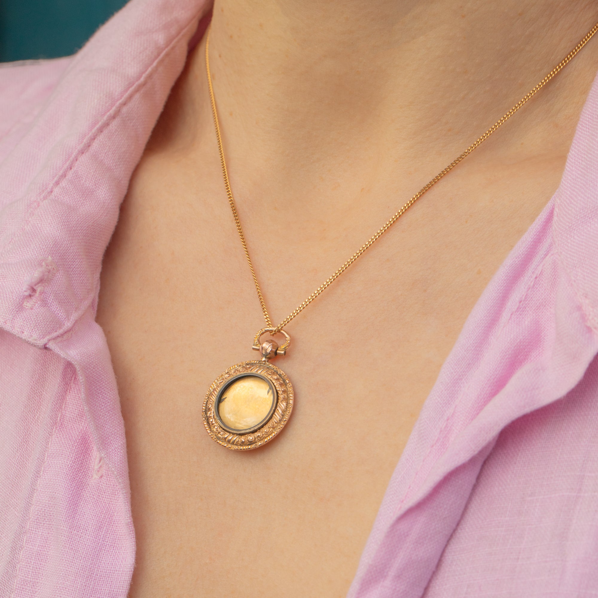 Encased in warm 9ct Gold, her outer edge is delicately engraved adding an extra touch of antique charm. Her elegant form and timeless beauty make her the perfect piece to adorn your décolletage, suspended from your favourite Gold chain. A sentimental keepsake or a luxurious treat, she’s a true Edwardian dream!