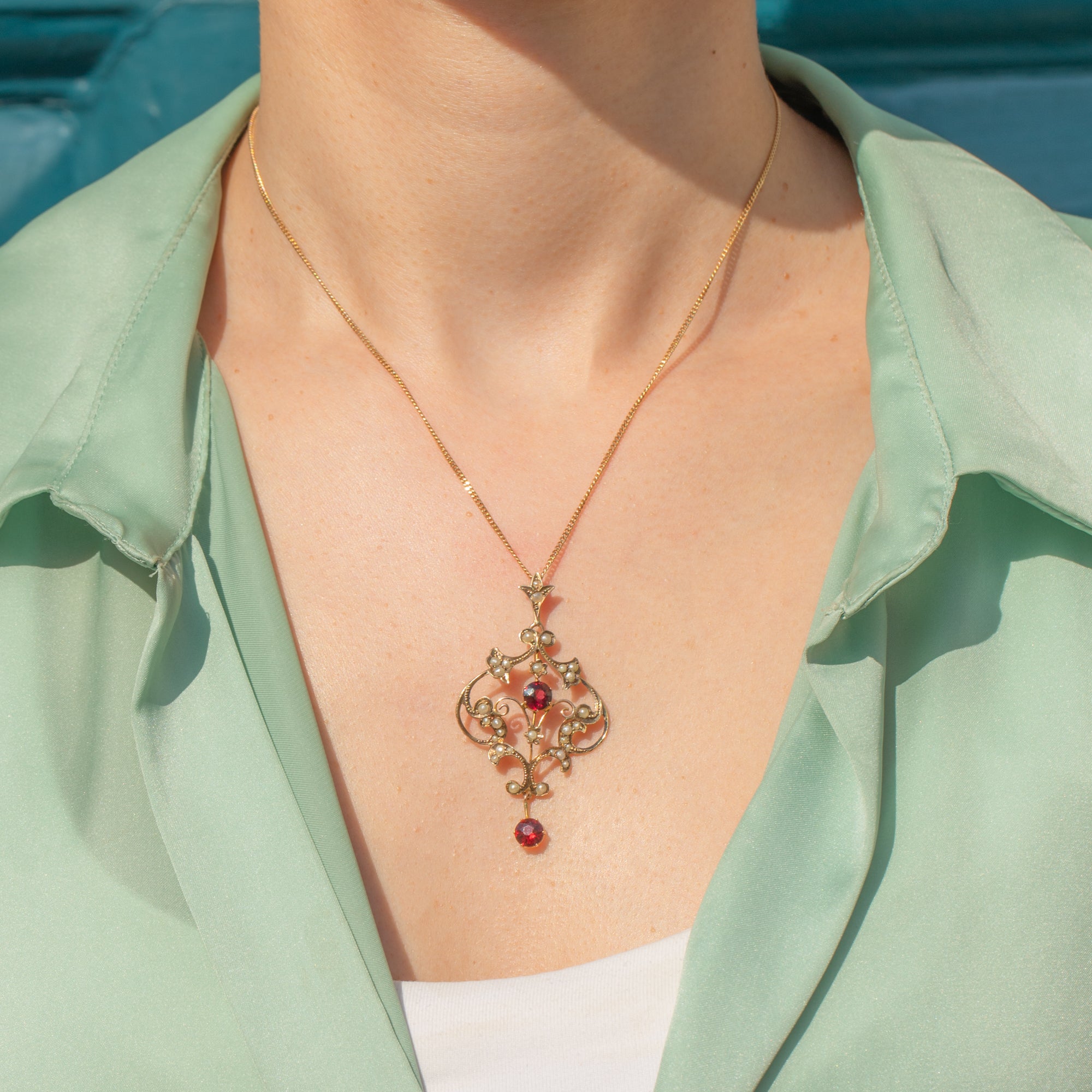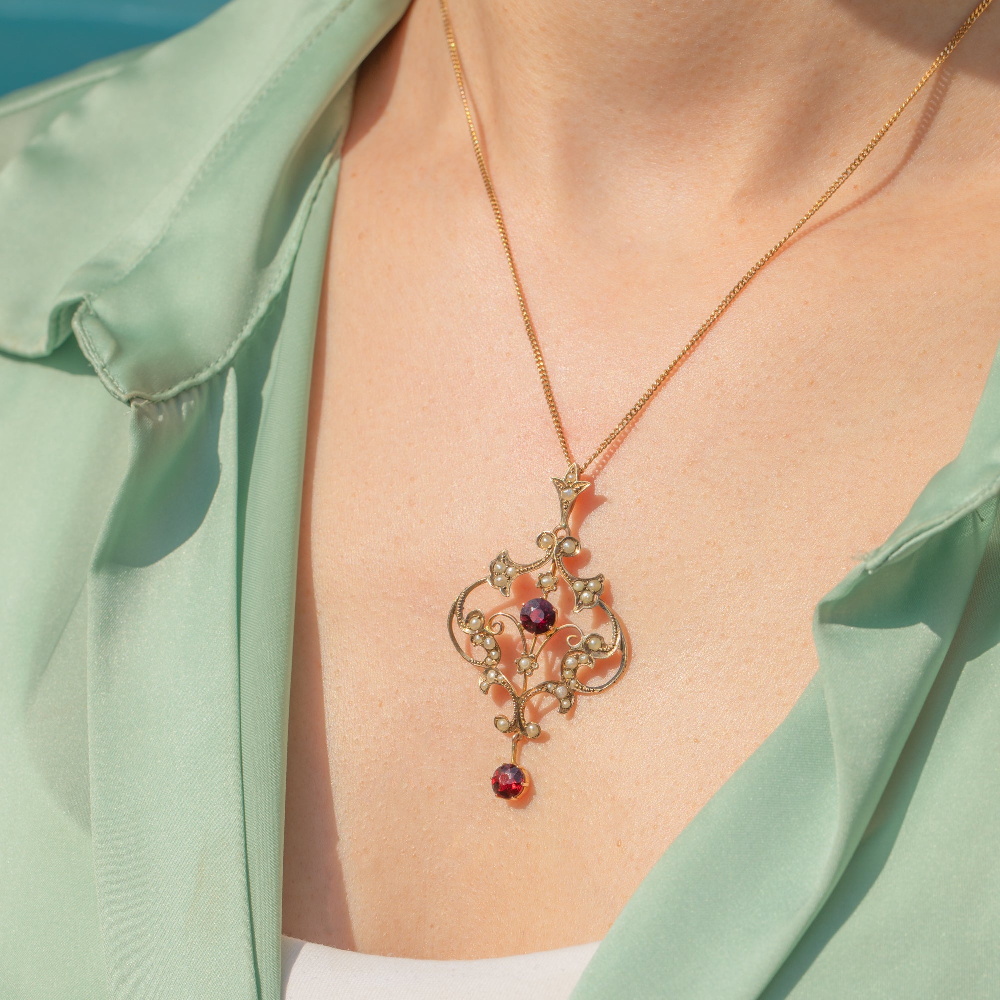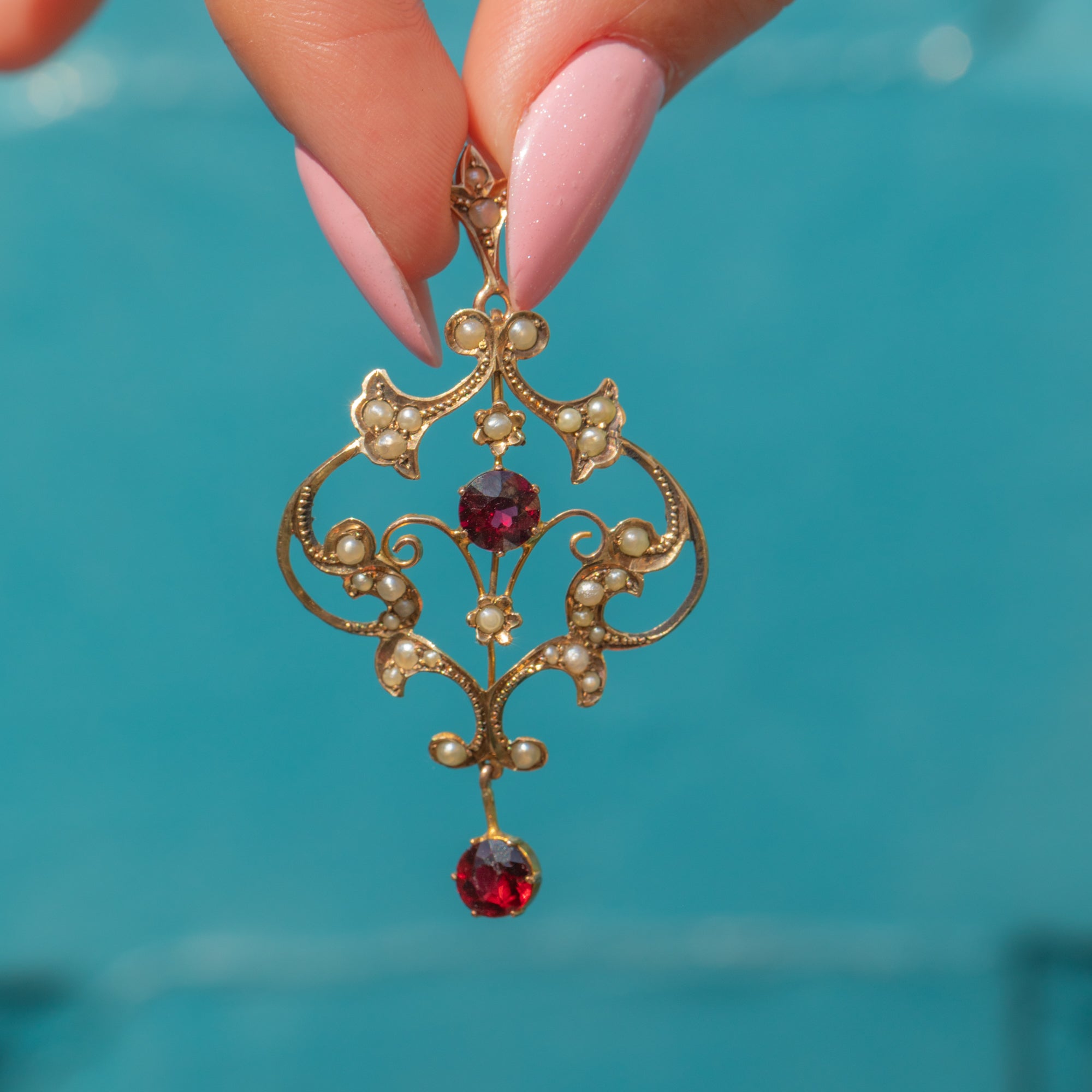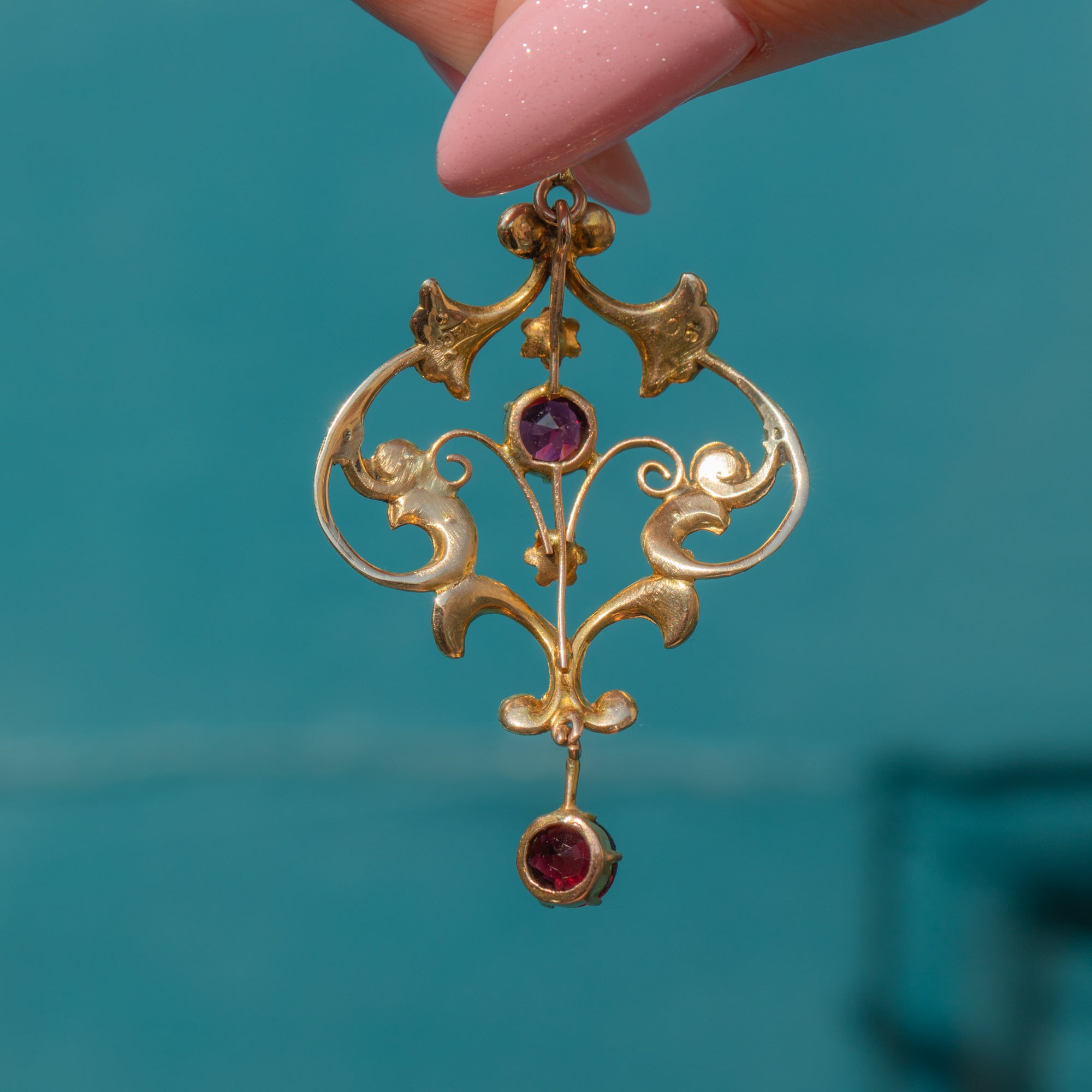 At her centre sits a deep red Garnet, beautifully complemented by a matching Garnet drop that sways gently below, catching the light with every movement. Together, they add warmth and romance to this enchanting piece. A stunning example of the Lavalier style, full of grace, detail, and period charm.
