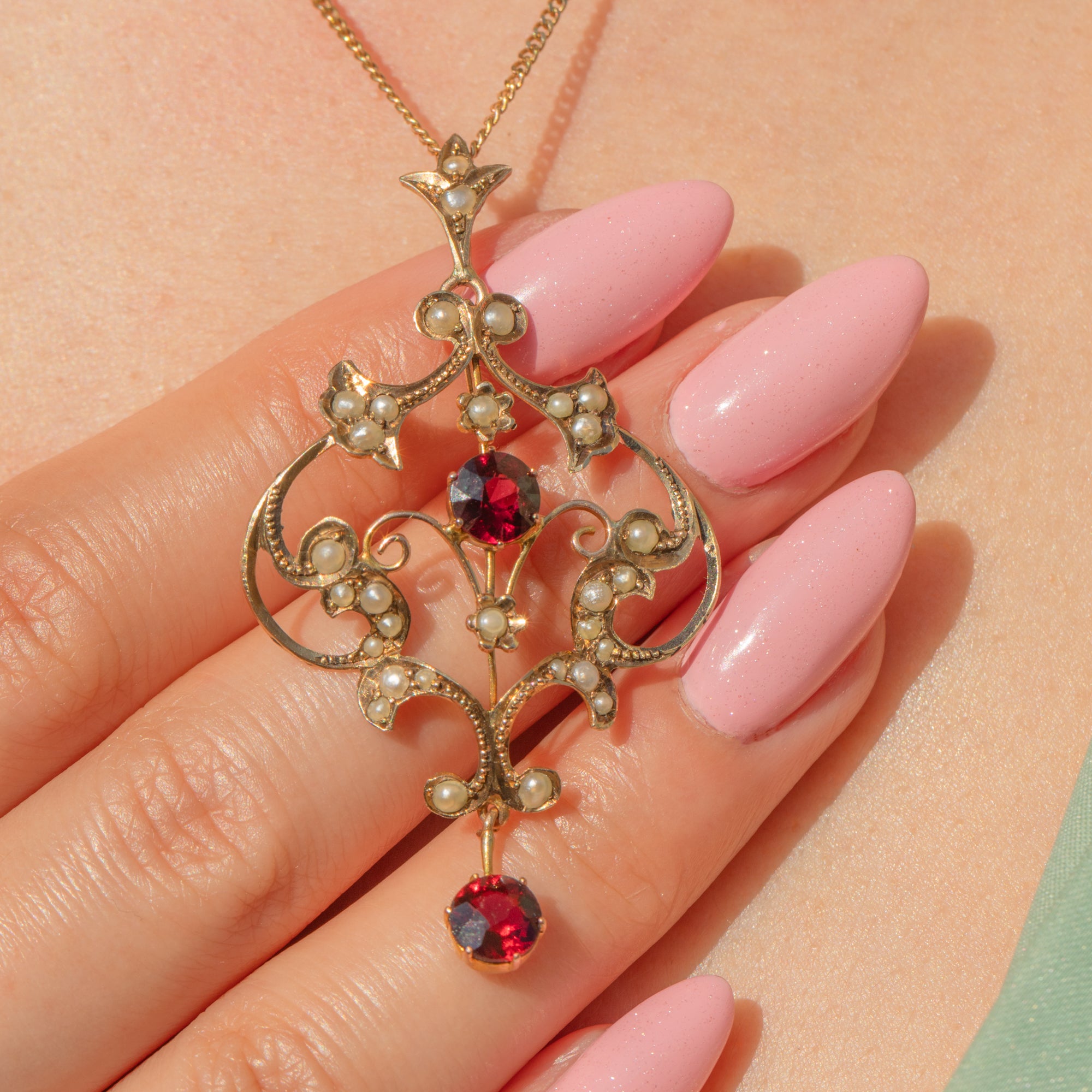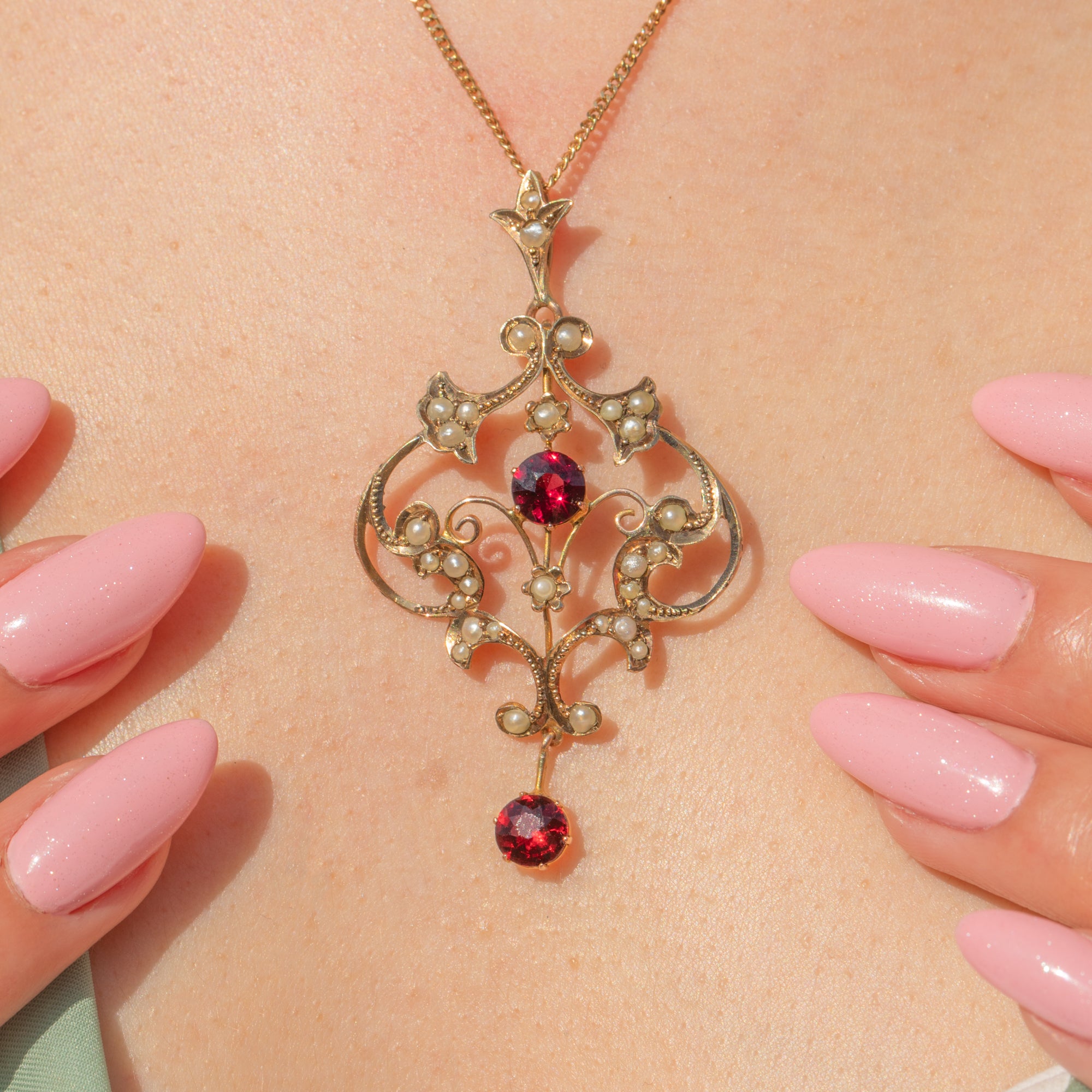 This exquisite Edwardian 9ct Gold Garnet and Pearl Lavalier pendant is a true gem for any antique jewellery collection. Crafted from rich 9ct Gold, her flowing, feminine lines embody the elegance of the Edwardian era, curling delicately around floral forms and set with shimmering Seed Pearls.
