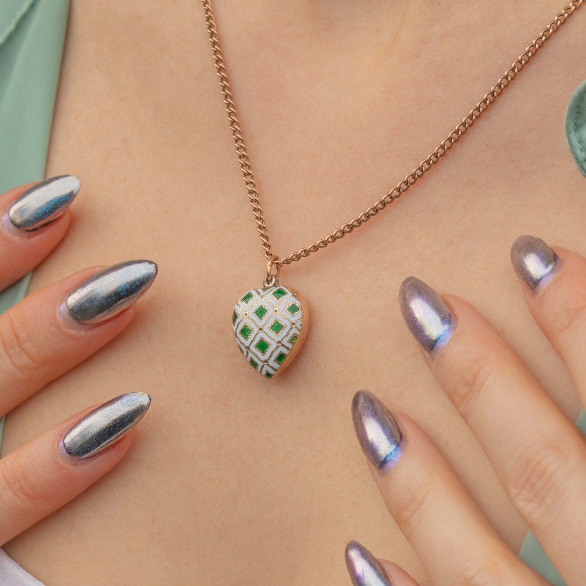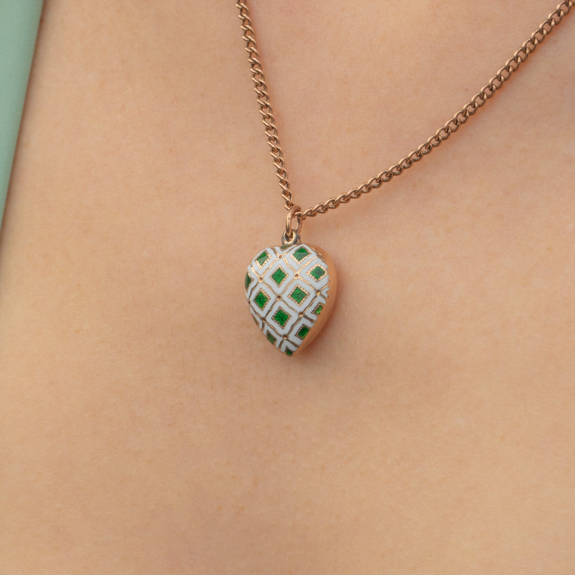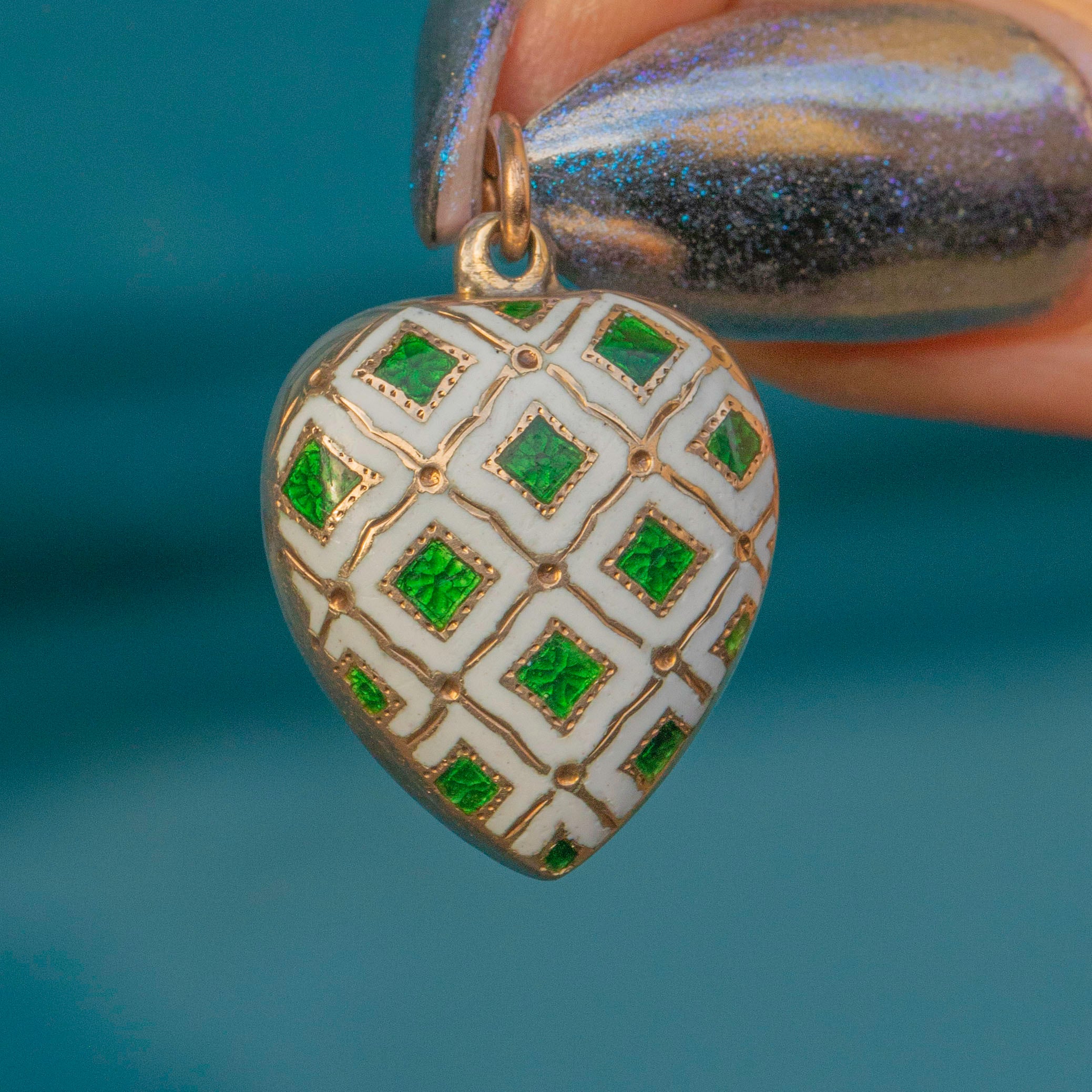 Edwardian 9ct Gold Green & White Enamel Puffy Heart Pendant