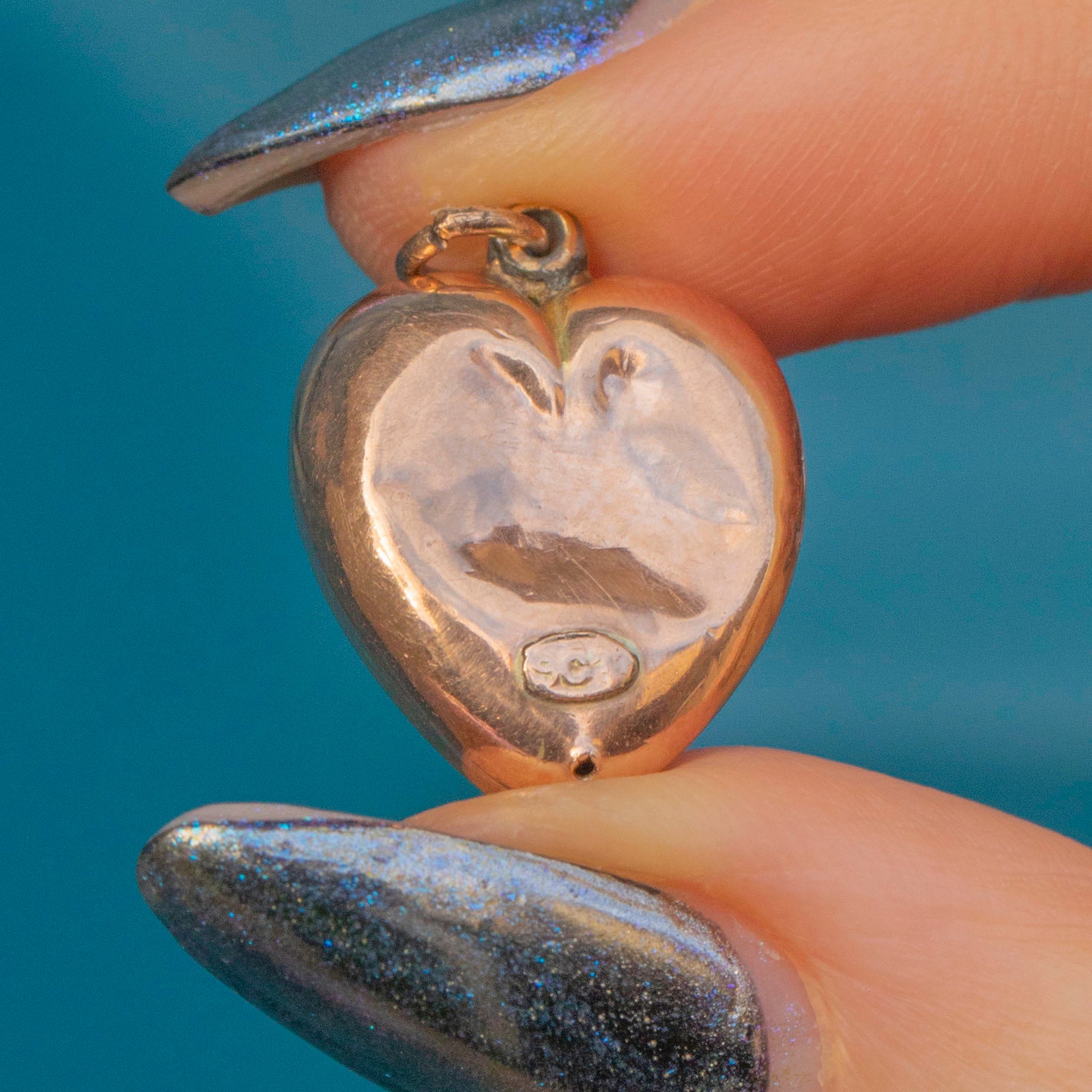 GOOD. This Edwardian 9ct Gold Enamel puffy heart is in good overall condition. The pendant's Enamel has lasted beautifully, with the rich green and white combination looking just as good today. This little pendant has had some loving though, as a result the back of the pendant has lost its puffiness and goes inwards-but rest assured that it still wears comfortably and can be worn with confidence.