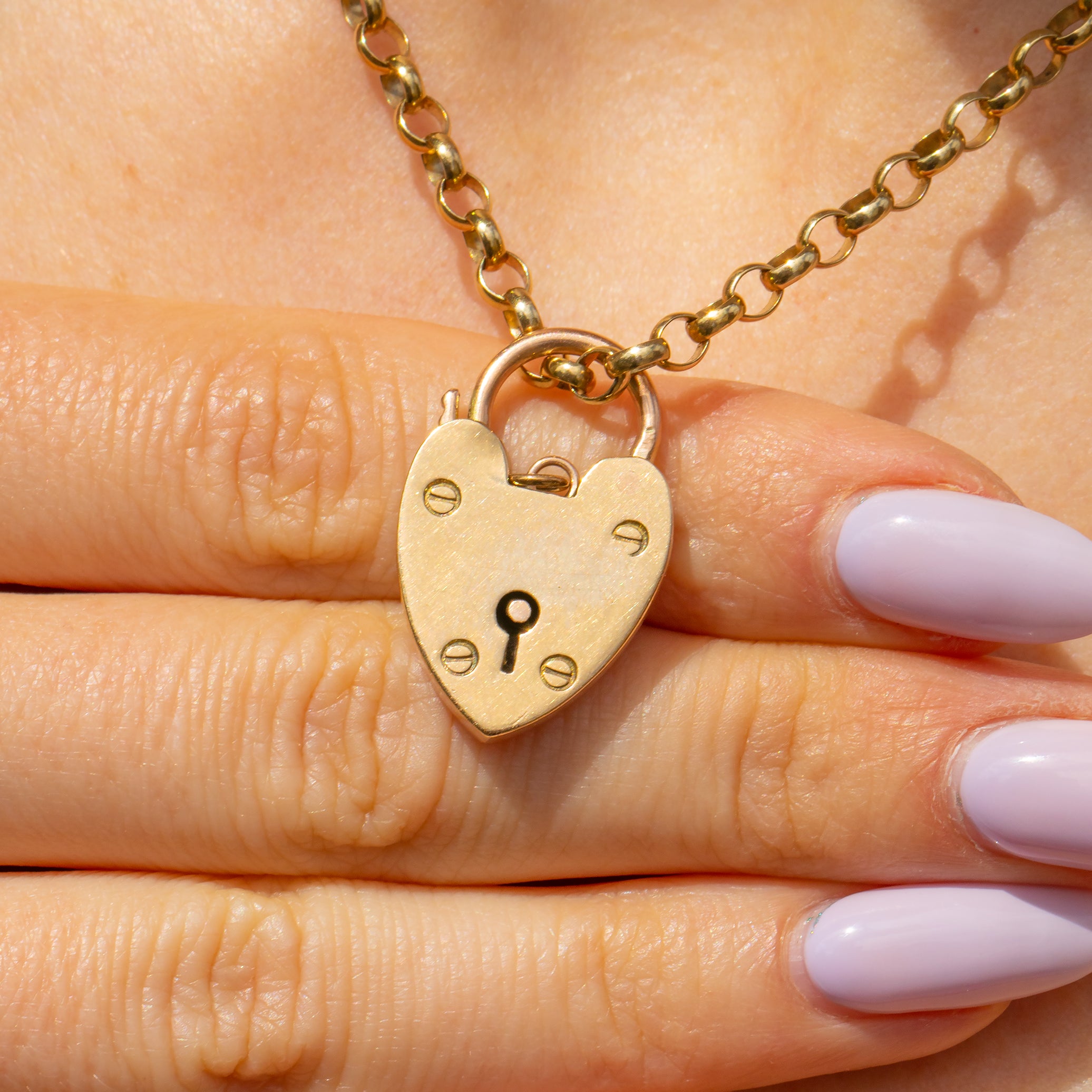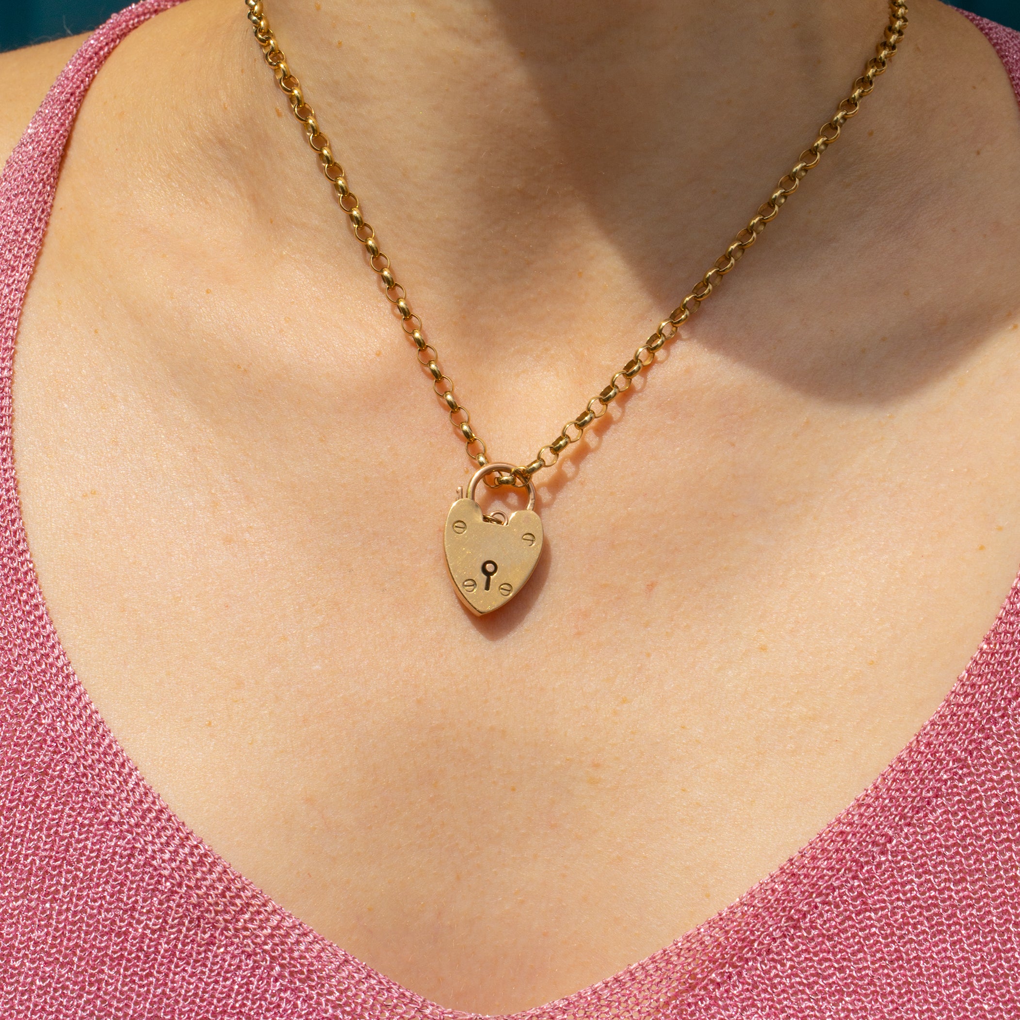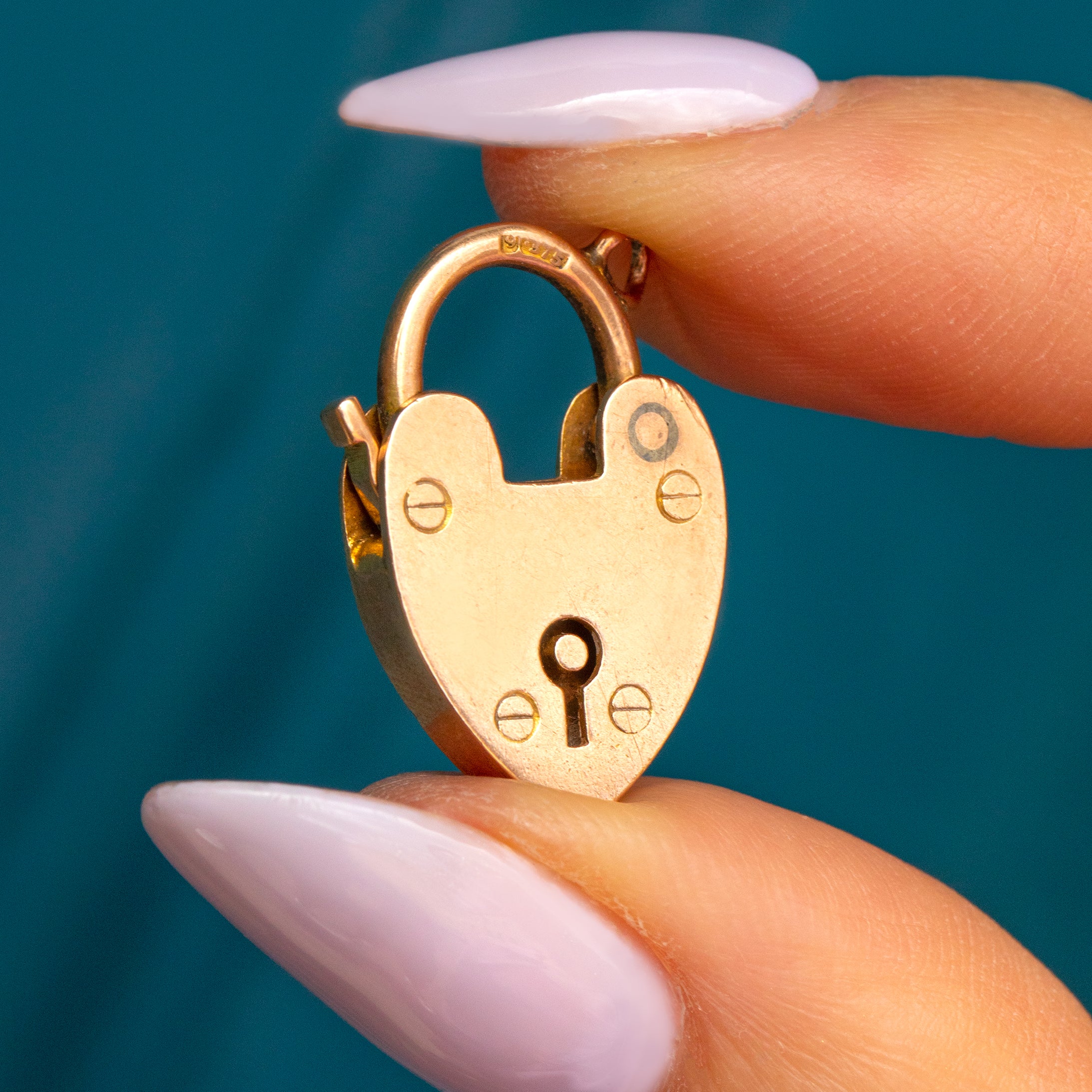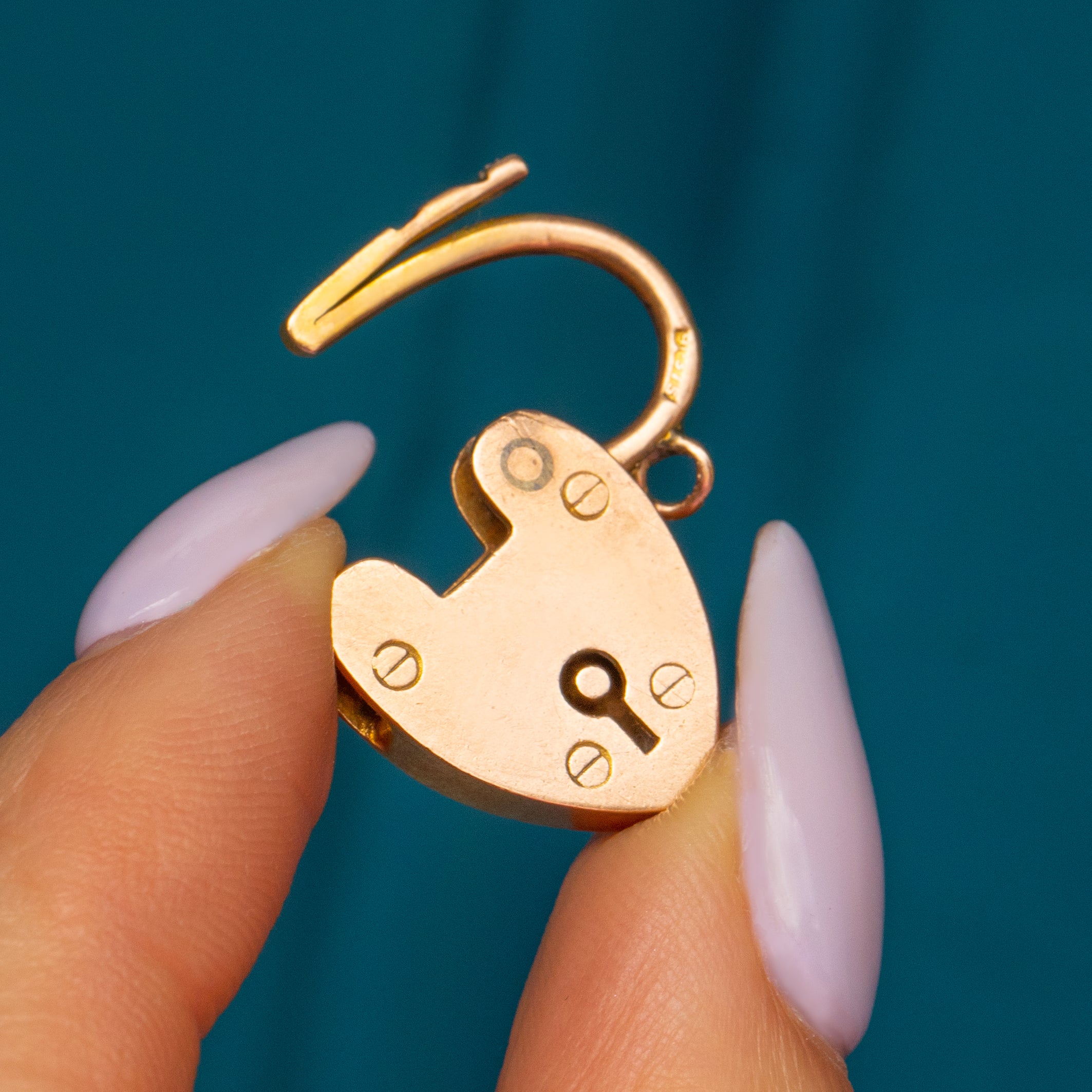 VERY GOOD. This Edwardian 9ct Gold heart padlock pendant is in very good condition. The Gold is bright and buttery and free from any dings. There is a darker ring around the pin which forms the hinge, but this does not detract from her overall beauty. The padlock is perfectly functioning and, when closed. you can be assured it is securely shut. This antique Gold heart pendant is ready to adorn the neck of its owner, adding a touch of elegance to any outfit!