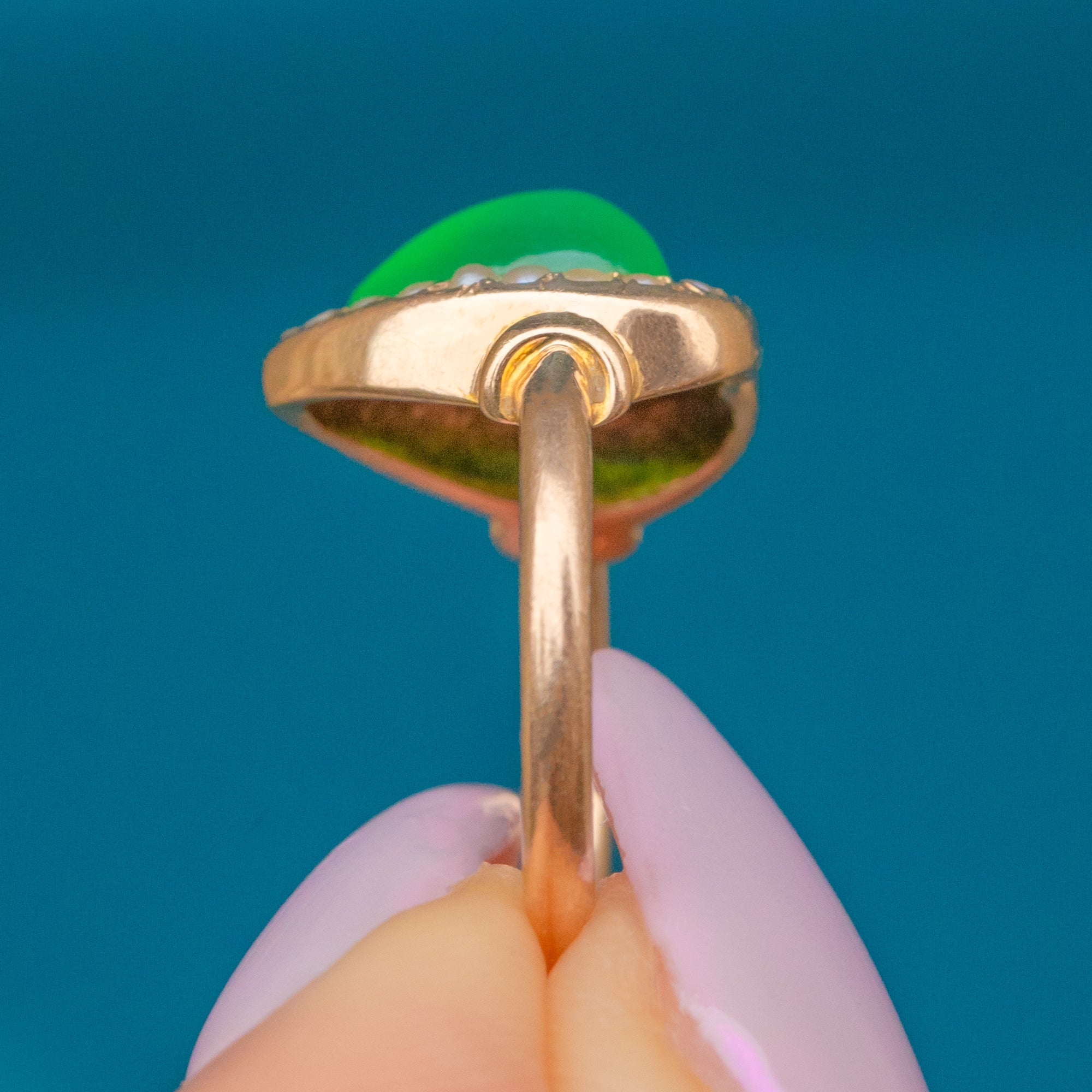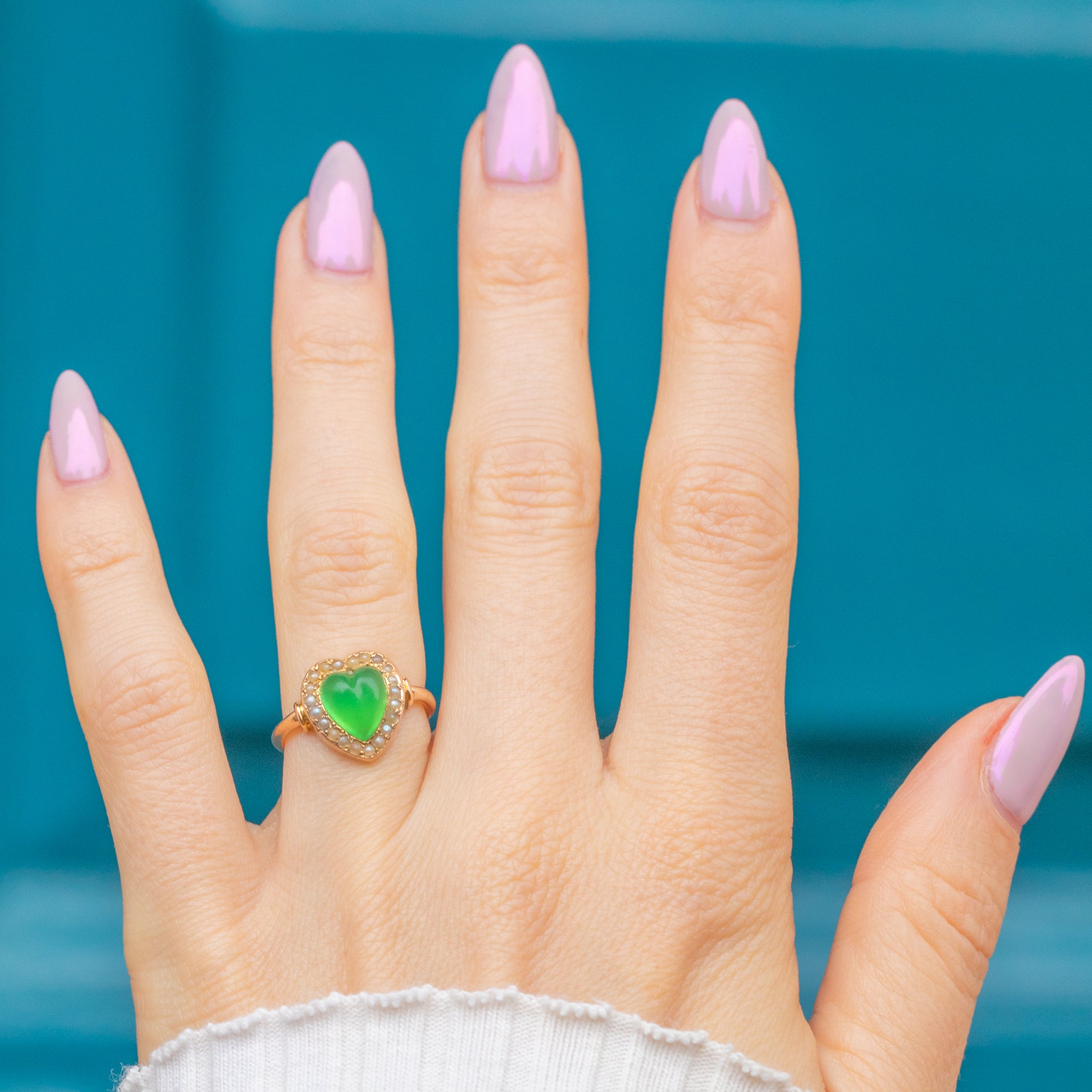 VERY GOOD - EXCELLENT: The green Chalcedony and Pearls are all in pristine condition with no chips or abrasions. No damage and the heart is glowing beautifully. The Gold remains bright and well cared for. A neat resize is visible to the back of the band, but the ring is otherwise in superb antique condition.