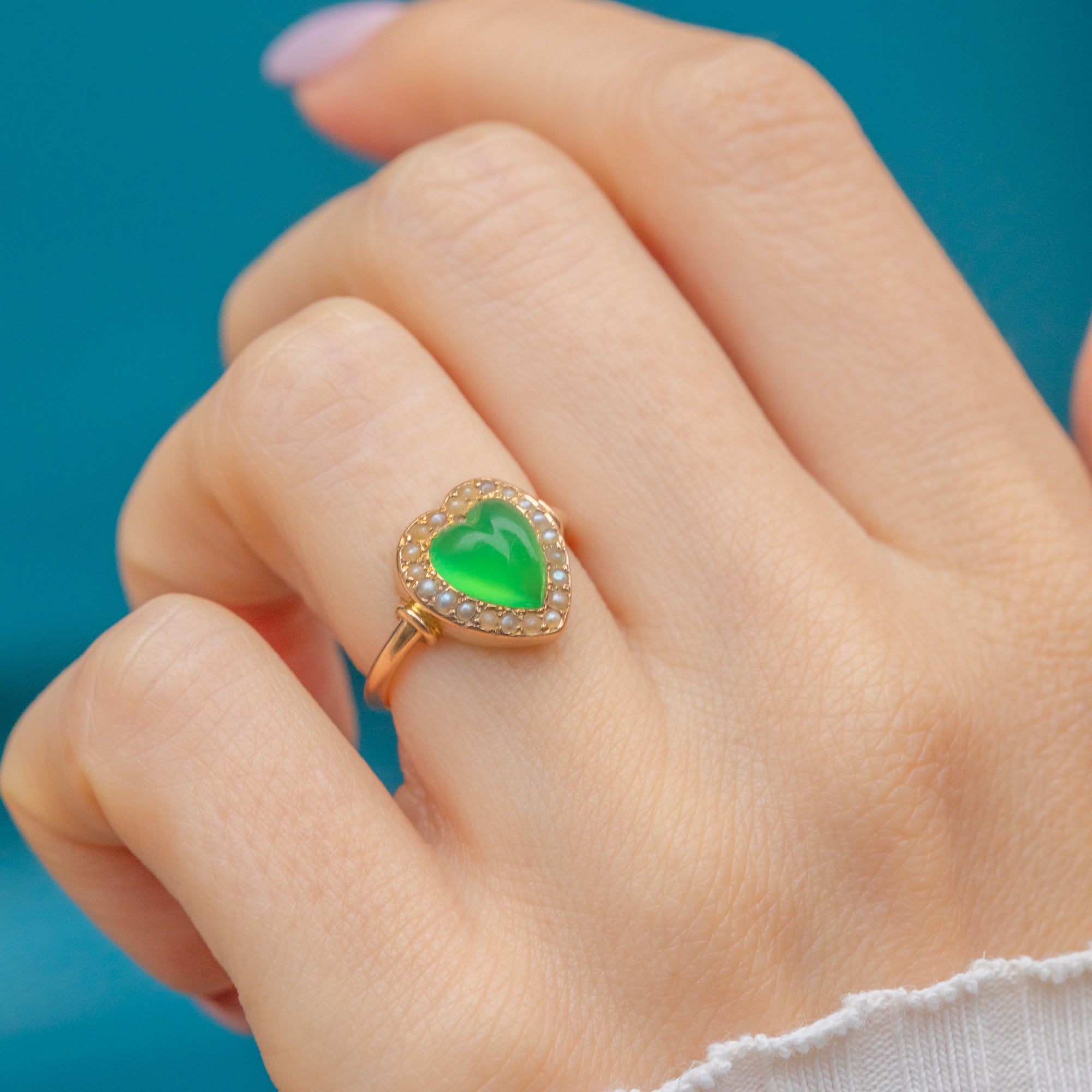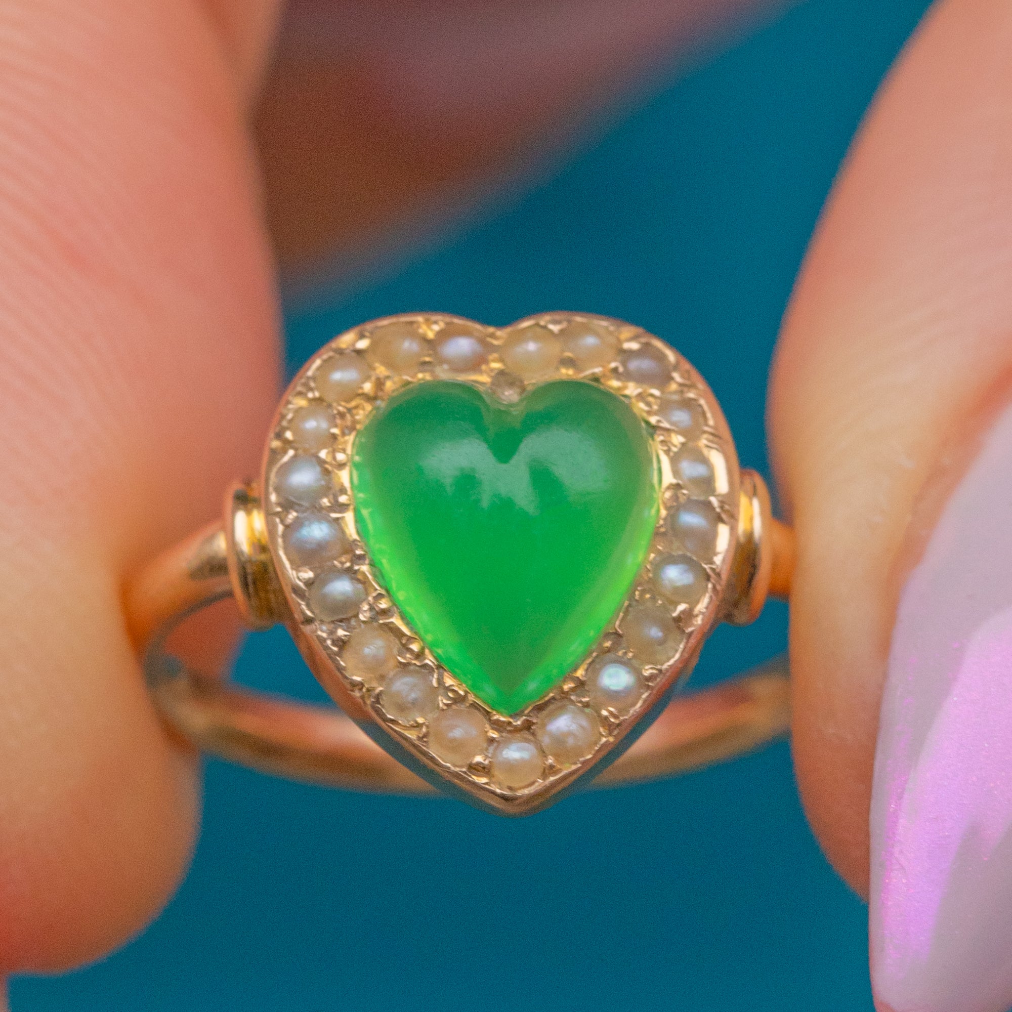 Edwardian 9ct Gold Heart-Shaped Green Chalcedony Pearl Ring