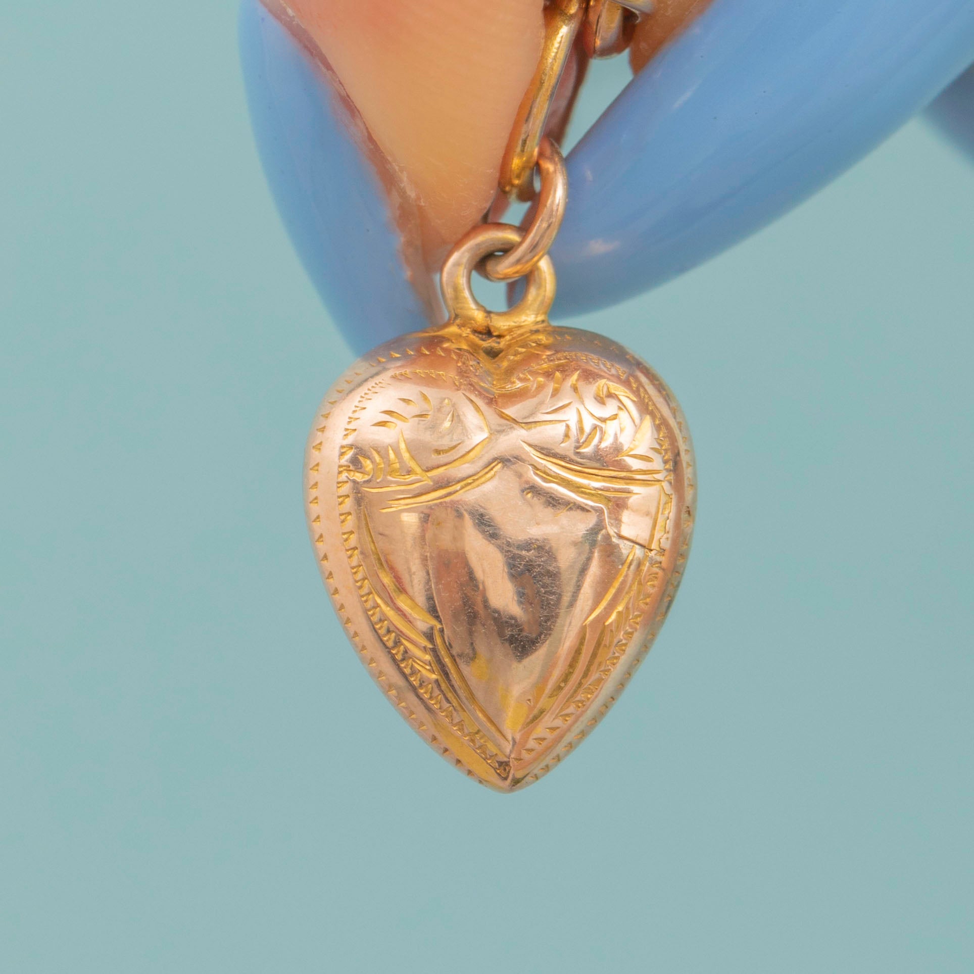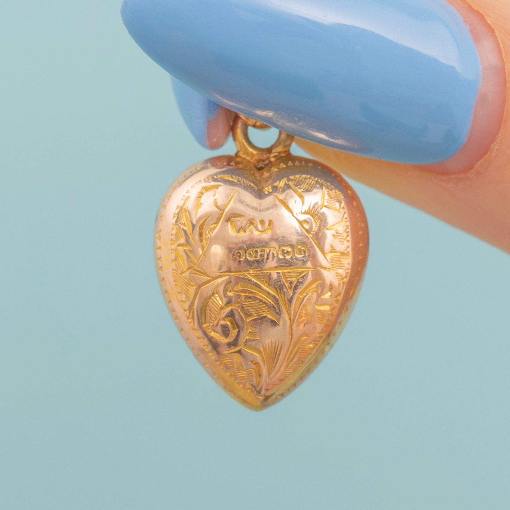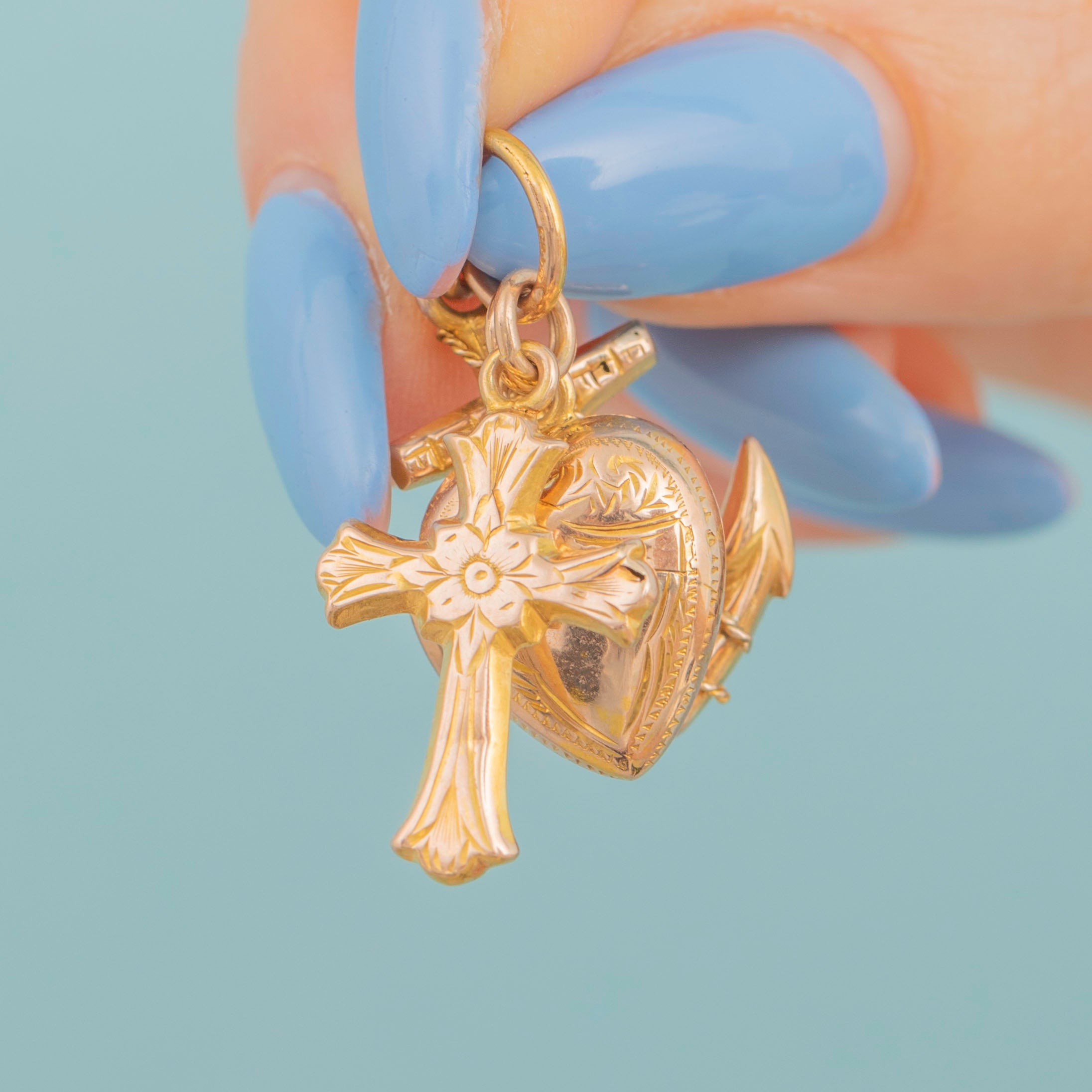 This glossy Gold charm trio features an engraved puffy heart, textured anchor, and floral cross - she is just bursting with Edwardian character! Pretty, lightweight, and versatile, this antique Gold pendant will make the perfect new addition to your jewellery collection.