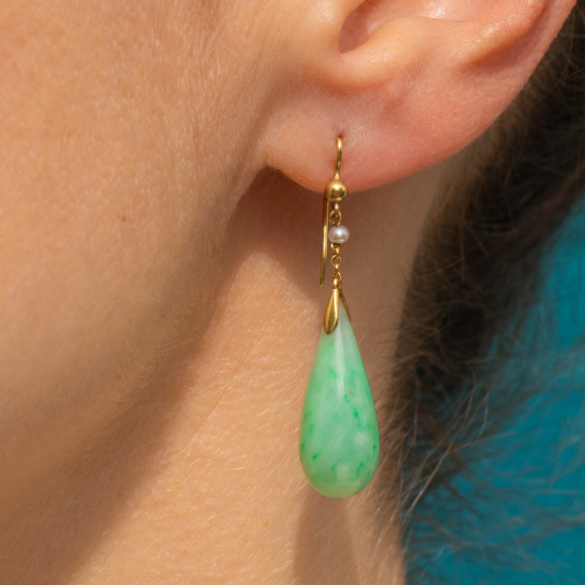 EXCELLENT. These Edwardian 9ct Gold Jade Pearl drop earrings are in excellent condition! The Jade gemstones are perfectly smooth with no signs of wear, and both Pearls are securely set with their natural nacre fully intact. With slender and generously sized earring hooks, you can wear these striking antique Jade earrings in comfort!