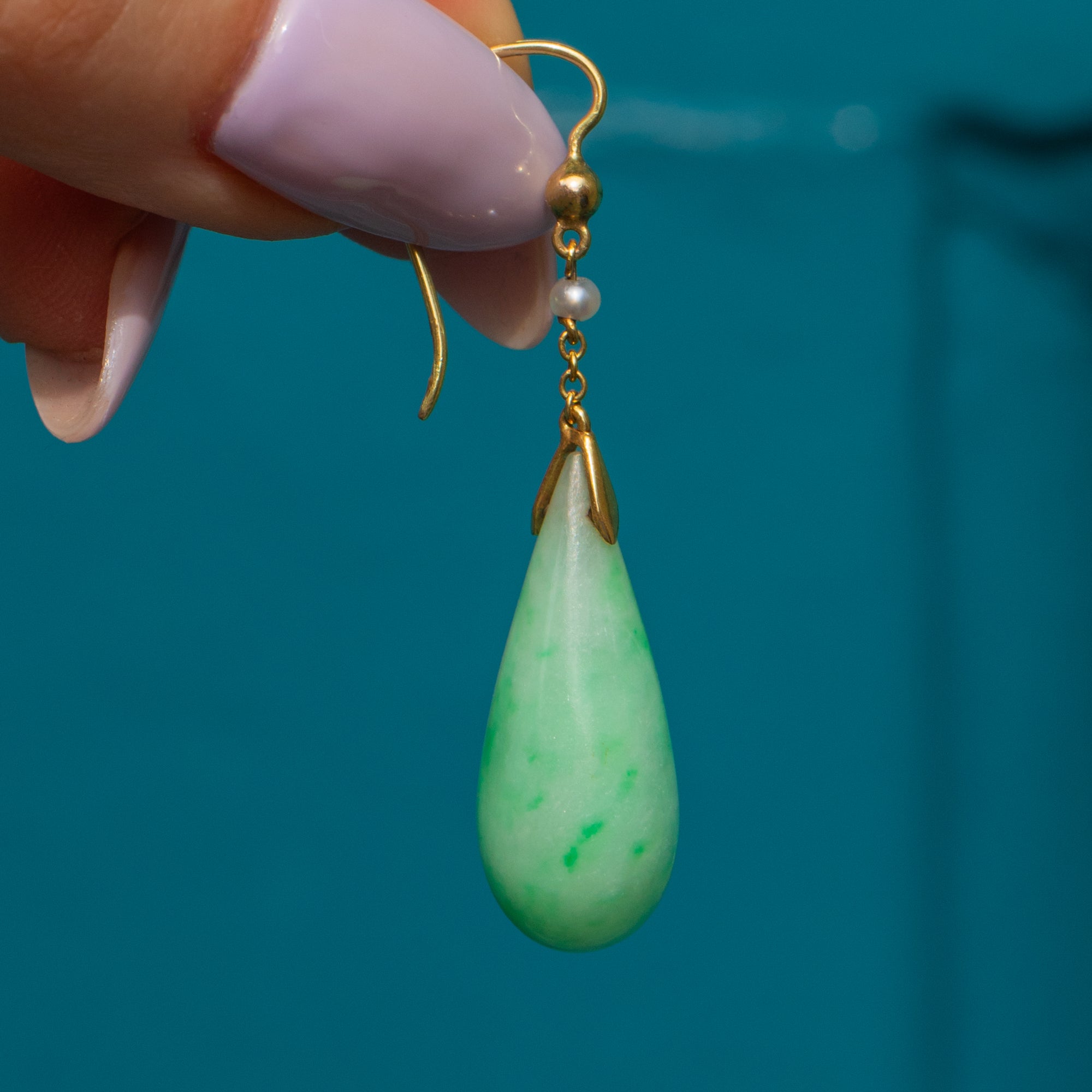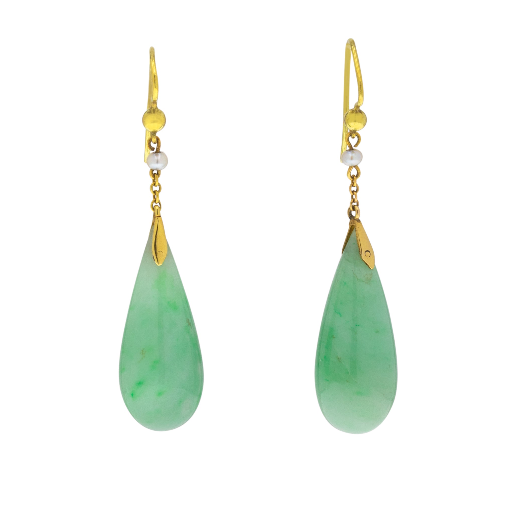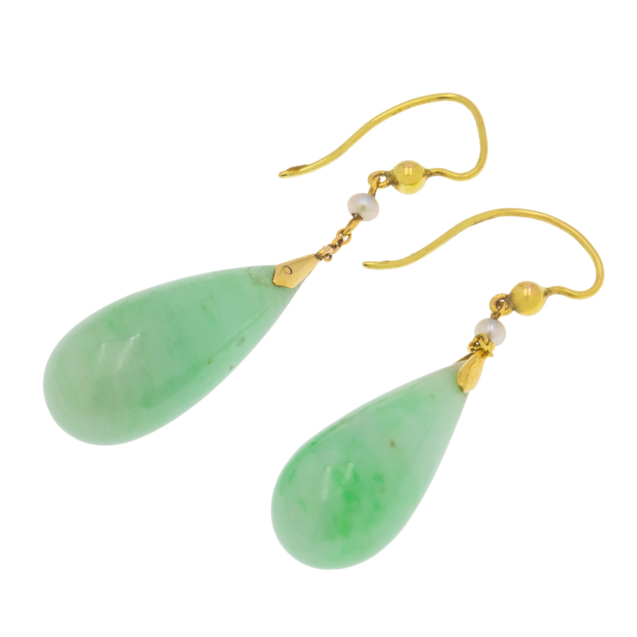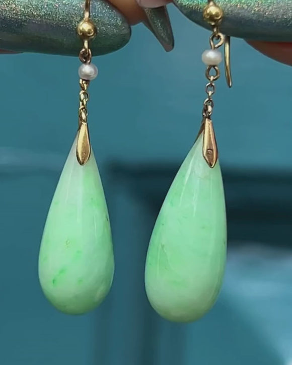 Edwardian 9ct Gold Jade Pearl Drop Earrings