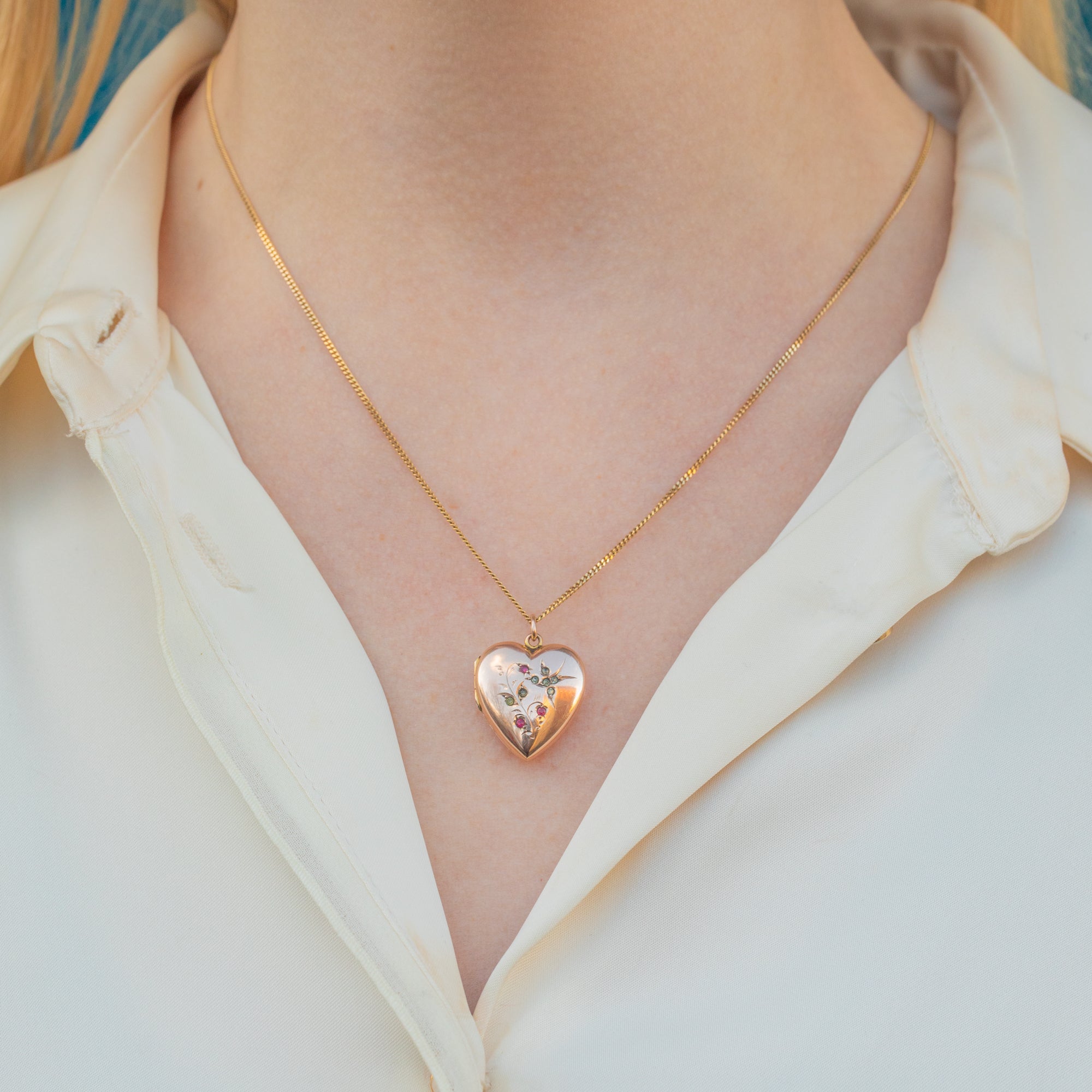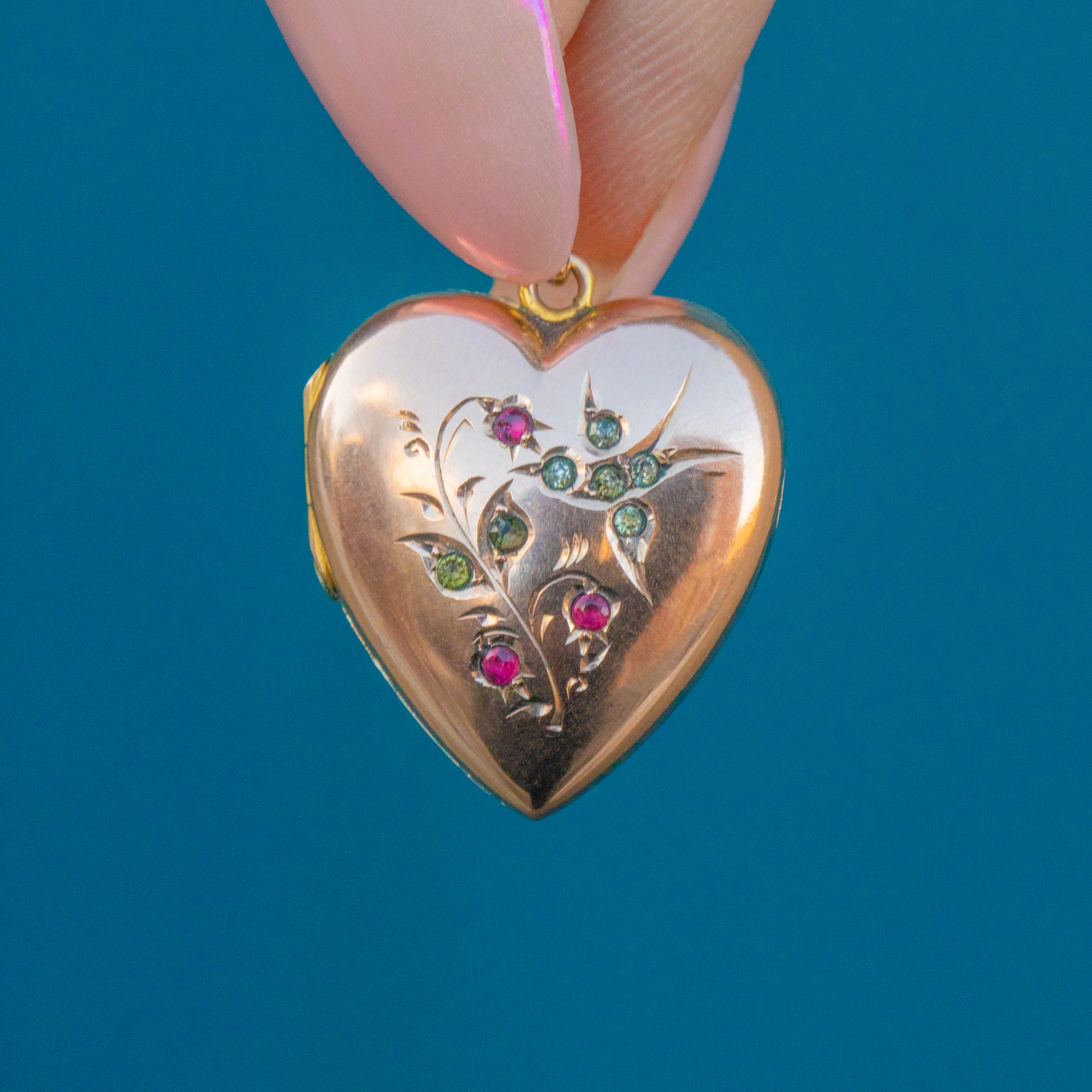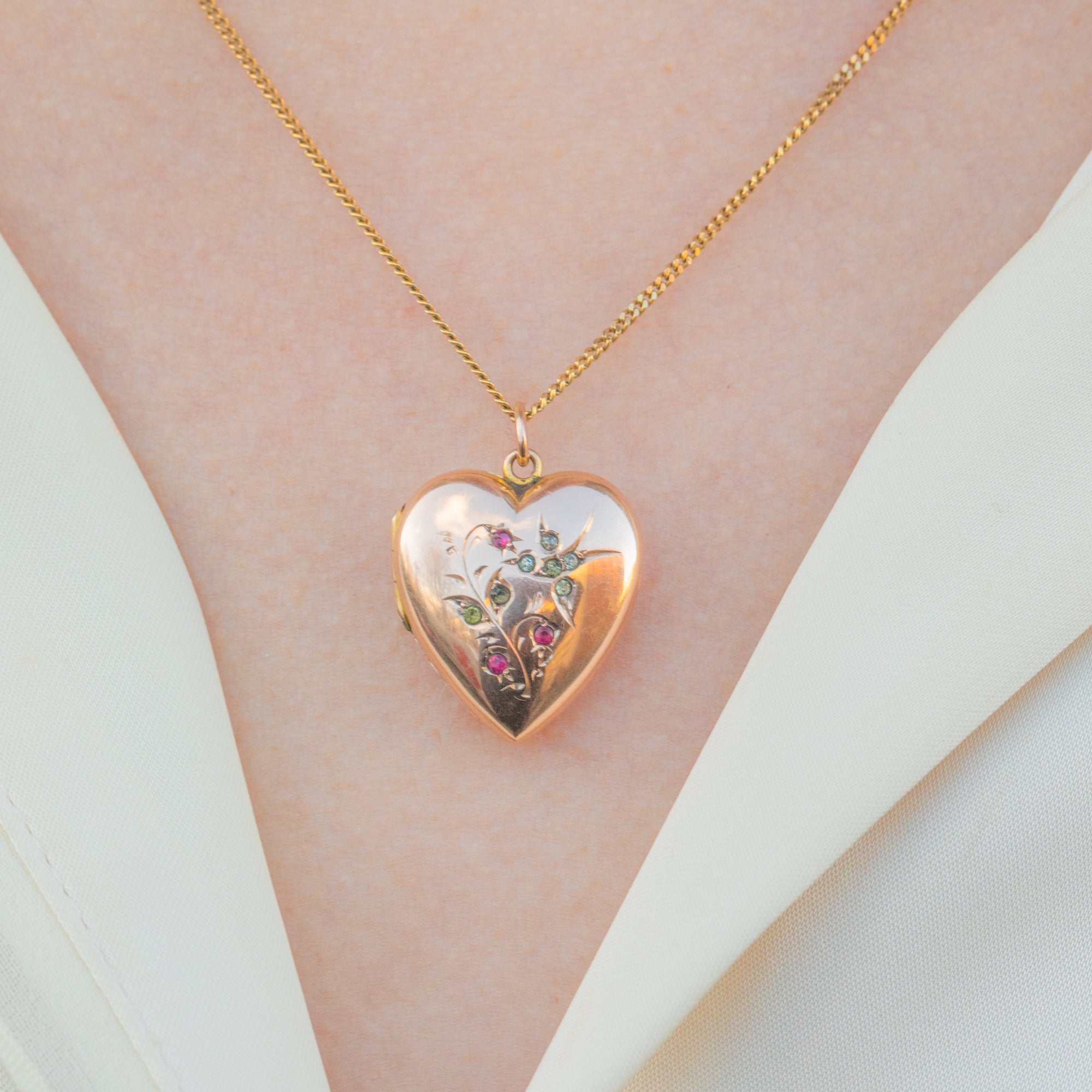 VERY GOOD. This antique 9ct Gold Paste swallow heart locket is in very good condition. The Paste gems are secure and the motif is gorgeous. The locket opens easily and closes securely. Inside, there are two frames present and there is some sign of age to note by the rims, but the piece is structurally intact and you wont see this when you're enjoying wearing it on a chain.