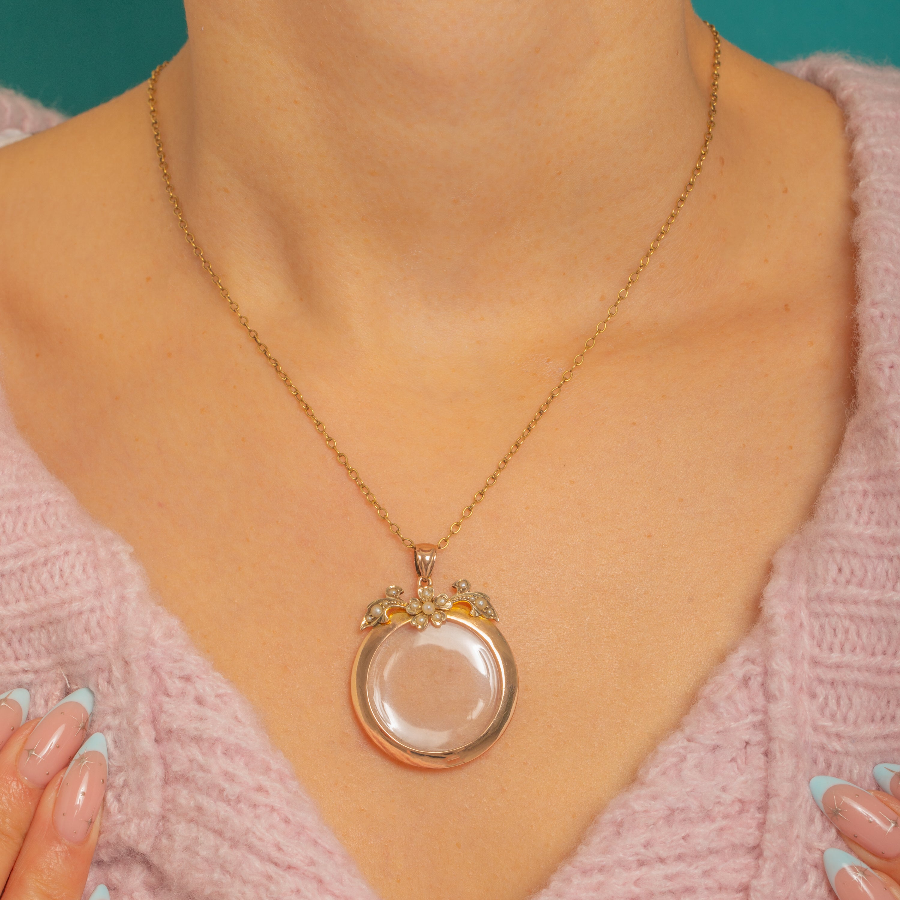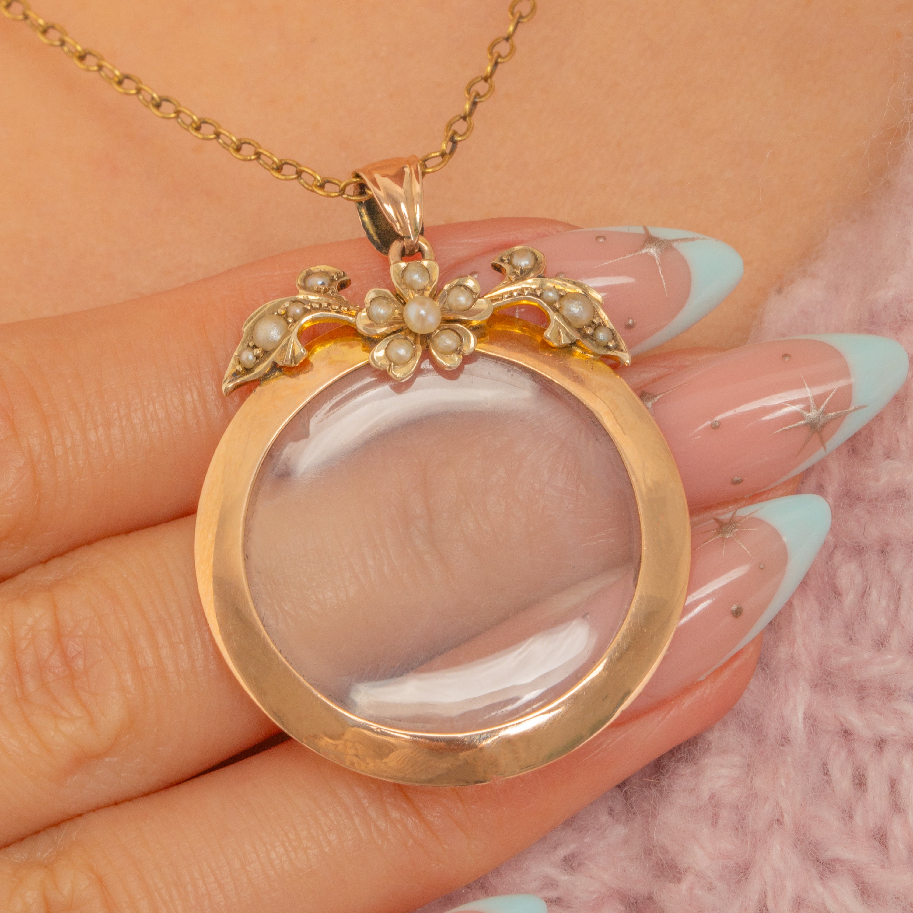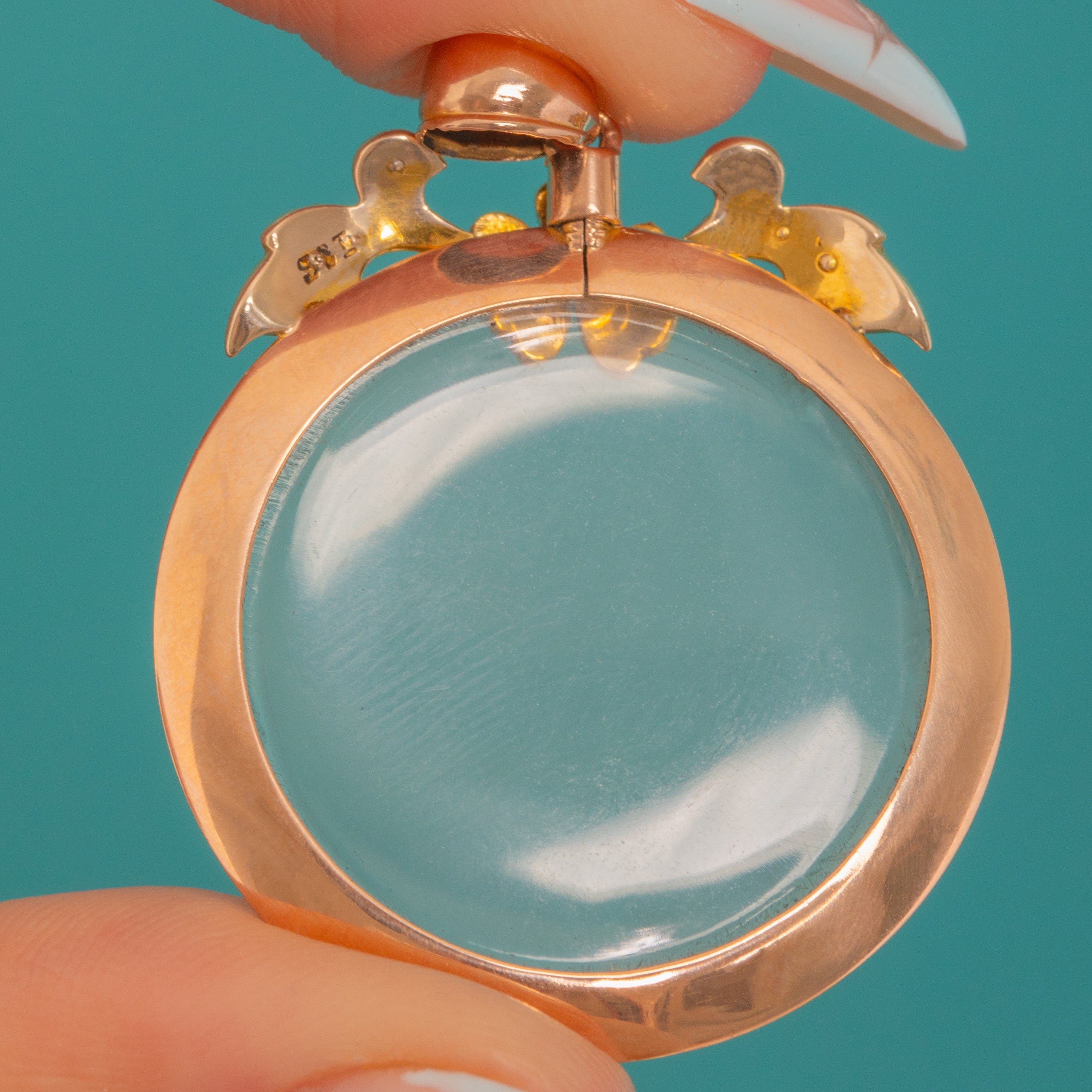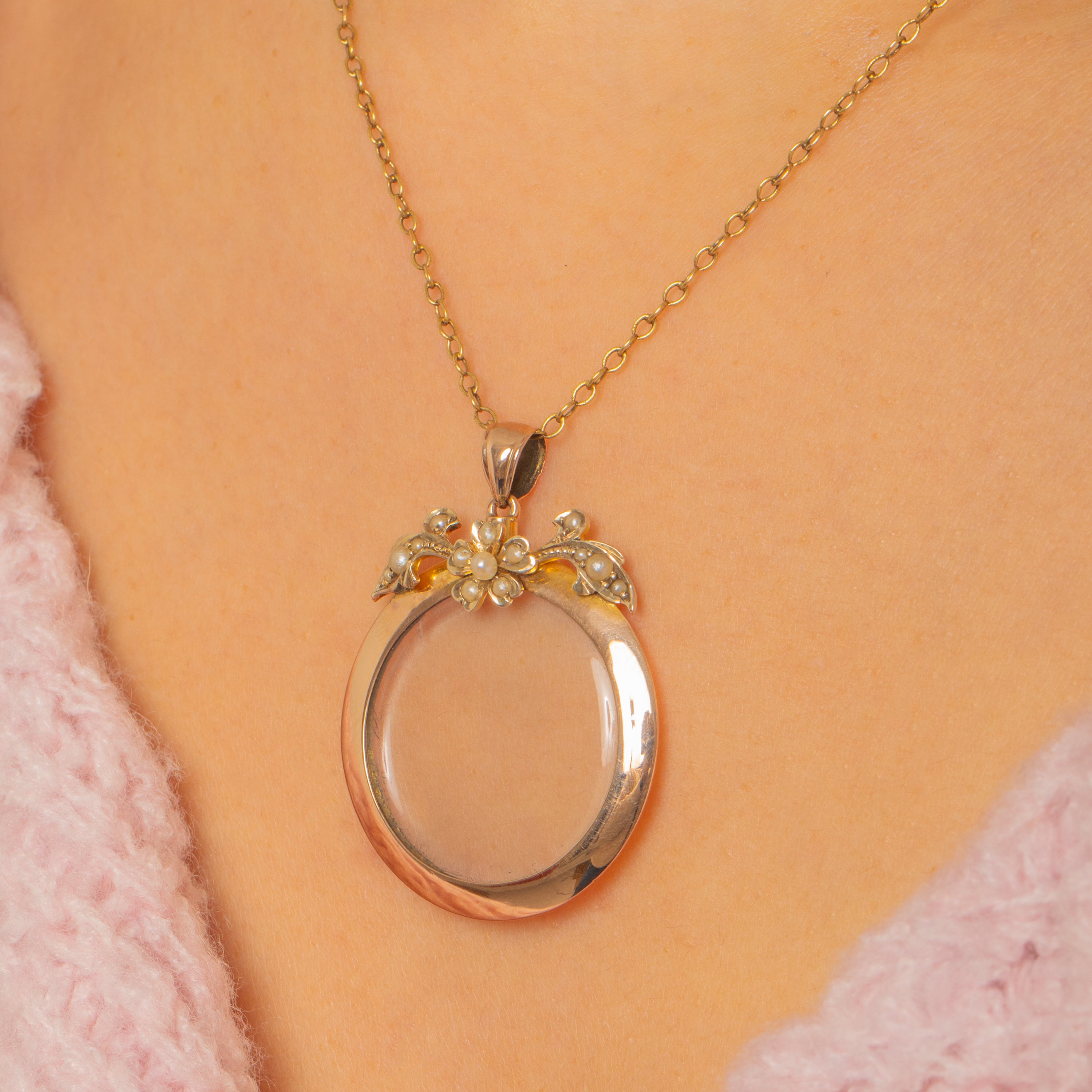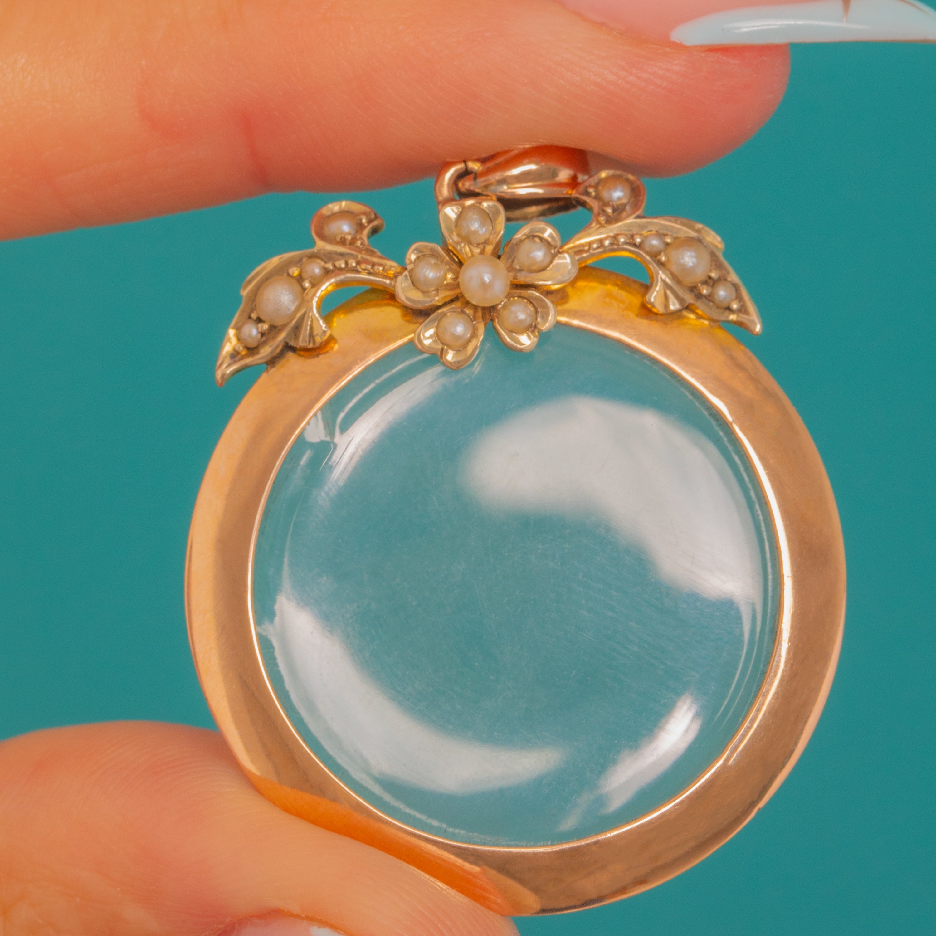 繊細なEdwardian期の写真ロケット。純粋な9金製で、愛らしい真珠の花が頂にあしらわれています。滑らかで丸みを帯びた枠が、澄みきった二重ドーム型の窓を包み込み、上品で硬貨のようなシルエットが洗練と優美さを感じさせます。