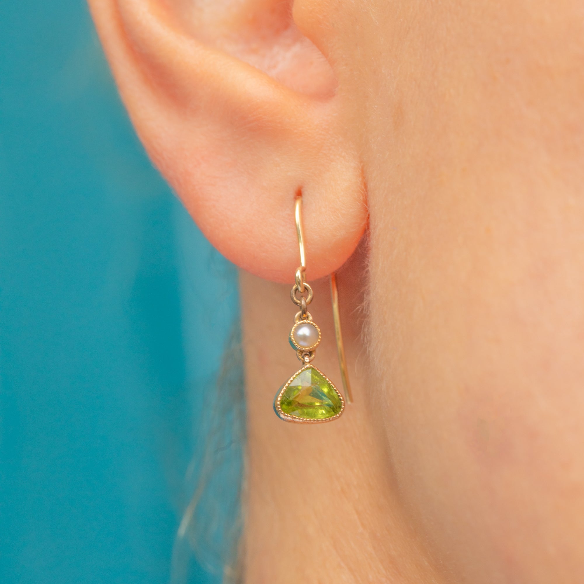 A dainty pair of antique drop earrings crafted in 9ct Gold, each set with a fresh green Peridot and creamy Pearl. The delicate design combines colour and luminosity, capturing the lightness and femininity characteristic of the Edwardian era.