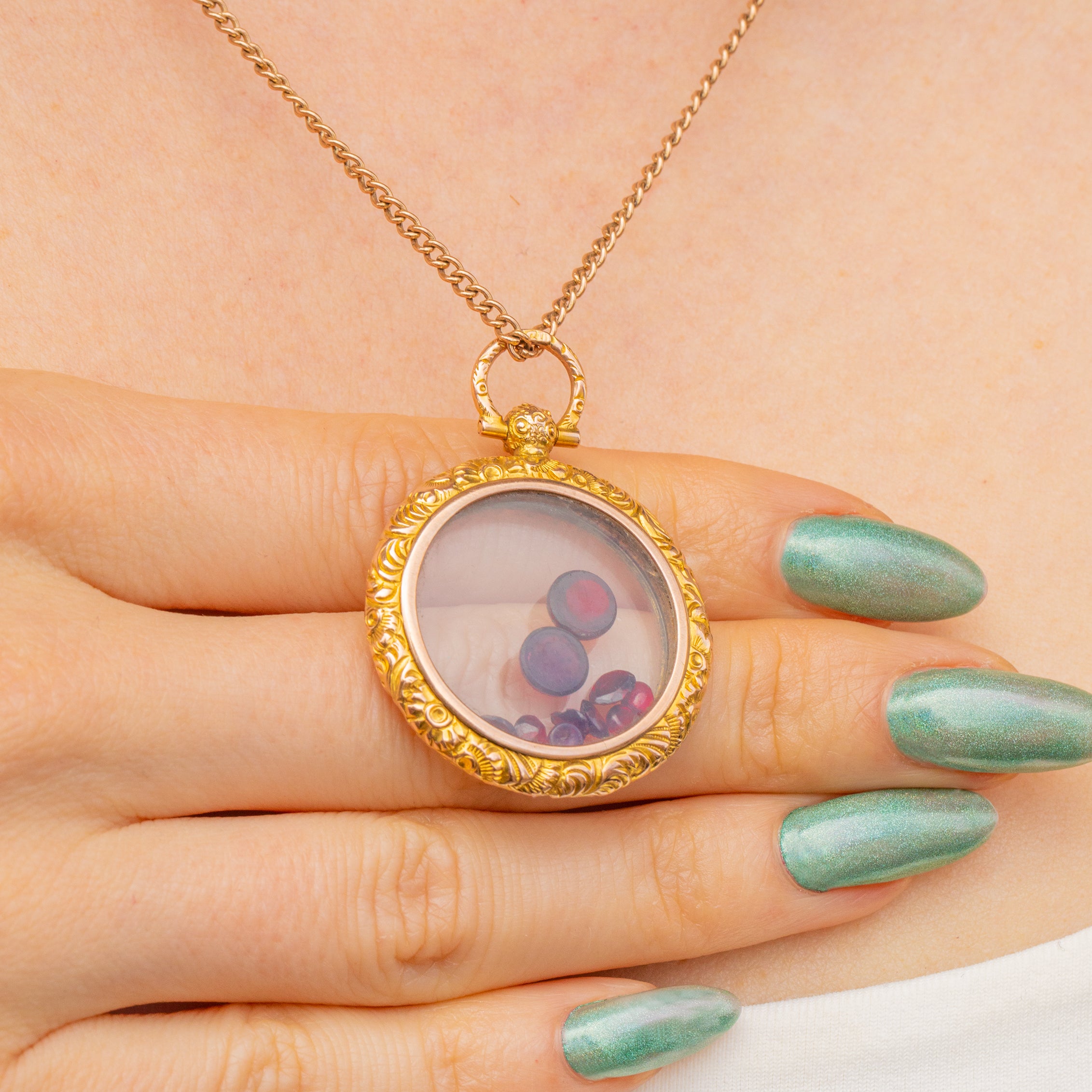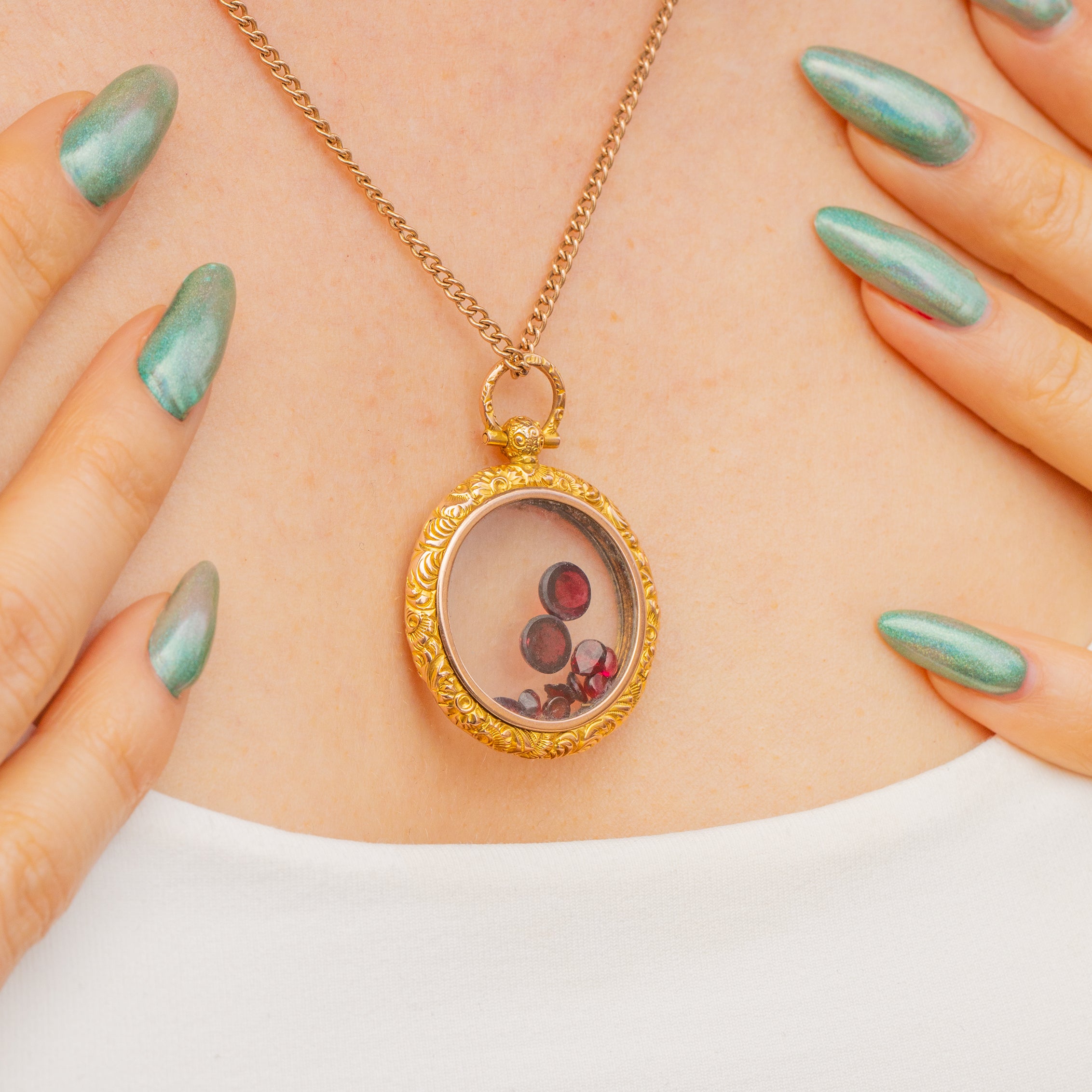 Exquisitely crafted in solid 9ct Gold, this antique locket boasts intricate repoussé details that catch the light beautifully as she adorns your décolletage. With a generous helping of Garnets displayed within glass panes, this Edwardian shaker locket is the perfect standalone piece!