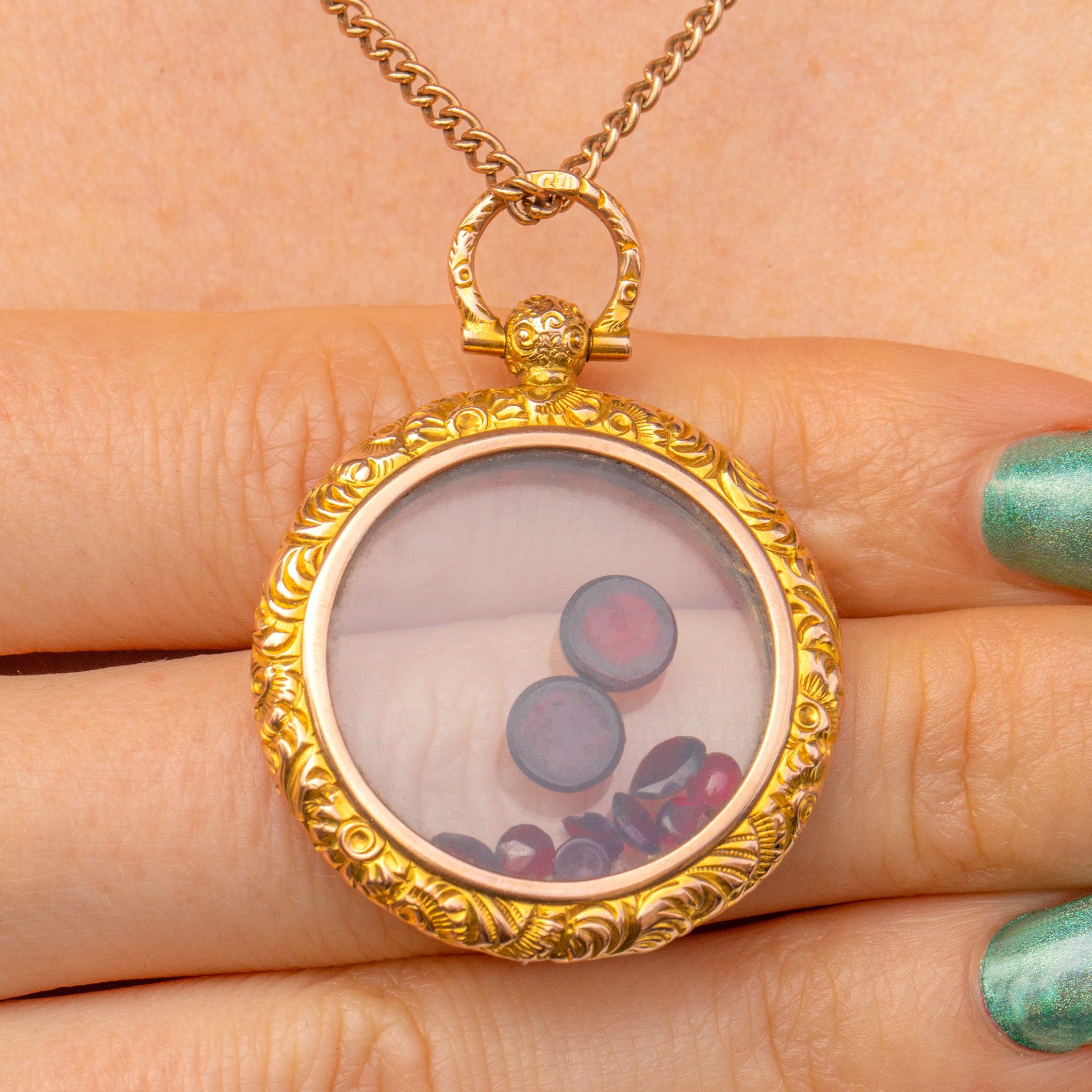 EXCELLENT. This Edwardian 9ct Gold repoussé shaker locket is in excellent condition! The Gold is saturated throughout and the repoussé details have all remained crisp and free from wear. The glass panes are clear and free from scratches or scuffs, securely held in place with no movement holding the Garnets safely inside. It is rare to find a shaker locket in such remarkable condition, so don't hesitate to make this superb piece of Edwardian jewellery yours!