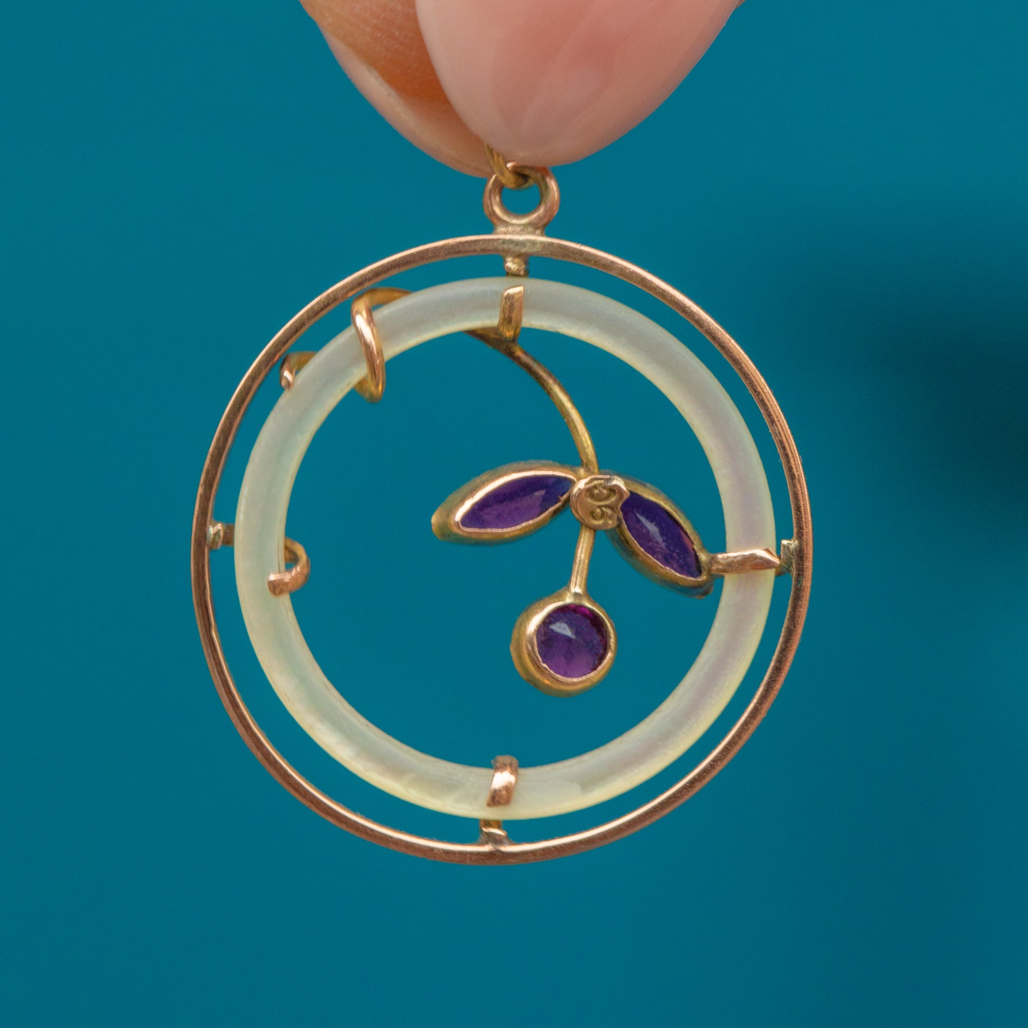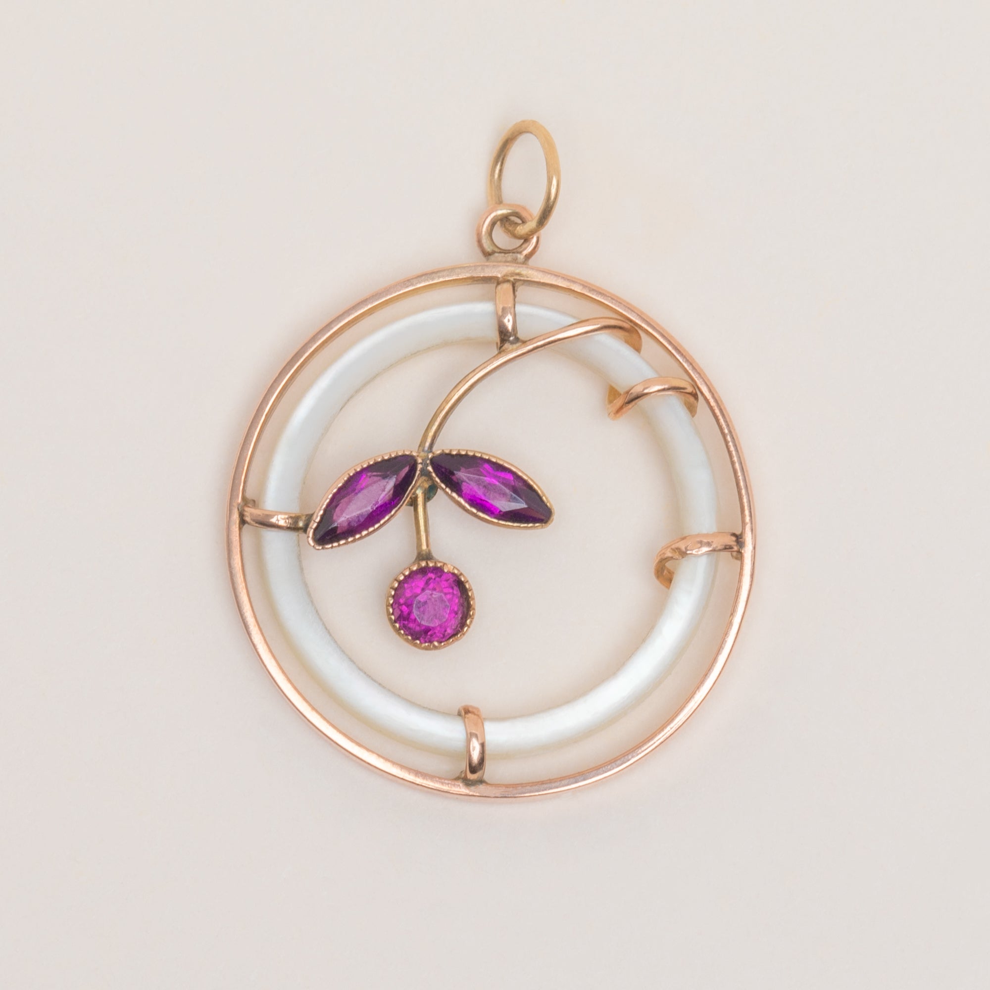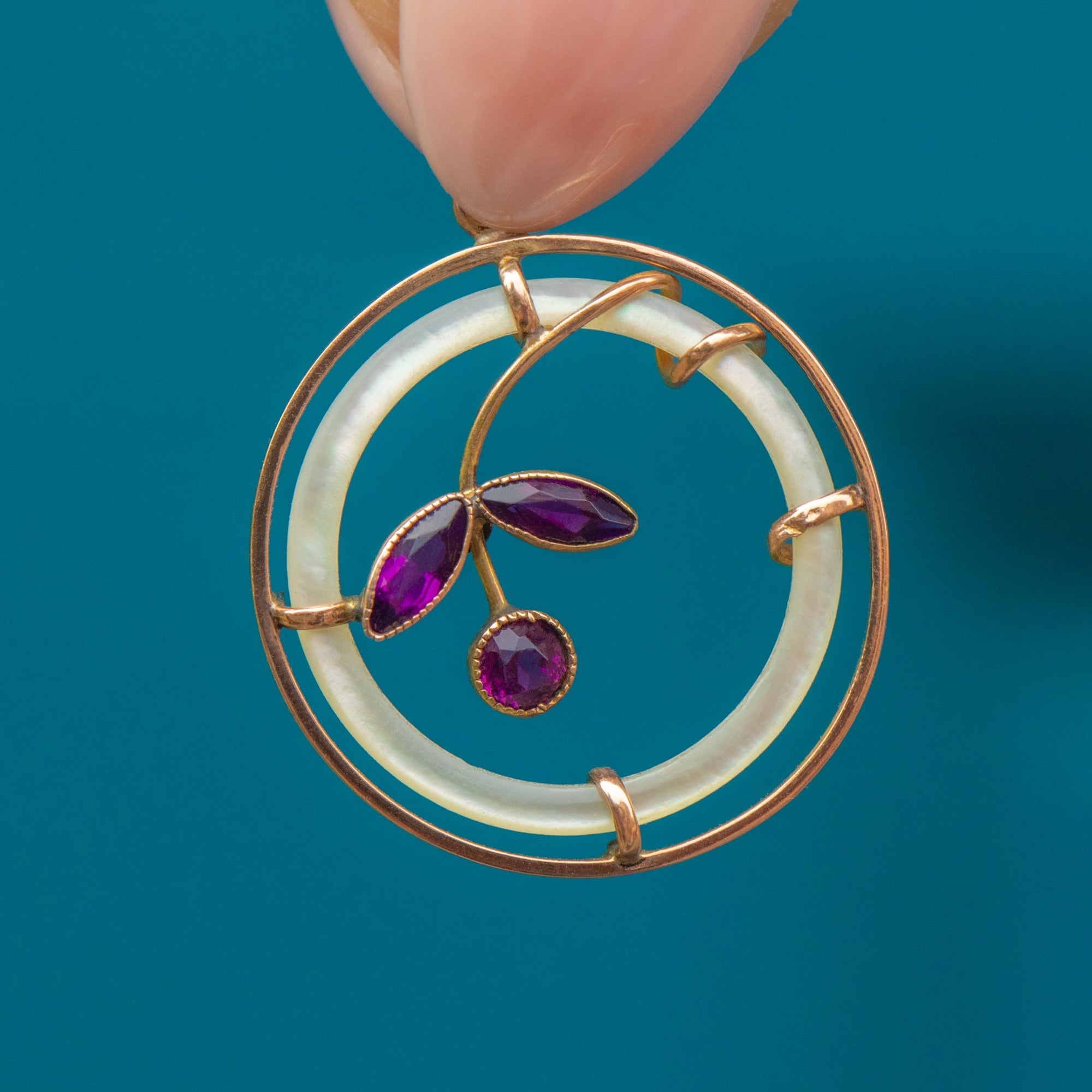 This Edwardian 9ct Gold Mother of Pearl flower pendant features a central circle of iridescent mother of Pearl, framing a delicate, regal purple Paste flower set in a rich 9ct Gold. The intricate golden flower motif arches inside the mother of Pearl like a graceful vine, creating a harmonious blend of elegance and artistry.
