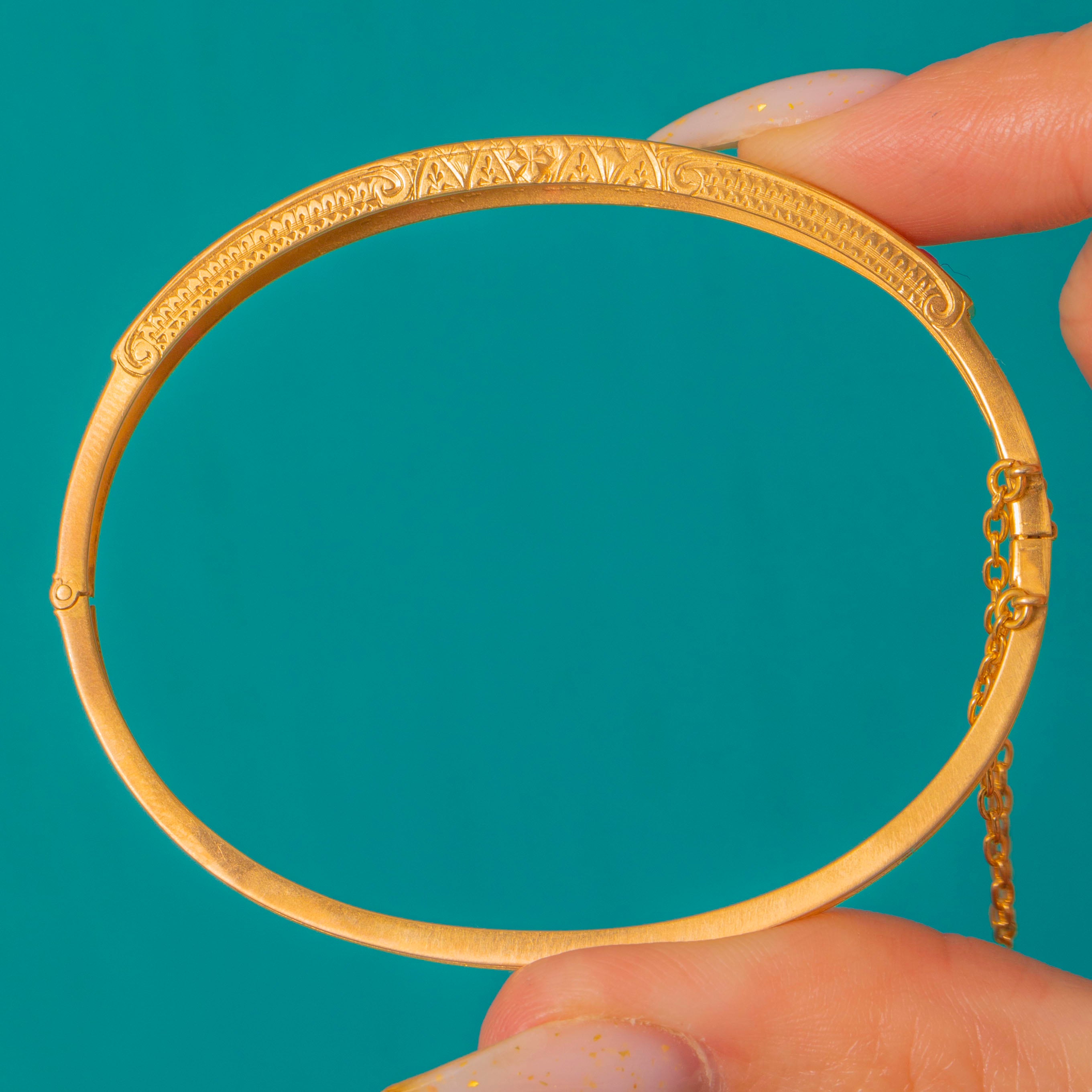 The bangle is finished in buttery bright yellow Gold with fine foliate and starburst engravings; an ornate, romantic design that sits elegantly on the wrist.