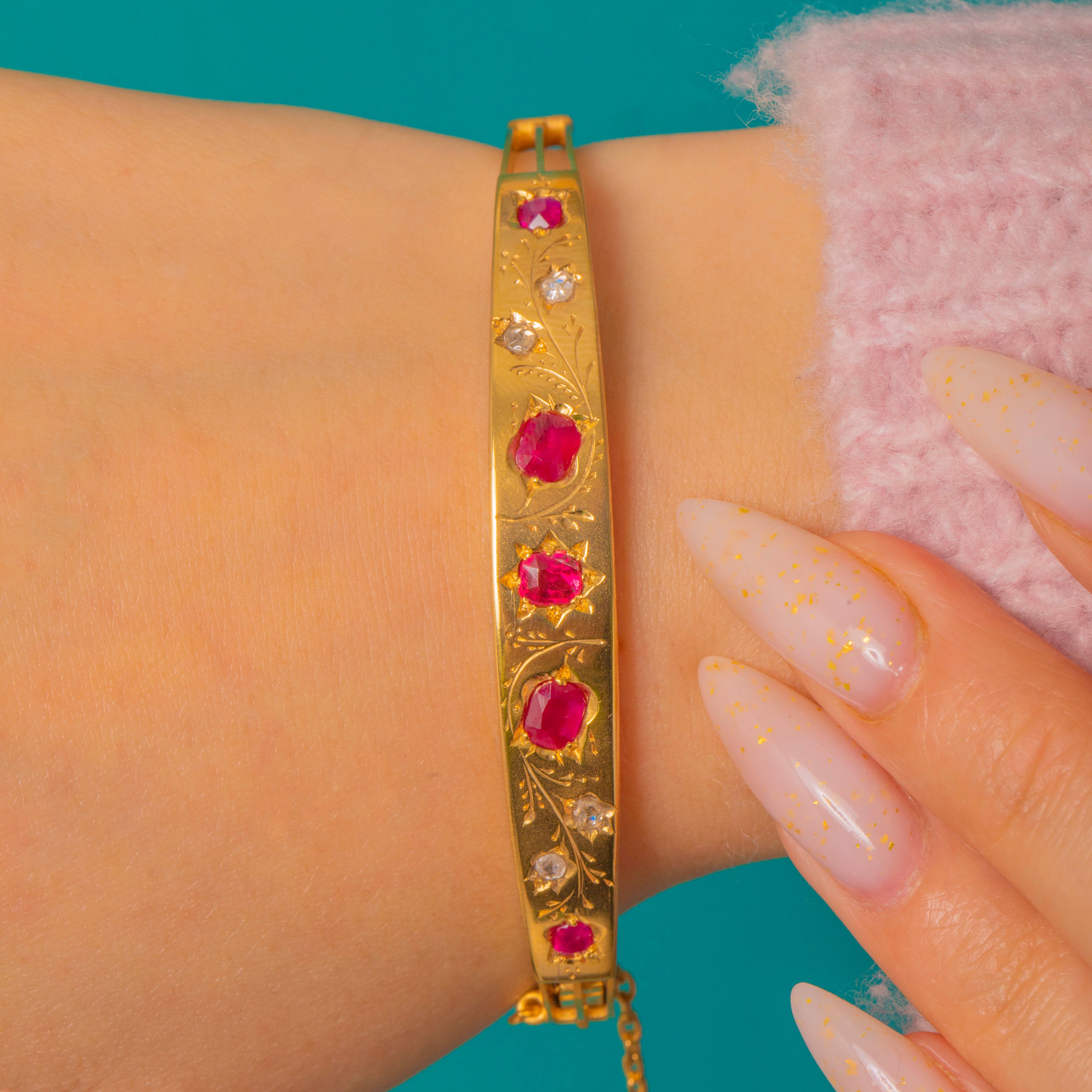 A delicately engraved solid Gold Edwardian hinged bangle set with a graduated row of deep pink–red Rubies, alternating with small colourless diamonds and centred with a Garnet.