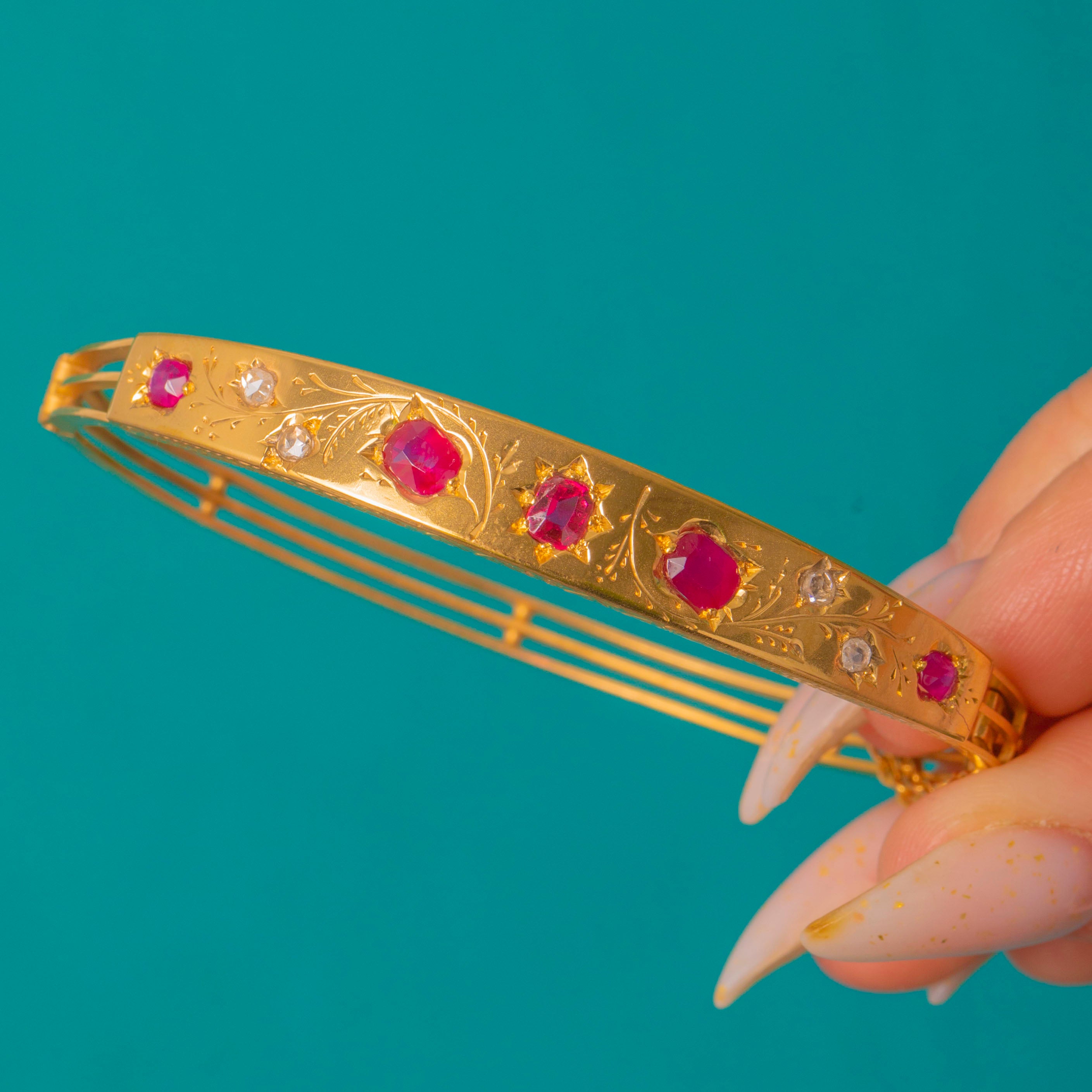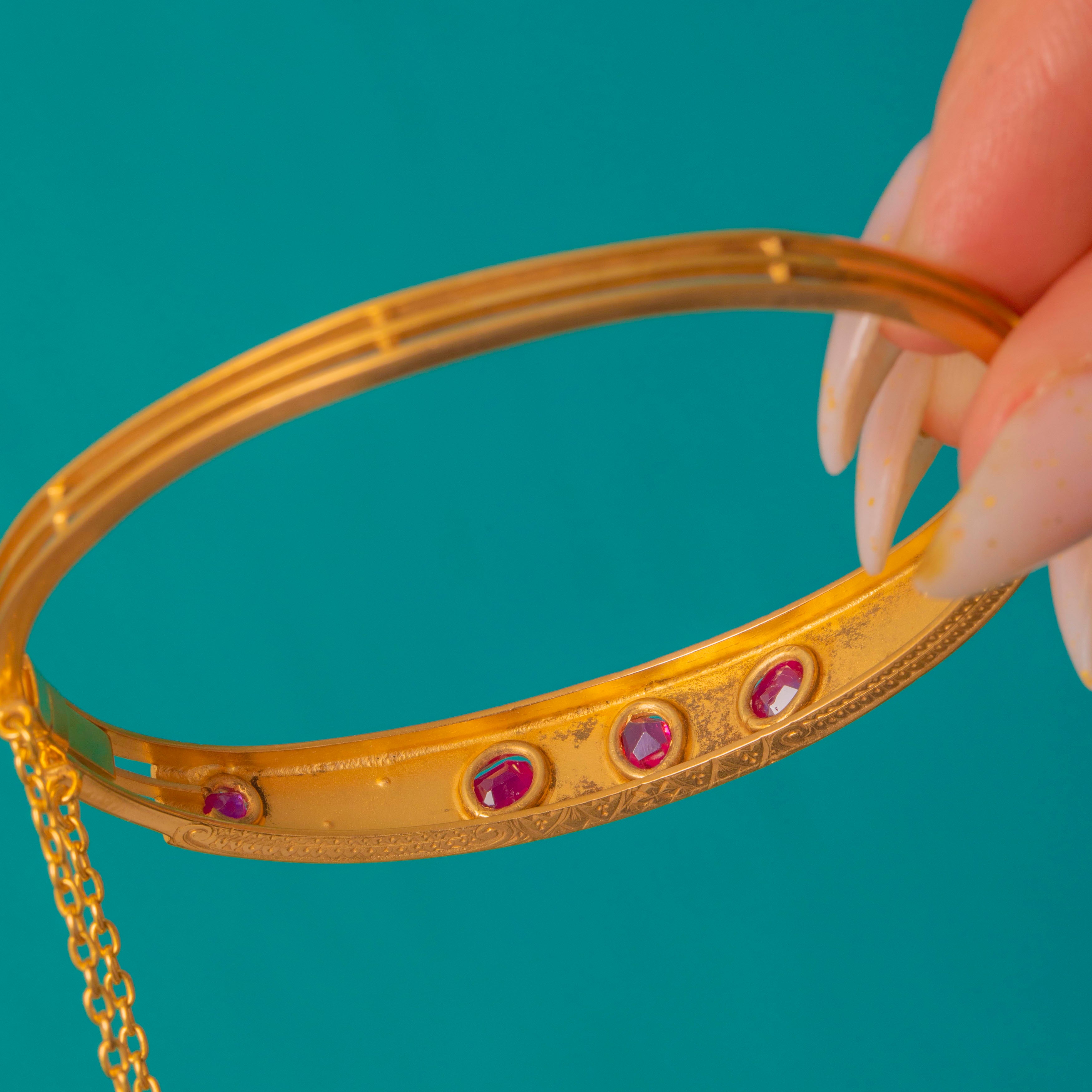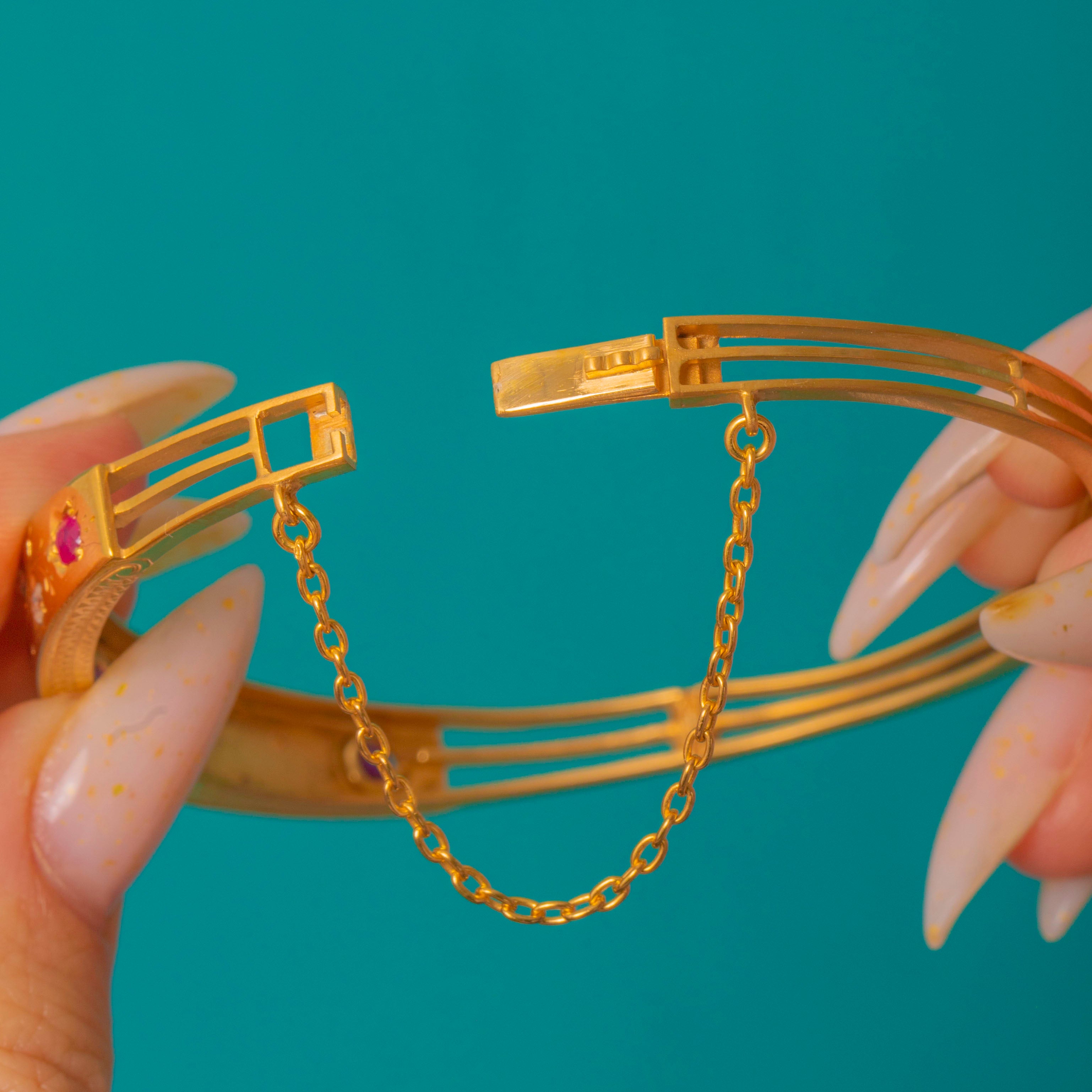 VERY GOOD: The rubies, diamonds and replacement central garnet are intact and appear securely seated with minimal facet wear. The bangle shows light surface scratches and mild patina in engraved recesses consistent with gentle wear; the hinge, box clasp and safety chain are functional with no visible repairs. No resizing or restoration marks are evident.