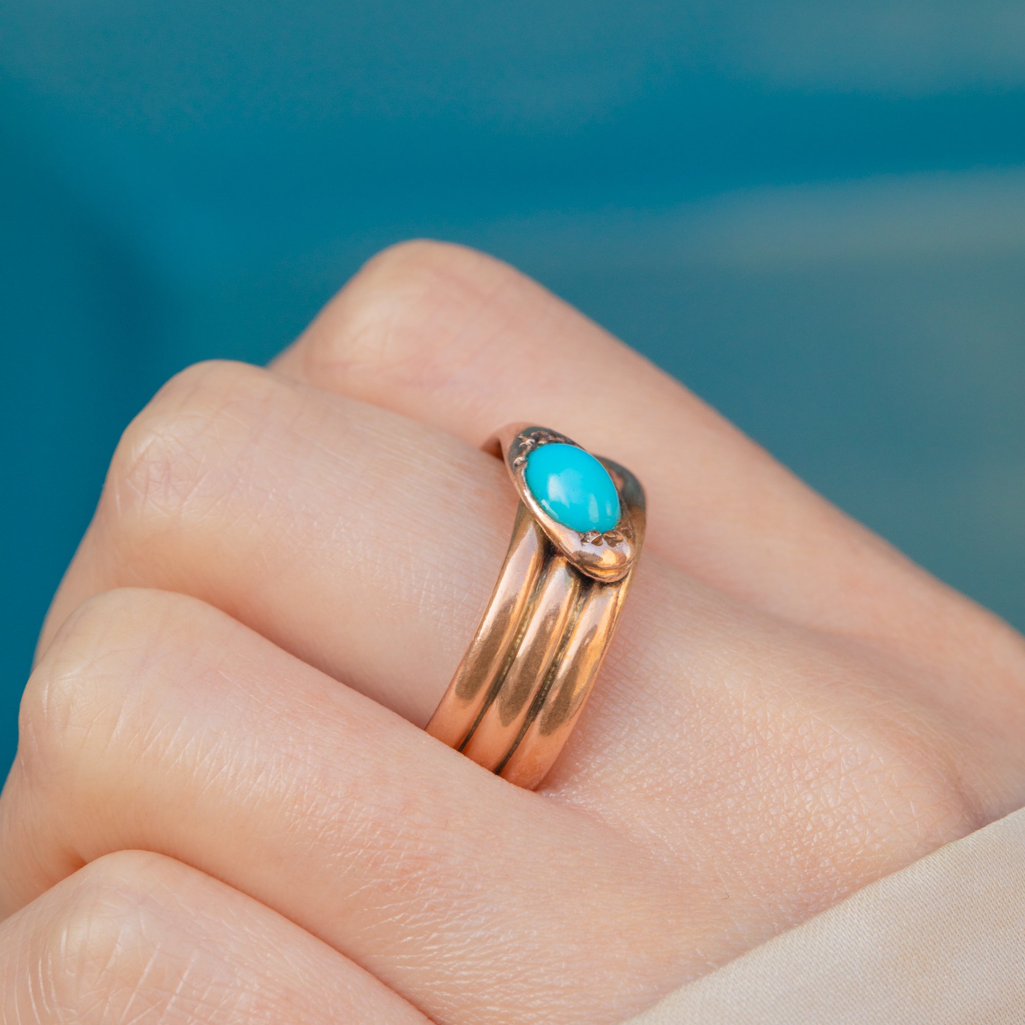 VERY GOOD: This Edwardian 9ct Gold Turquoise snake ring is in very good condition. The ring band has held its form well over the years and the Gold has a gorgeous rosy hue. The Gold shows some minor age-related wear throughout, which is to be expected from a piece of such great age. The Turquoise is smooth and securely set and the hallmarks are fully legible, allowing us to accurately date this Edwardian snake ring to 1902!