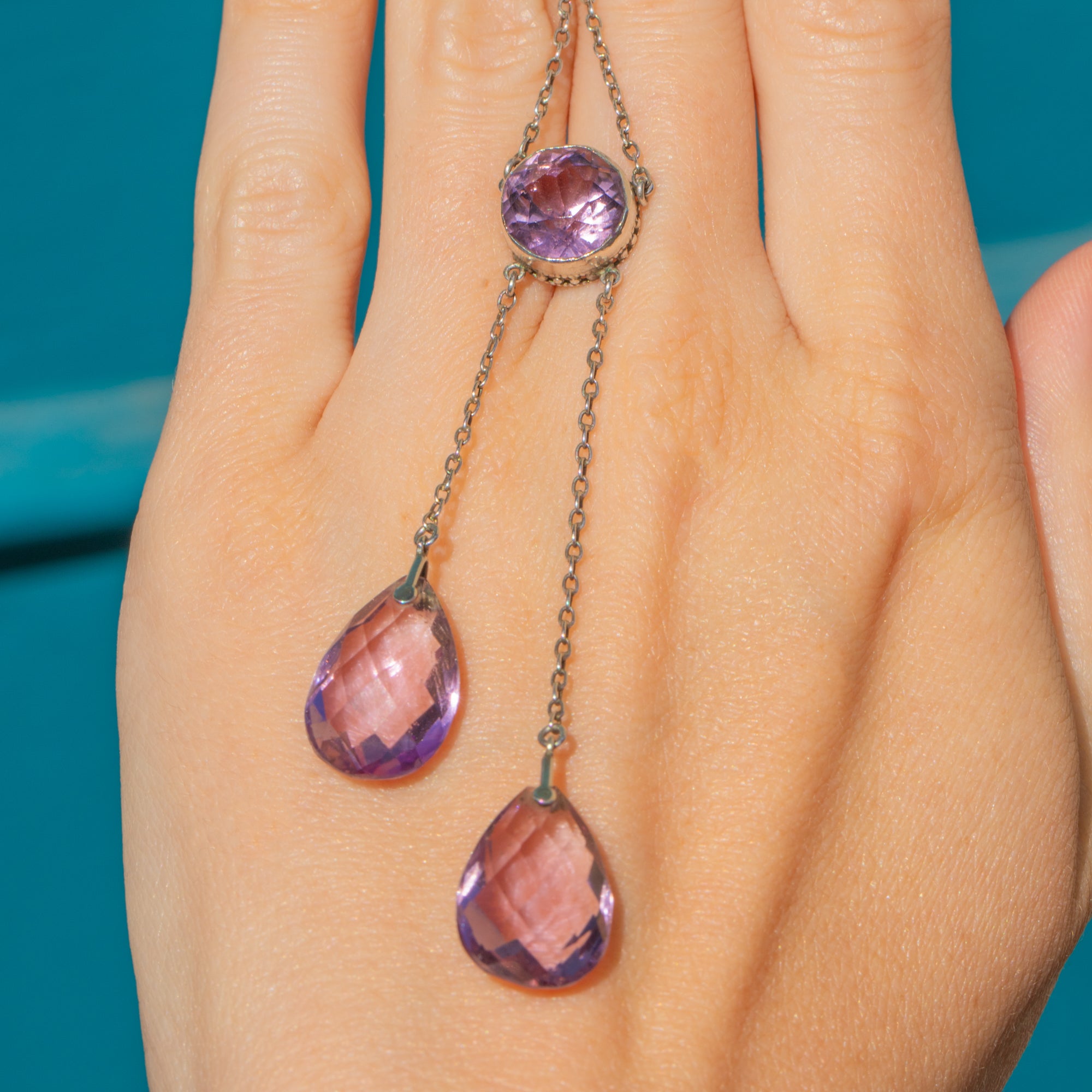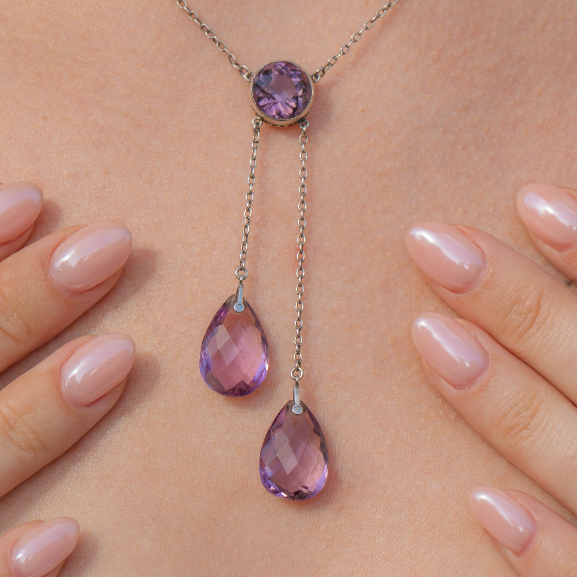 VERY GOOD. This Edwardian Silver Amethyst negligee necklace is in very good condition. Each Amethyst is securely connected to the main body of the necklace and have a uniform hue throughout. To the culet of the central Amethyst there is a small amount of surface wear, but this cannot be seen when worn. With a nice and sturdy chain, he negligee design remains the centre of attention, secured around your neck by the fully functioning bolt ring.