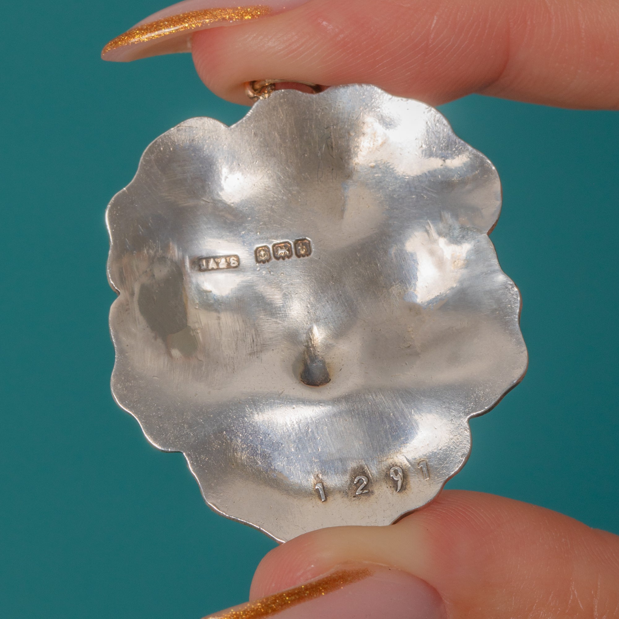 This exquisite Edwardian pendant captures the natural beauty of a pansy in radiant Guilloché Enamel. Crafted in Sterling Silver, its petals shimmer in shades of blue with delicate yellow and black detailing at the centre, beautifully showcasing the artistry of early 20th-century enamelling. The level of craftsmanship is outstanding—each fine vein of the petal is visible beneath the translucent Enamel, bringing it to life.