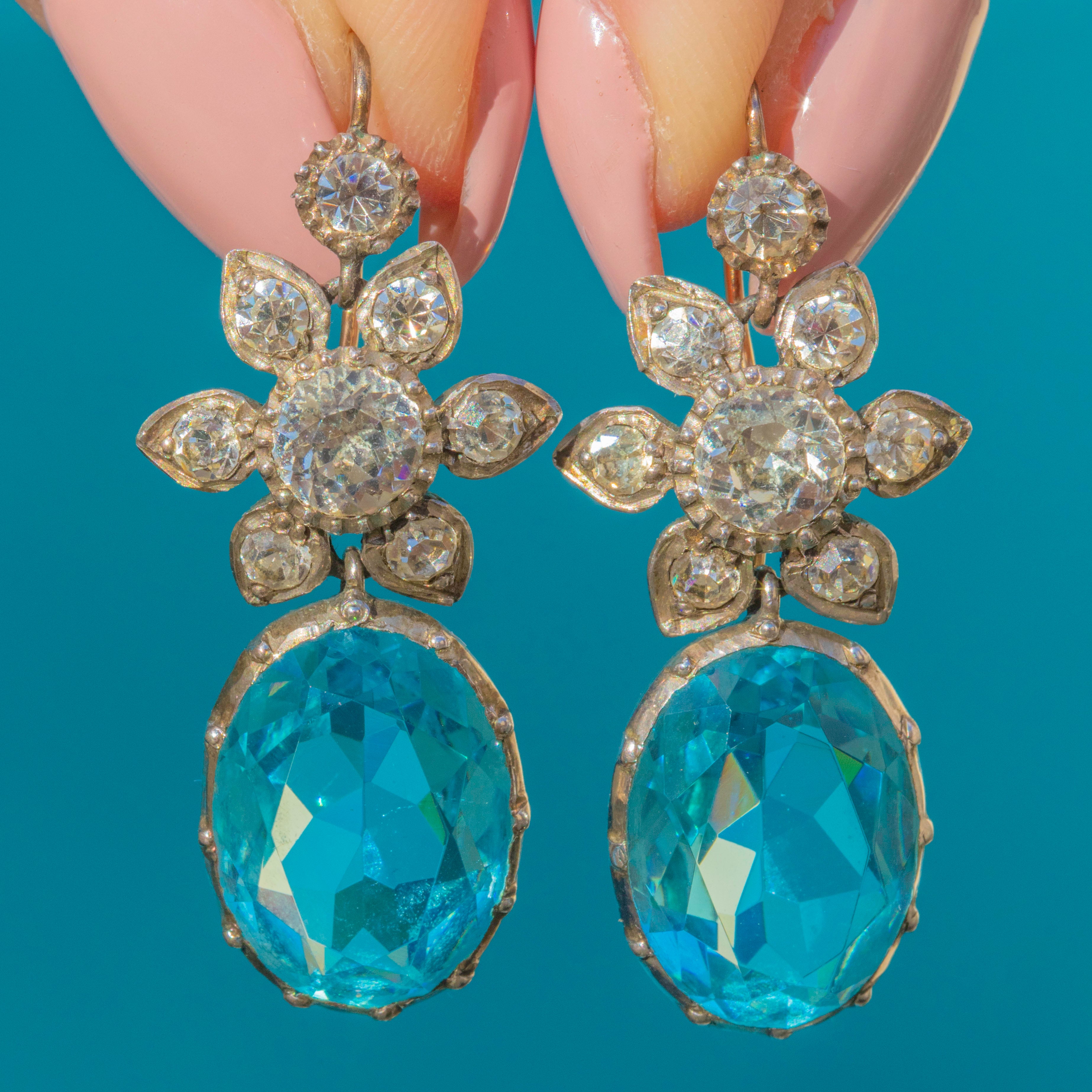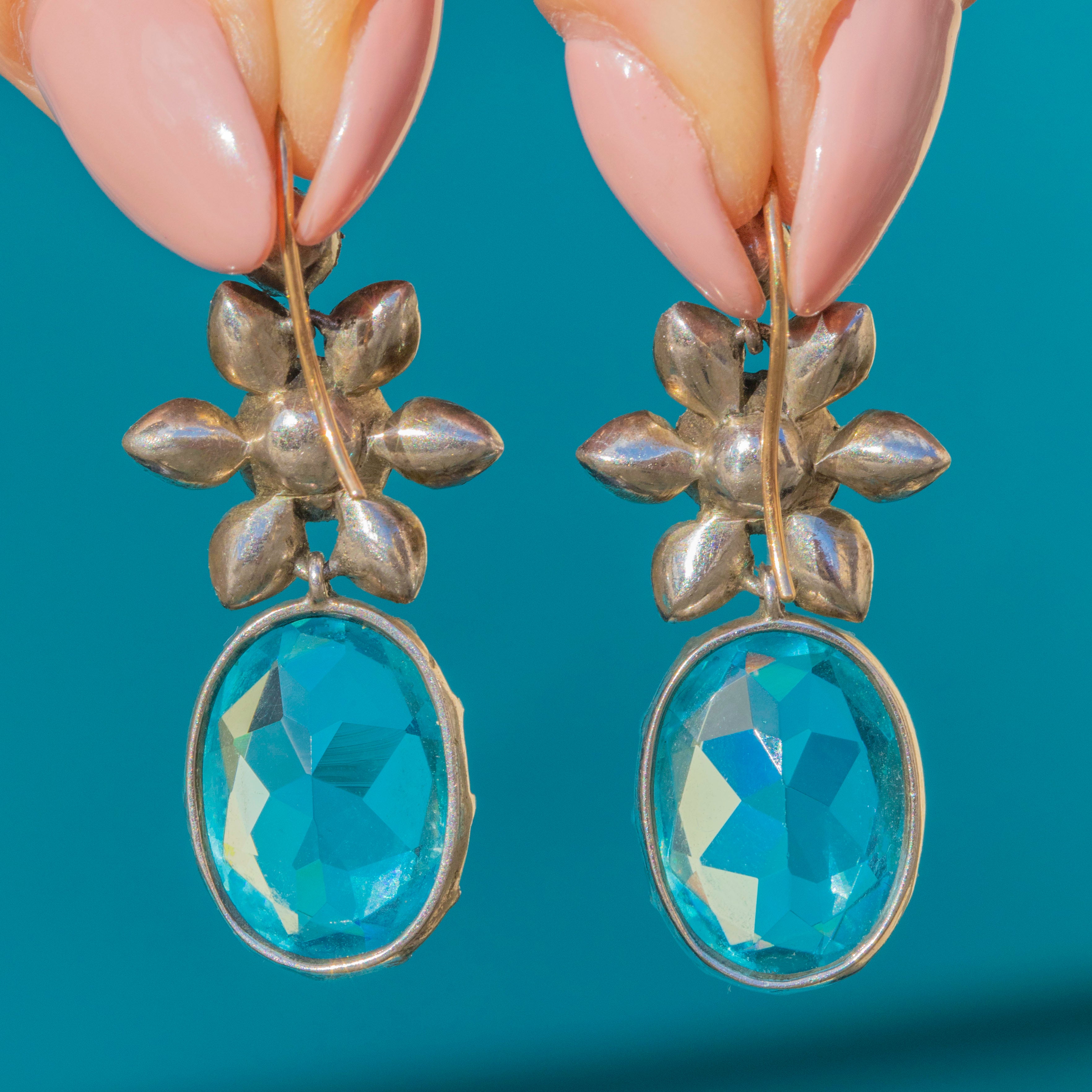 VERY GOOD. These Edwardian Blue Paste flower drop earrings are in very good condition. The Paste stones are bright and luminous, with gorgeous facets that dazzle in the light. Beautifully crafted, these earrings have a lovely swing and are set securely. There are some minor signs of wear to the Silver commensurate with age, however, this does not detract from her beauty and is not noticeable during wear. These antique Paste earrings are a must-have!