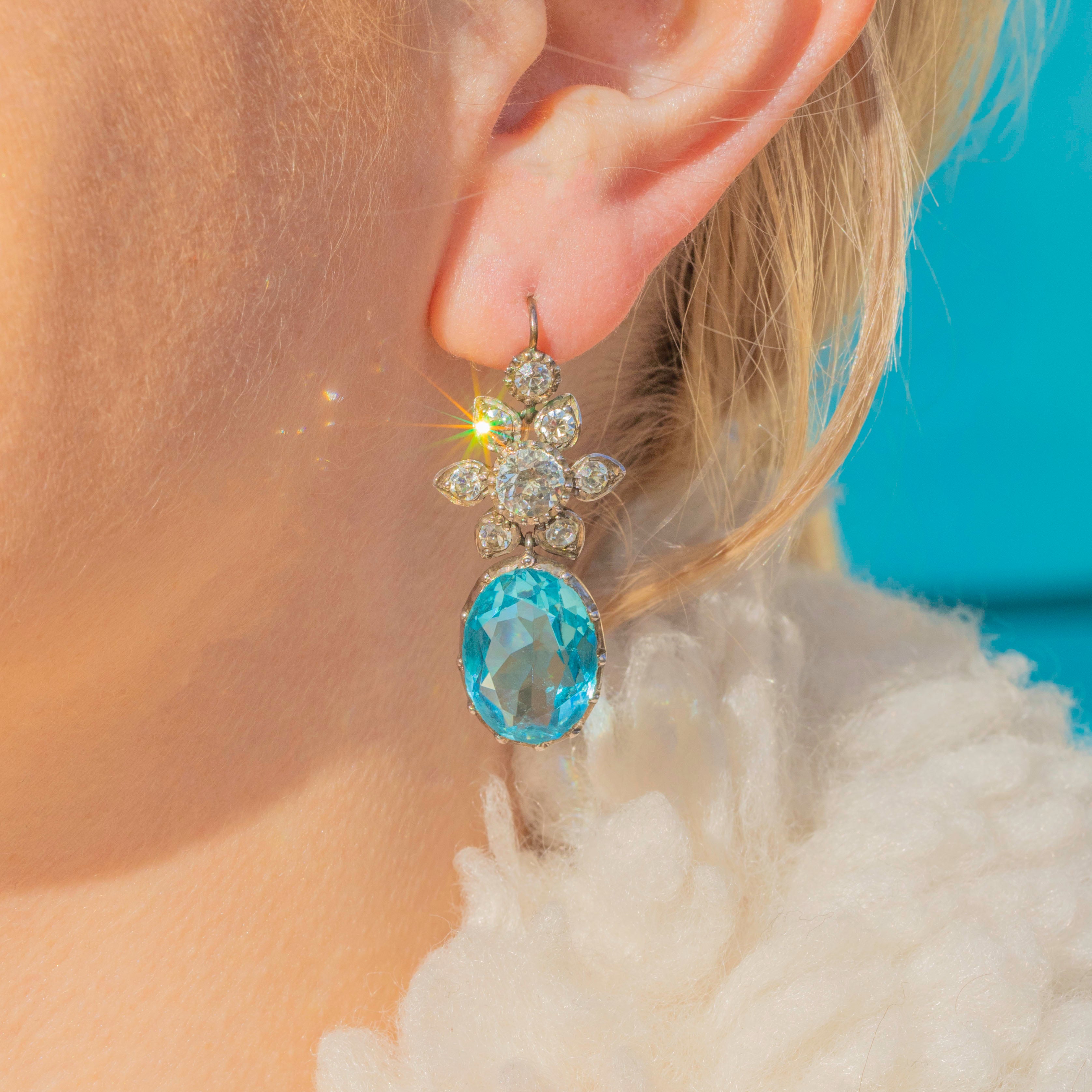 These Edwardian earrings are crafted from Silver and set with remarkably bright antique Blue and White Paste, with a bold floral design. With a gorgeous swing, these antique earrings dance from your lobes and are the perfect statement piece to add to your collection.