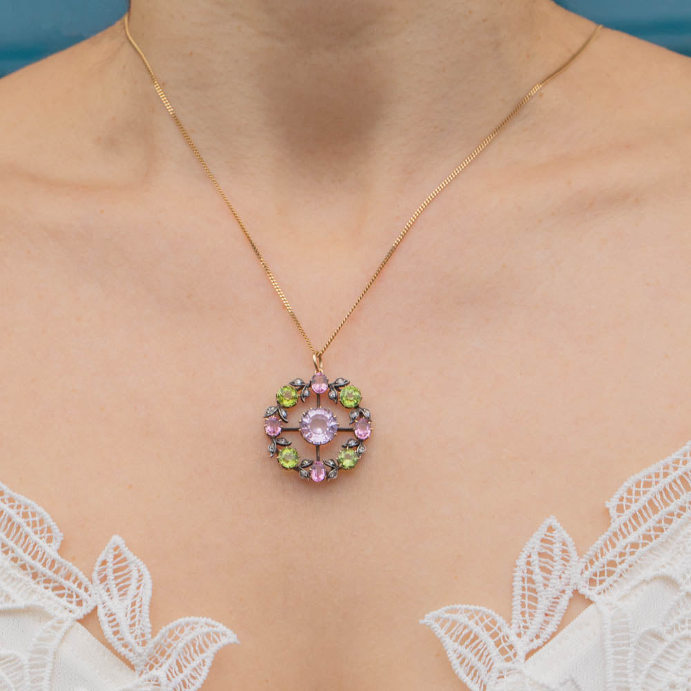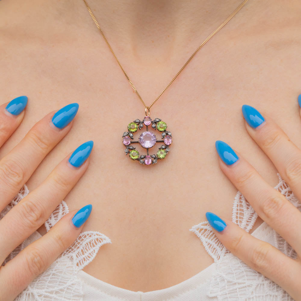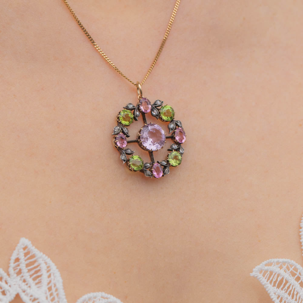 Featuring an elegant combination of pastel gemstones, this pendant exudes delicate sophistication and whimsical charm. In her centre sits a stunning faceted pink Topaz, catching the light wonderfully and radiating beautiful soft blush hues. She is adorned by a halo of alternating pink Tourmaline and green Peridot, accented by twinkling Diamonds.