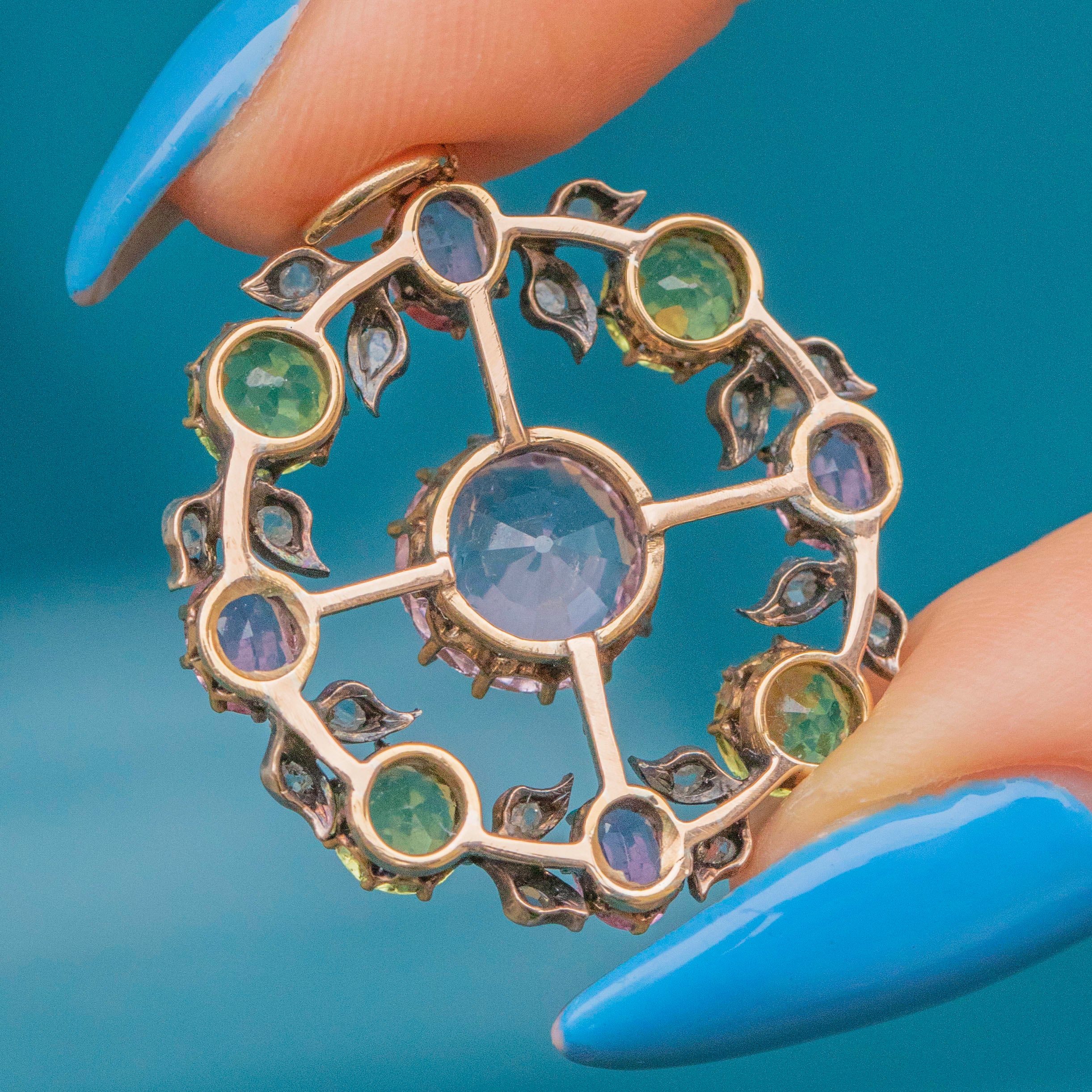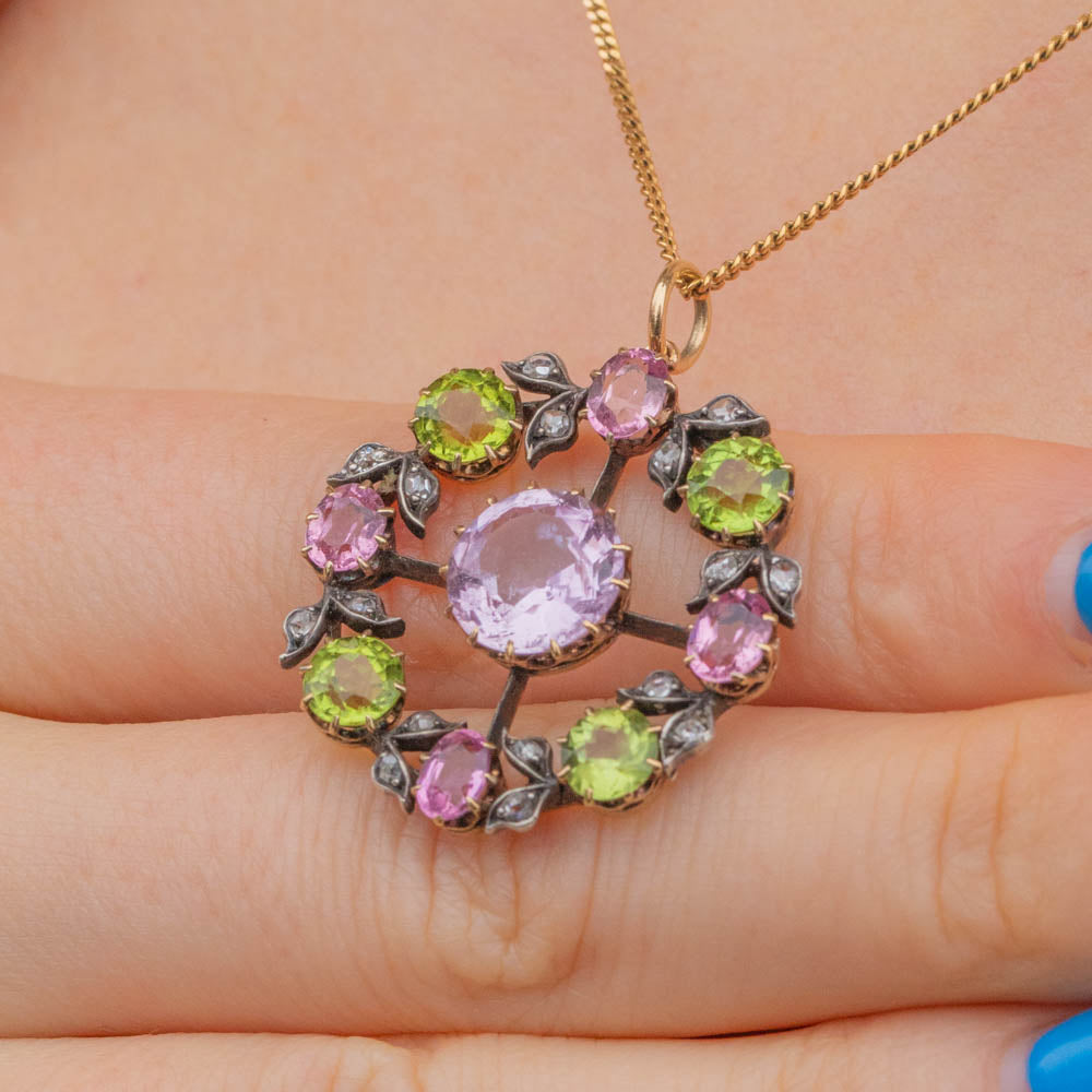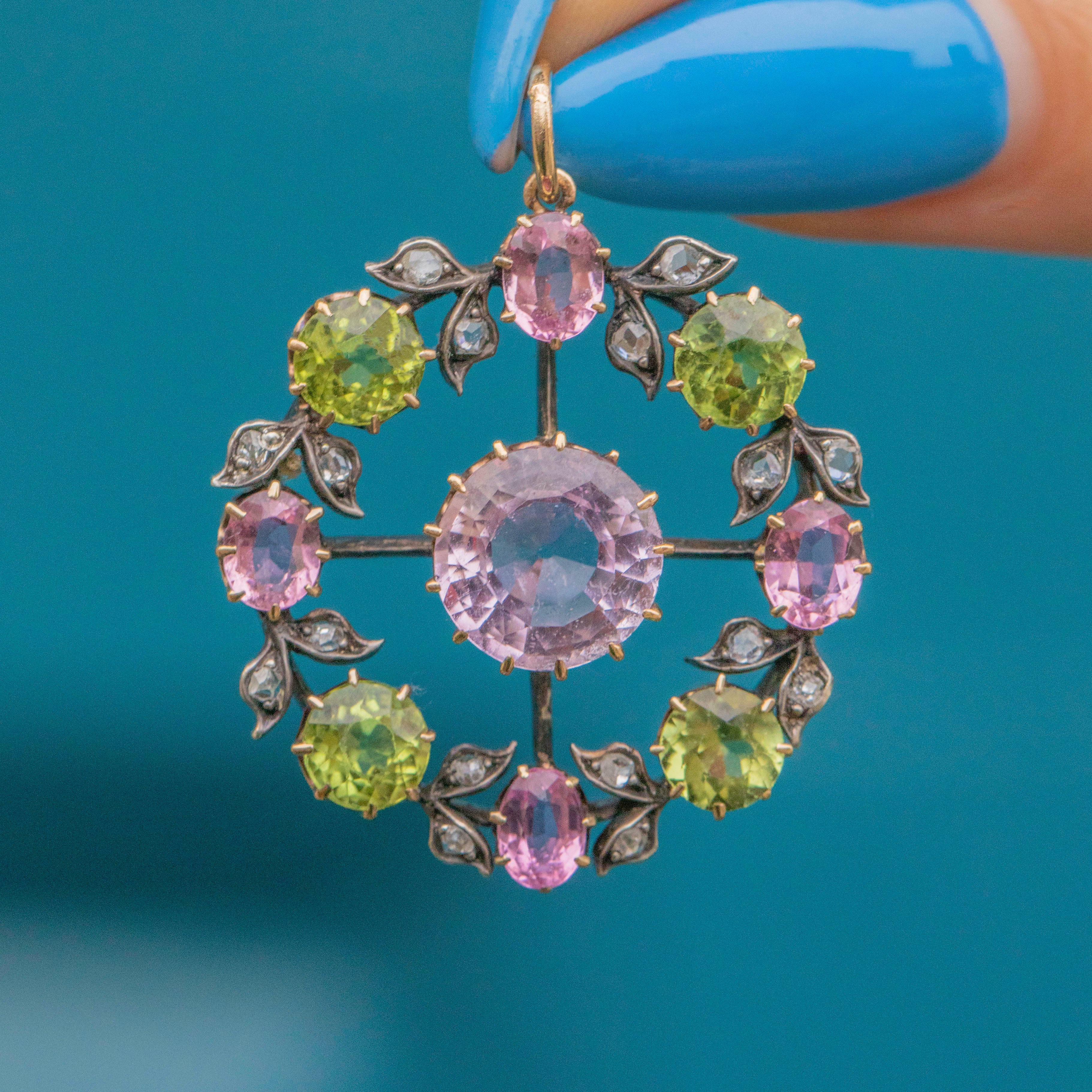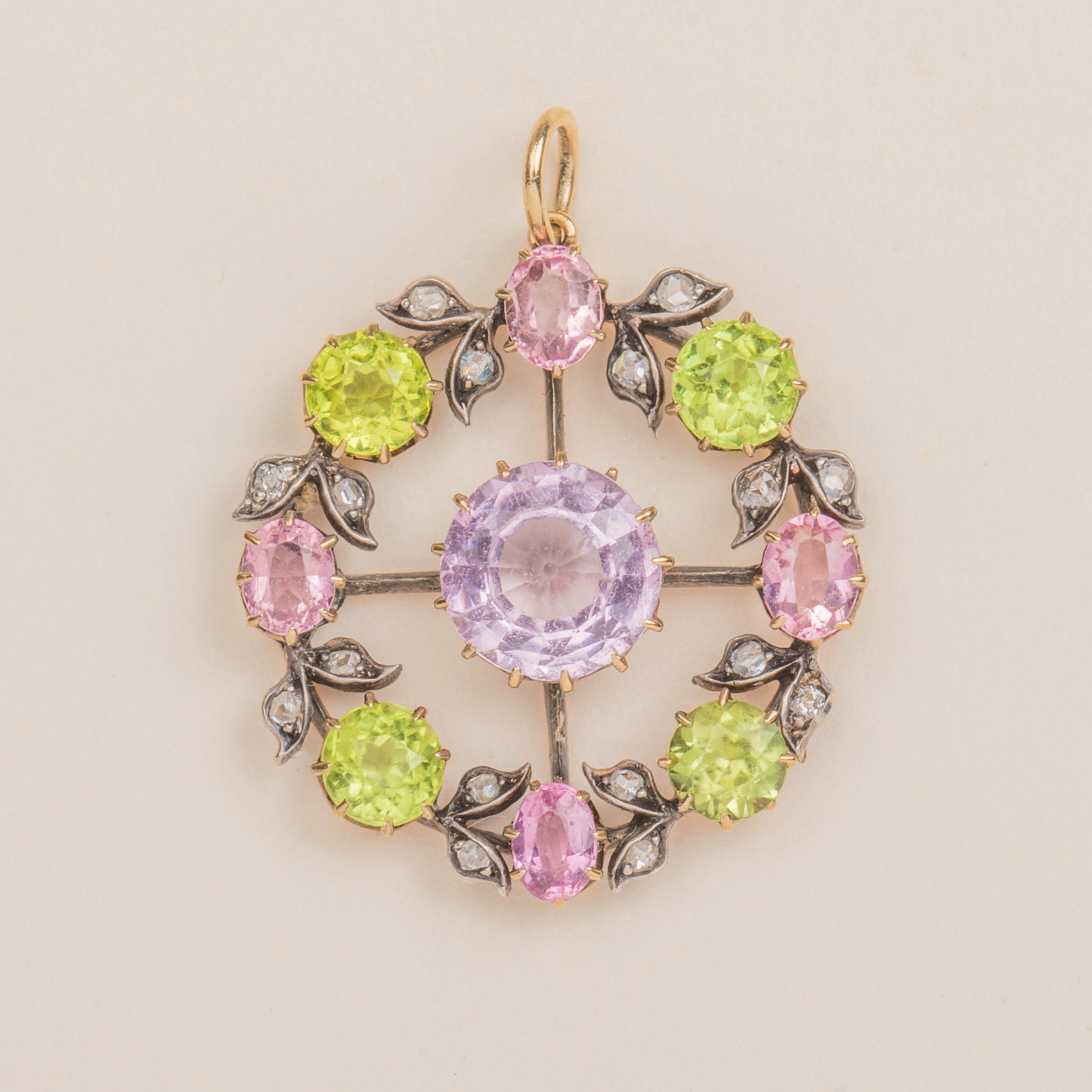 MATERIALS: Tests as Sterling Silver, backed with 9ct Gold, centre Pink Topaz, Pink Tourmaline, Peridot, Diamonds.