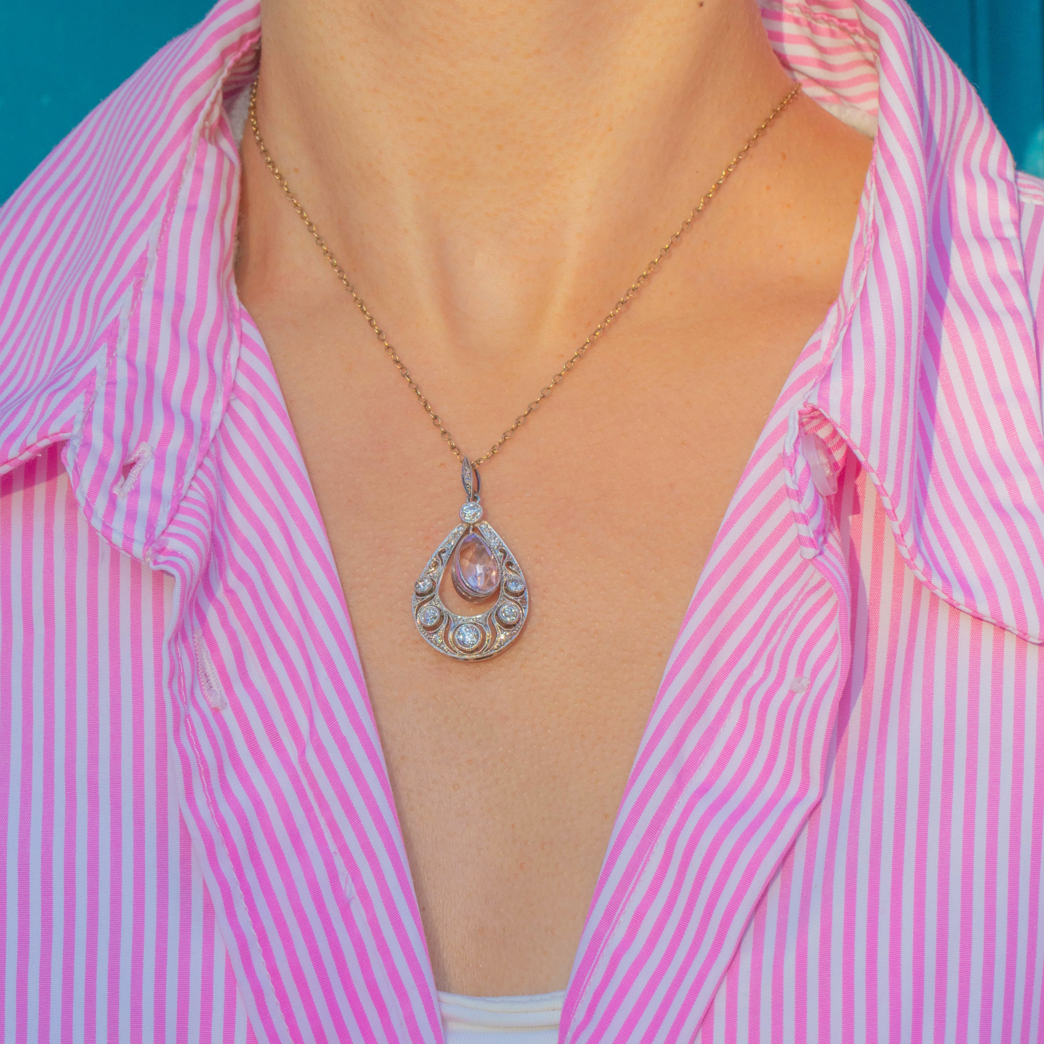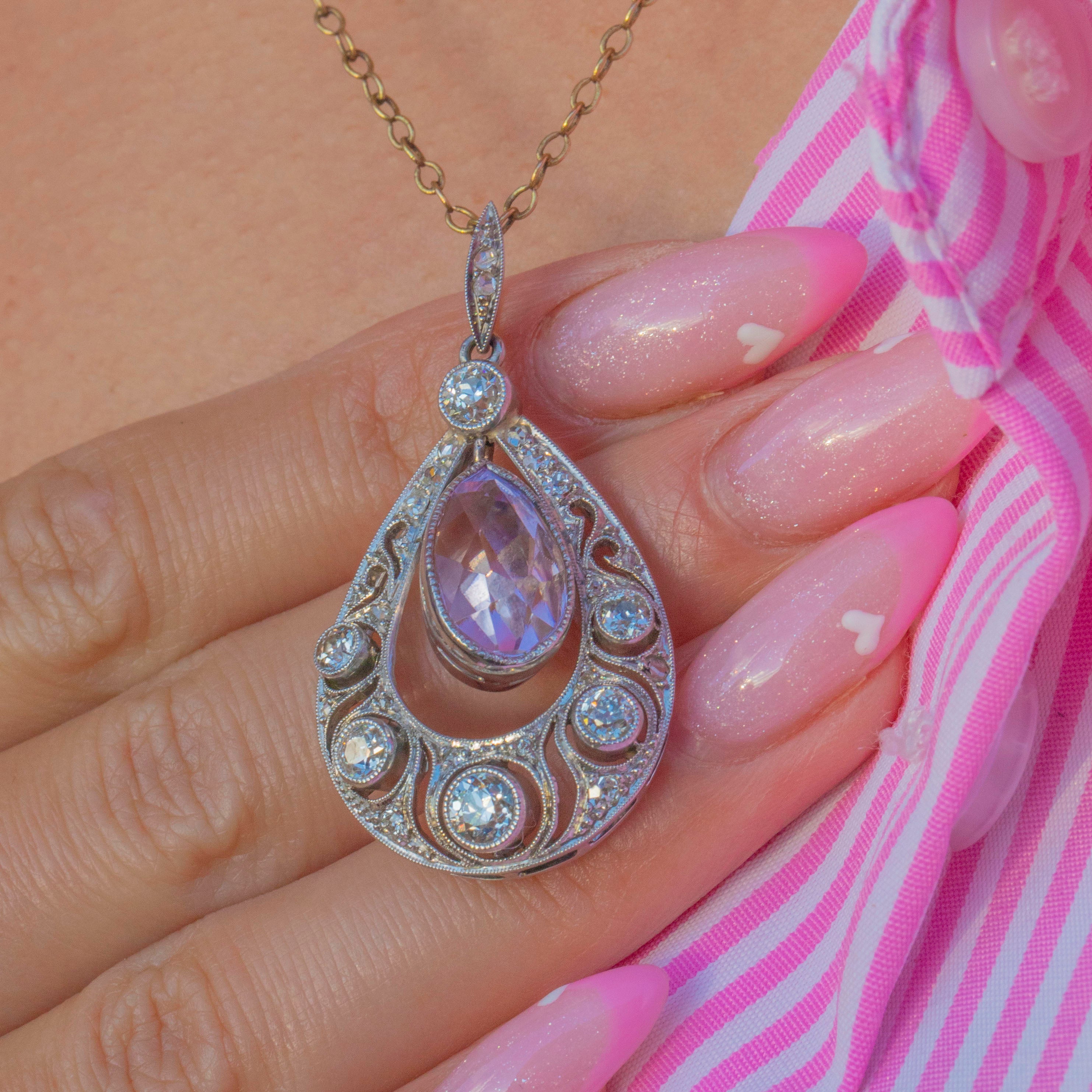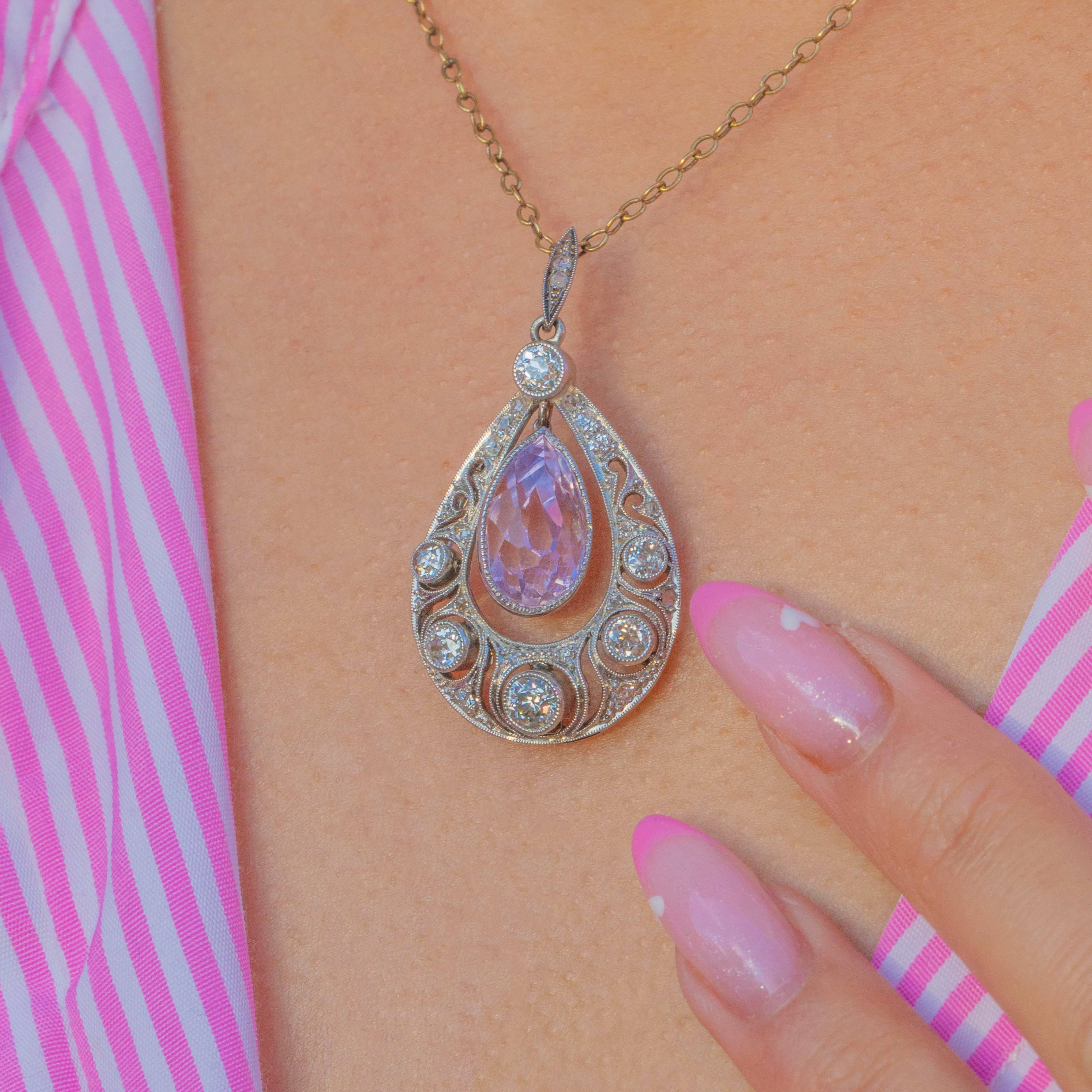An exceptional Edwardian pendant of rare elegance, this jewel showcases a beautiful 5.50ct natural Pink Kunzite framed by a shimmering openwork design of Platinum and 18ct White Gold. Set throughout with 1.25cts of Old European, Old Mine and Rose Cut Diamonds, the millegrain detailing adds texture and brilliance in true Edwardian style.