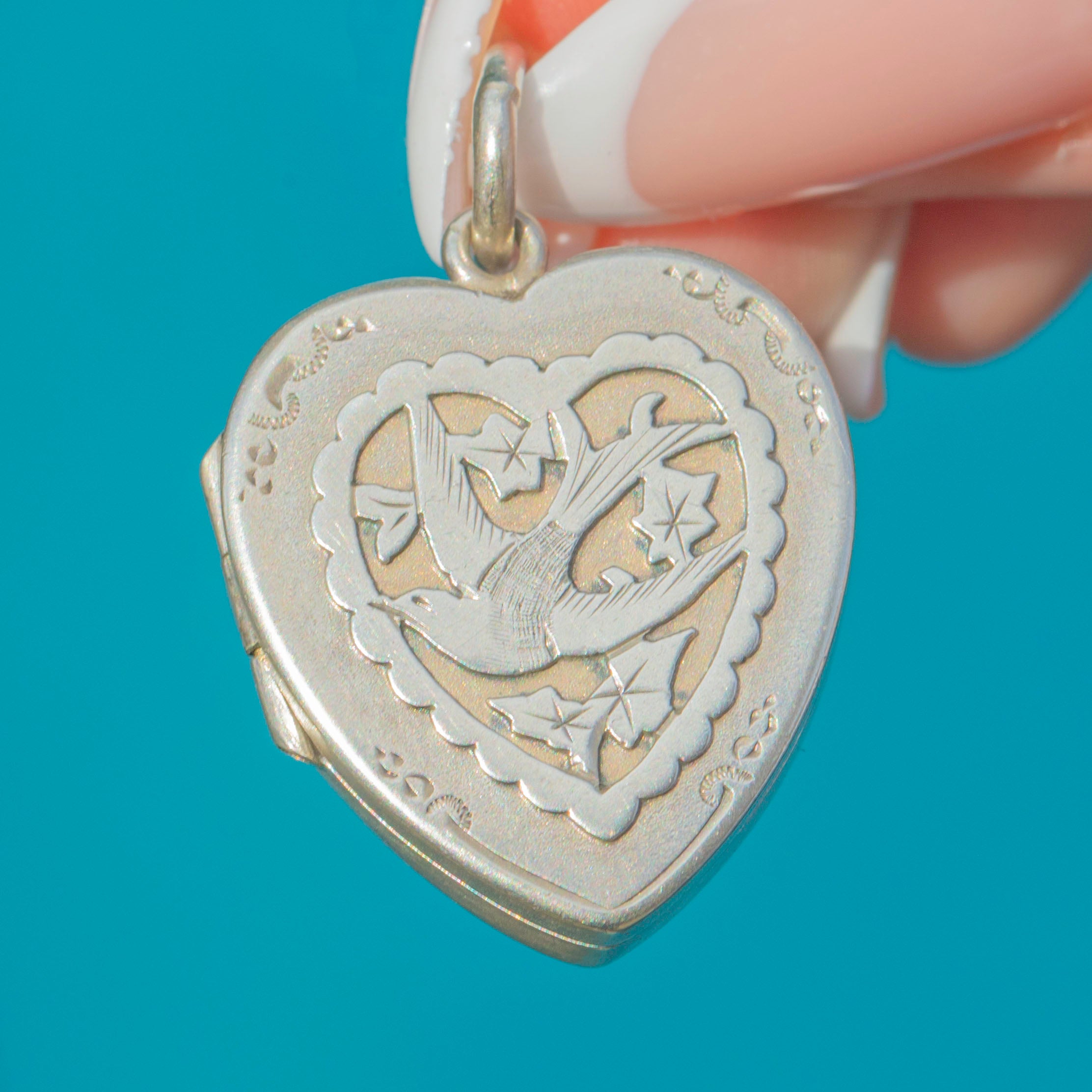 EXCELLENT: The locket closes securely and retains both internal frames. The engraved swallow and decorative border remain crisp with minimal surface wear. Silver has developed a soft antique patina, enhancing the charm of this romantic Edwardian jewel.