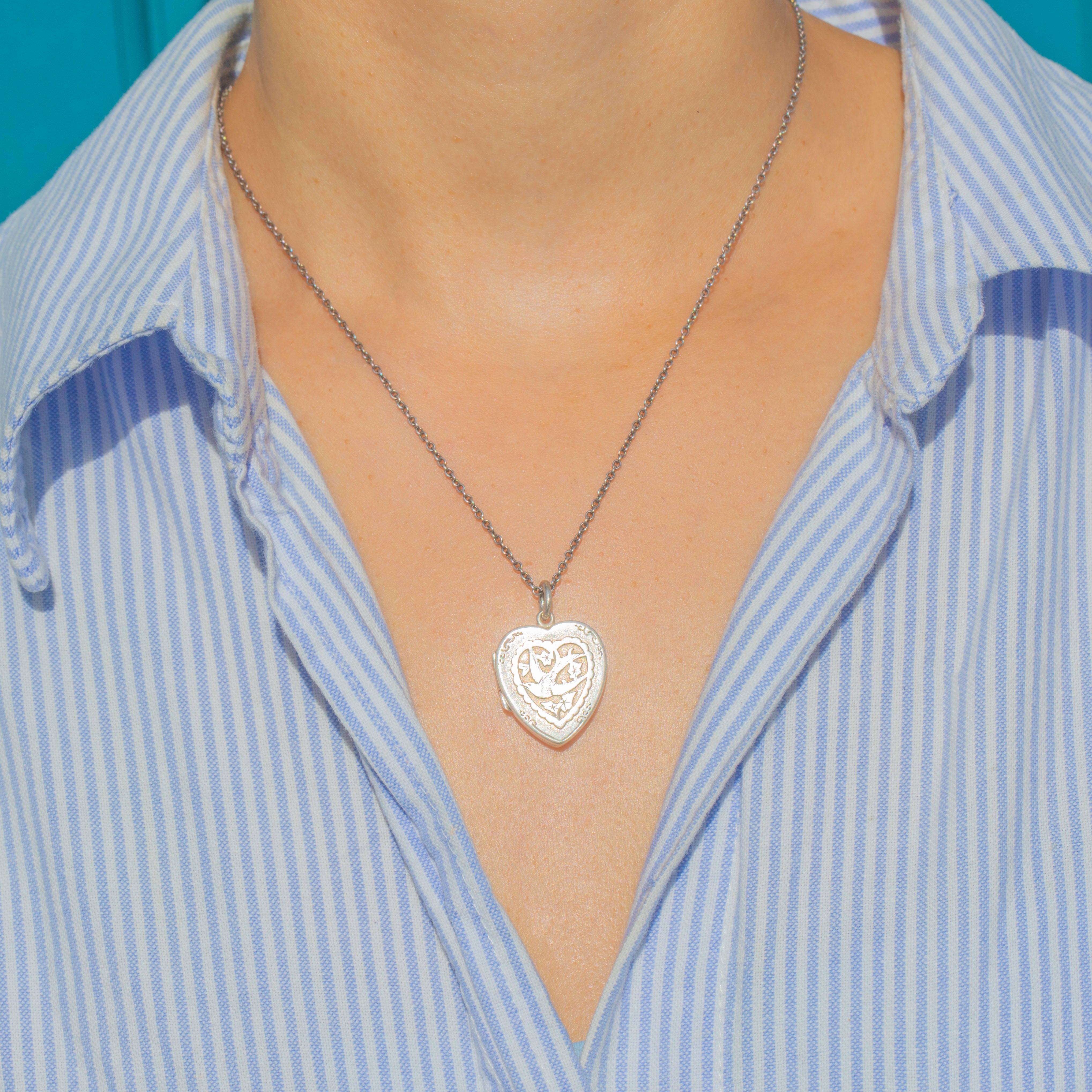 This Edwardian Silver heart locket is a beautiful example of early 20th-century sentimental jewellery. The front is engraved with a swallow in flight surrounded by stars and ivy leaves, framed by a scalloped border. Swallows were a popular motif of the era, symbolising safe return, love, and loyalty, making this locket both decorative and meaningful.