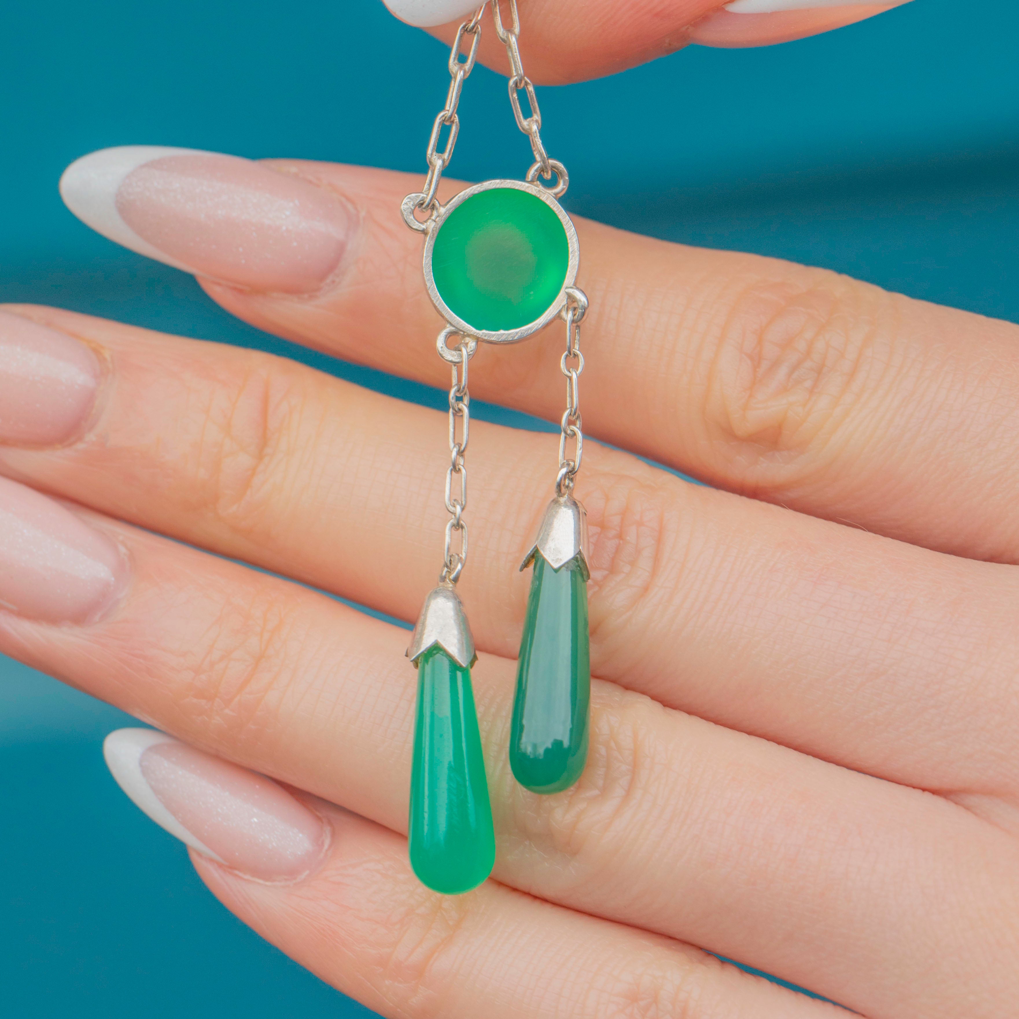 The high-domed Chrysoprase cabochon elegantly suspends two Chrysoprase torpedo drops in a classic negligee design, providing lovely movement and creating a striking silhouette that glows in the light!