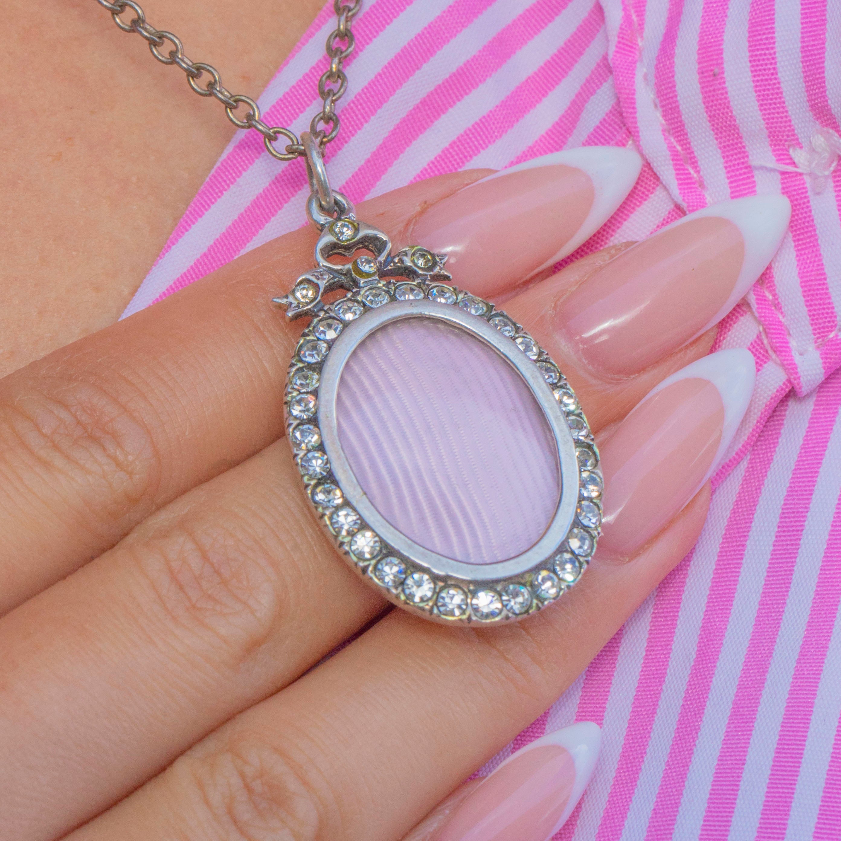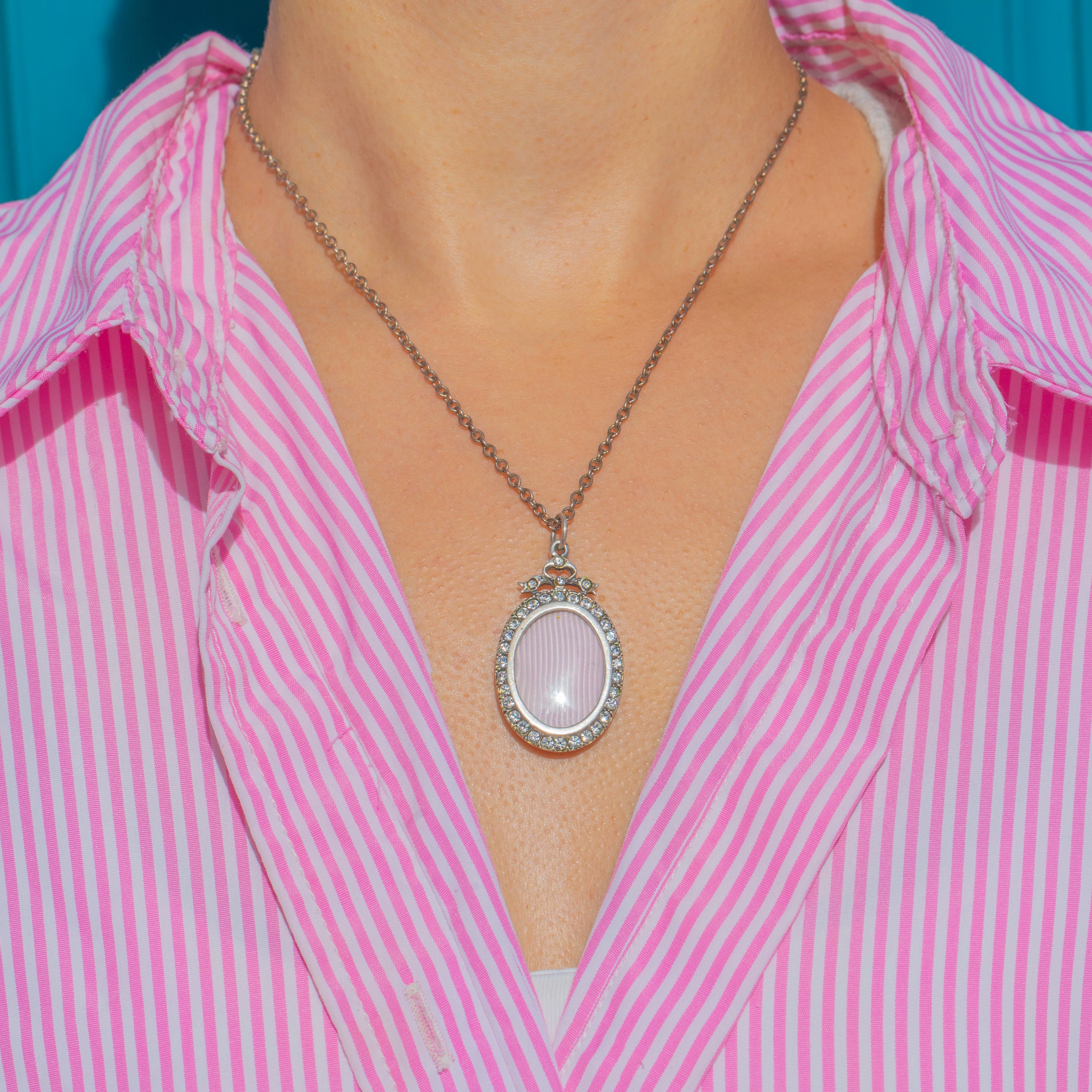 This Edwardian oval shaker locket is crafted in Sterling Silver and adorned with bright white Paste gemstones. Its classic oval form is simple yet elegant, with the glittering Paste stones providing a crisp sparkle against the cool Silver.