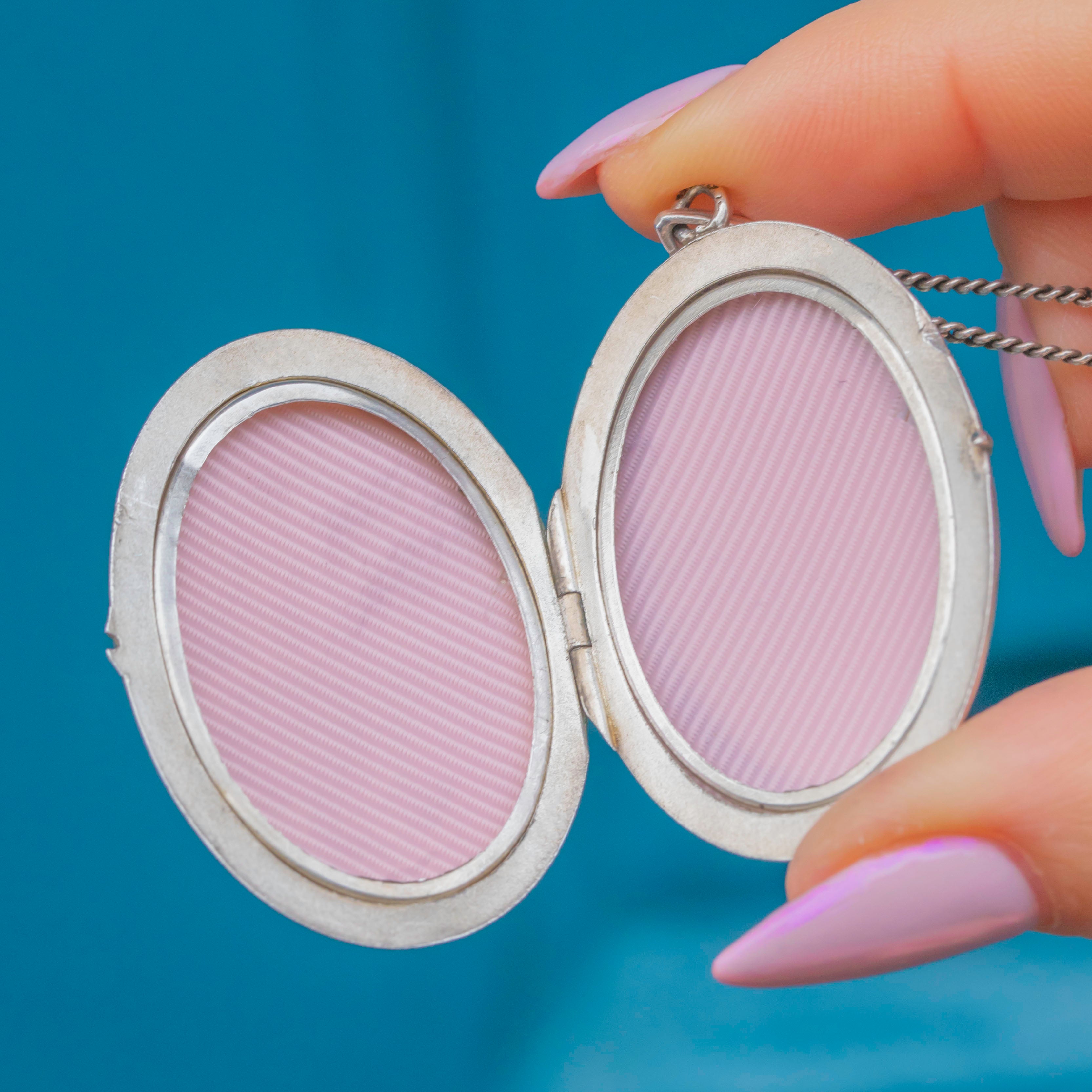 This exquisite Edwardian locket is crafted in Sterling Silver and hand-enameled with a beautifully painted pink rose in full bloom. The delicate detailing of the petals and leaves against the softly lustrous Silver background makes this piece a wonderful example of early 20th-century artistry.