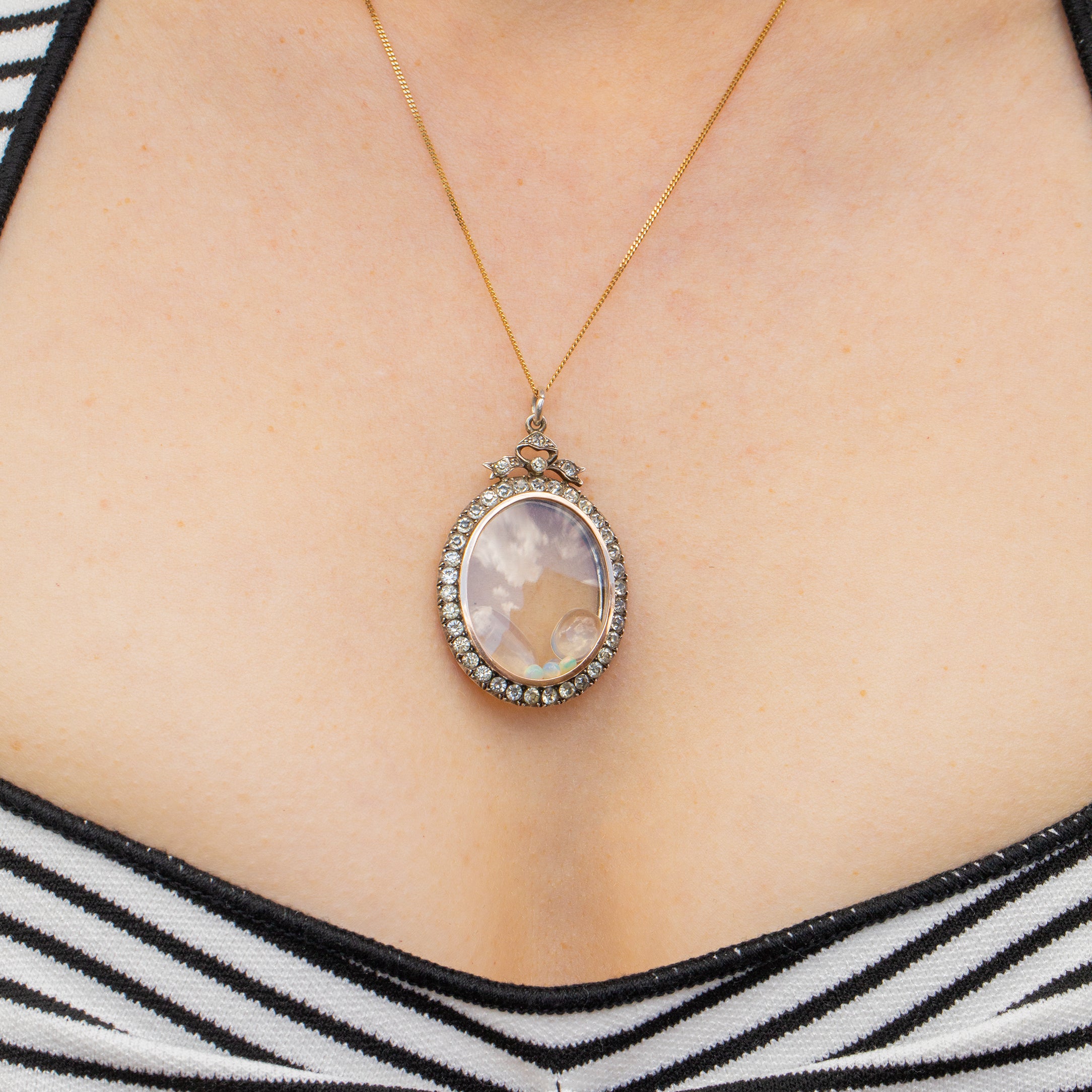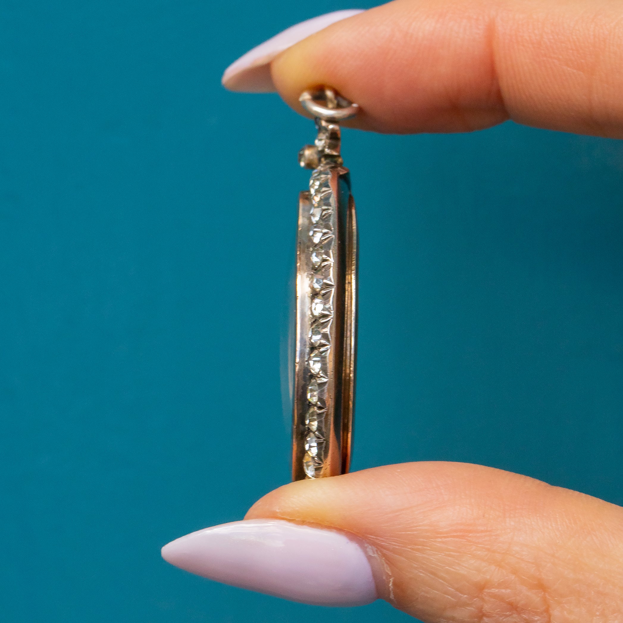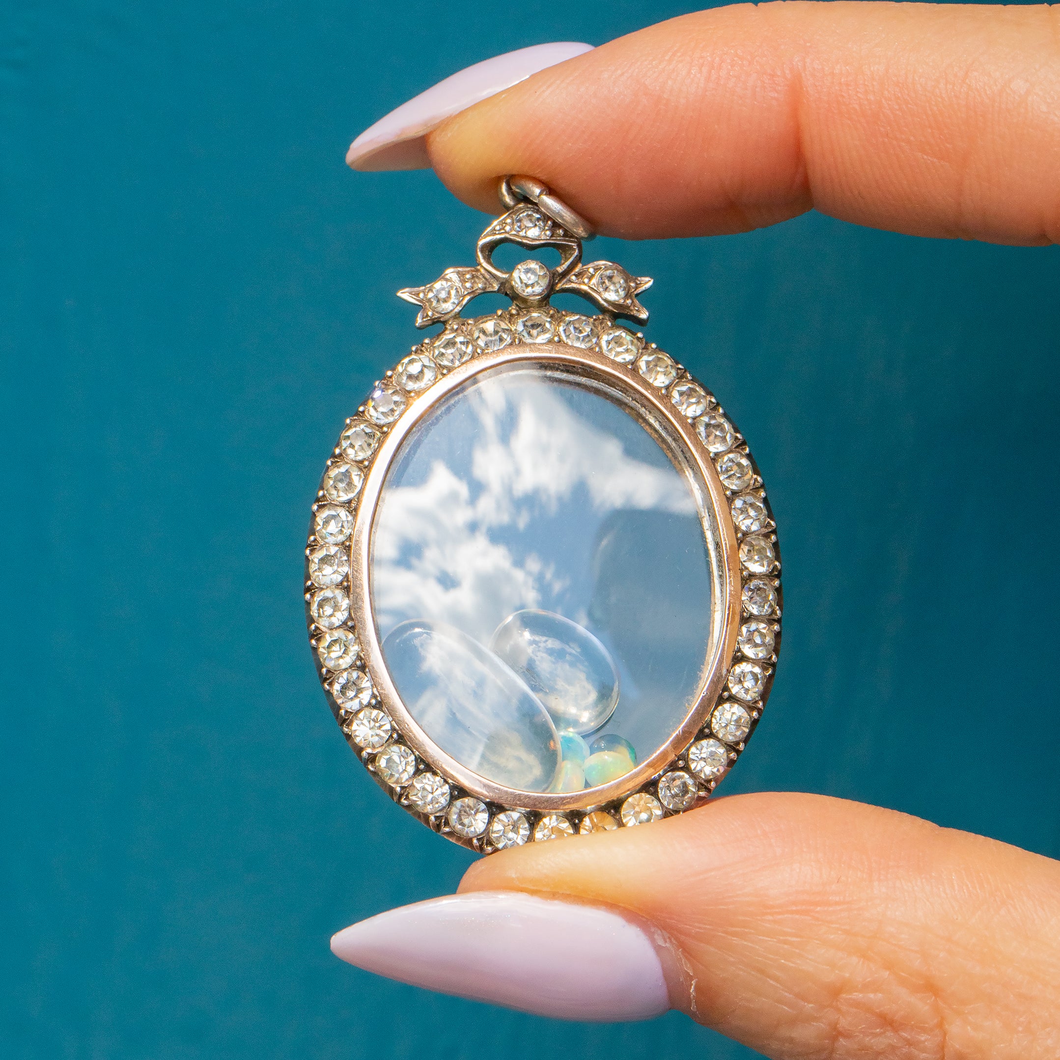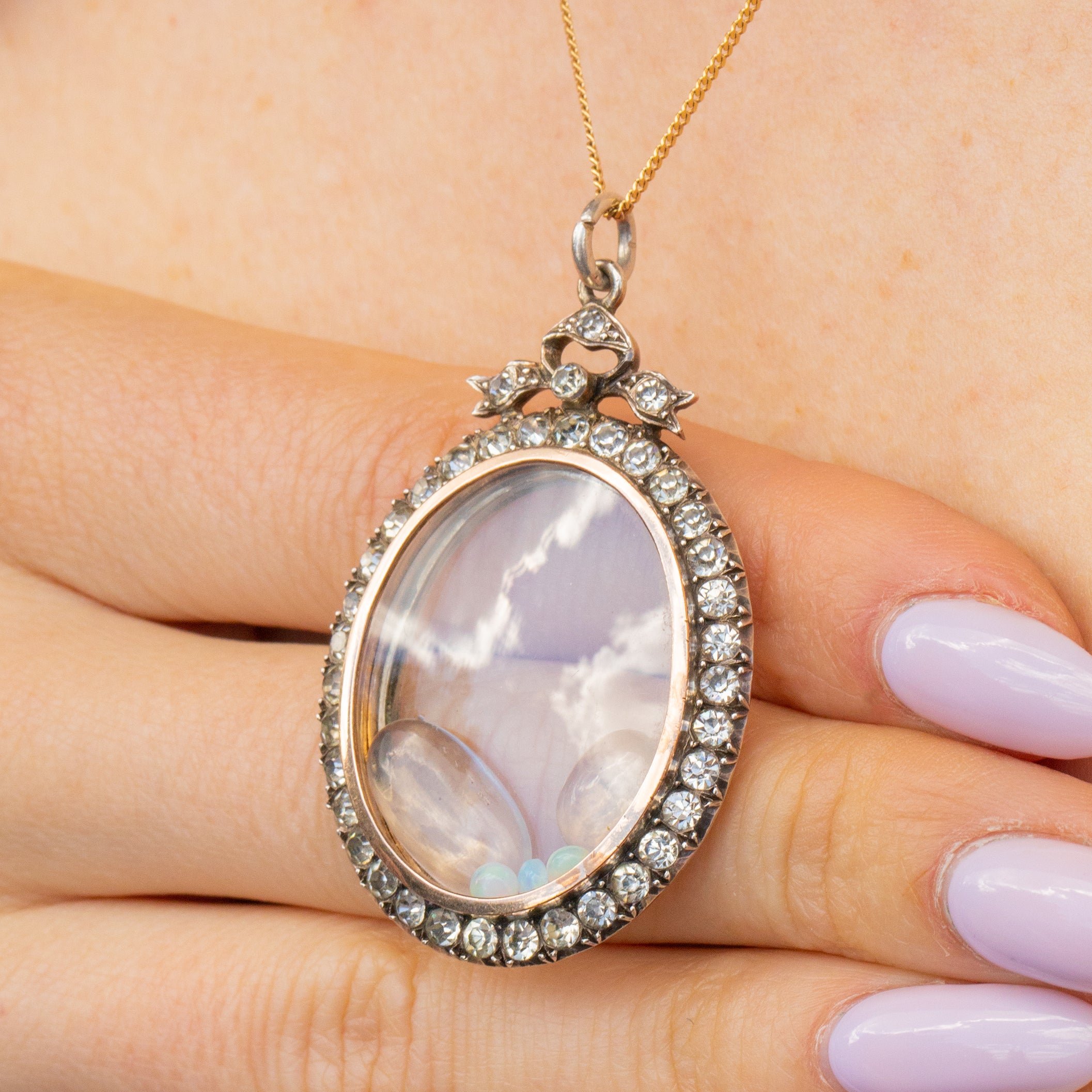 With a party of gems nestled inside her glass, the iridescent Opals and luminous Moonstones look sublime when they catch in the light. We adore how her Diamond paste sparkles from afar, she is the prettiest locket for your antique jewellery collection!