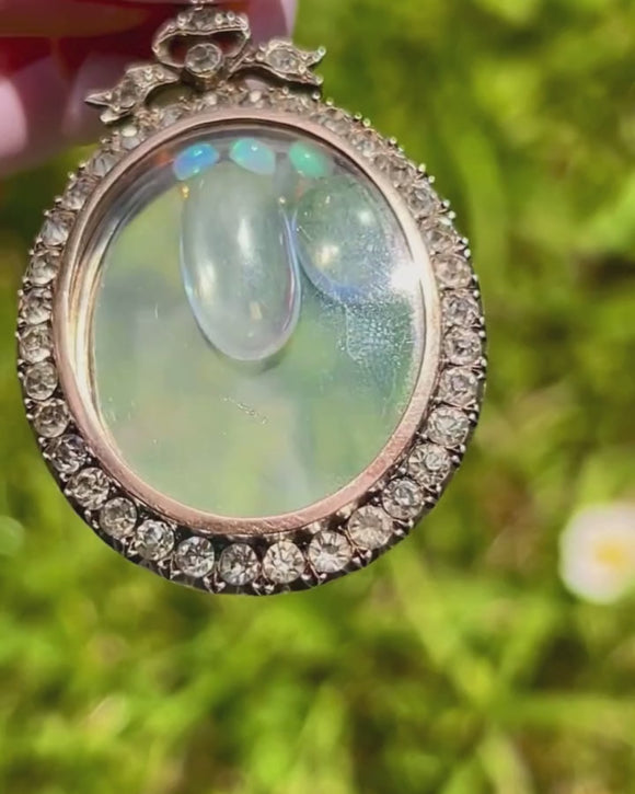VERY GOOD: This antique Silver Paste oval shaker locket with Opals and Moonstones is in very good condition. All Diamond Paste stones are present and secure in their settings. There is a slight variation in colour tone, but as a whole they glisten brightly! Her glass is smooth to the touch, preserving the gorgeous gemstones inside. Commentate with age, her glass has a few minor scratches and Silver has accrued the most desirable patina. This super sweet locket will satisfy all your sparkle needs!