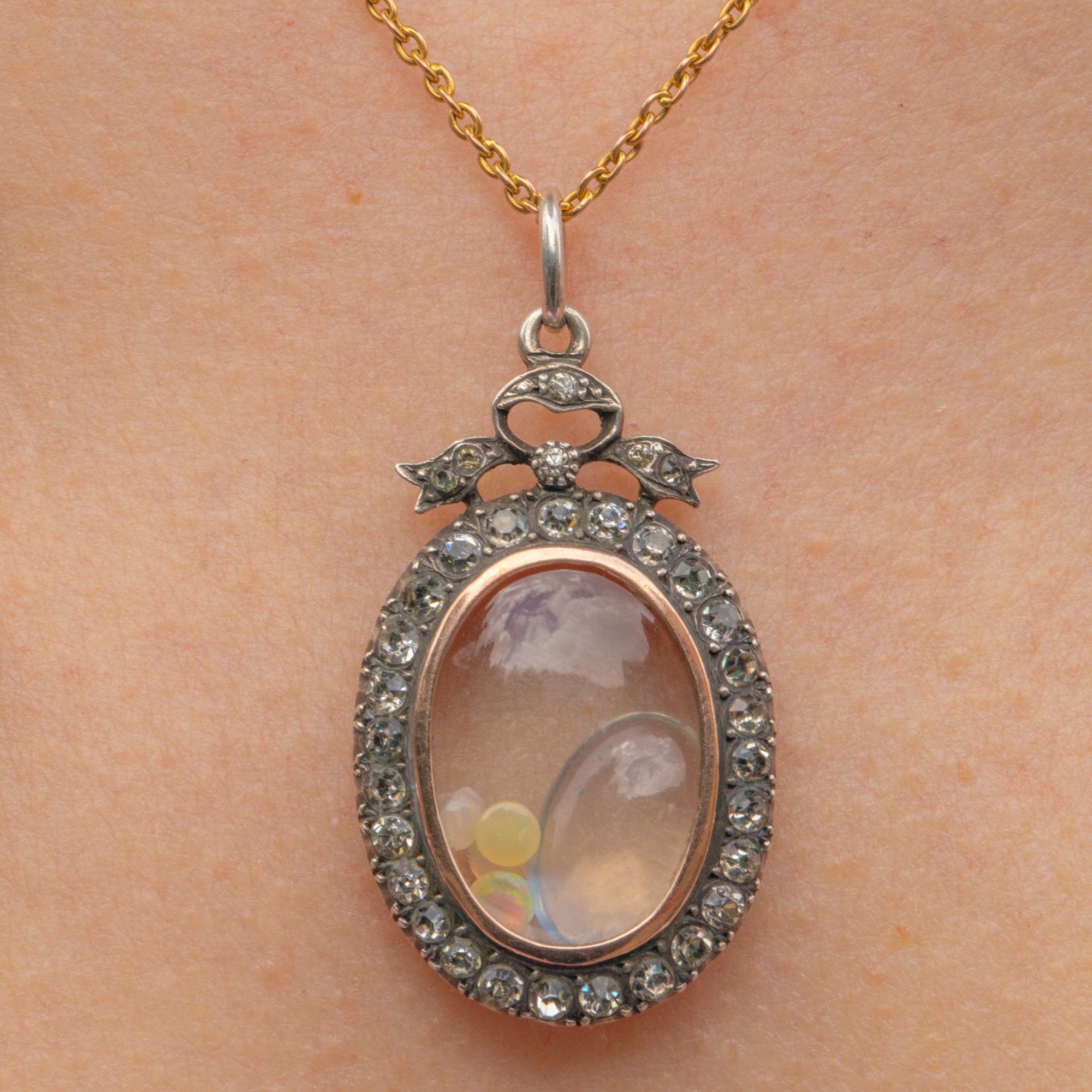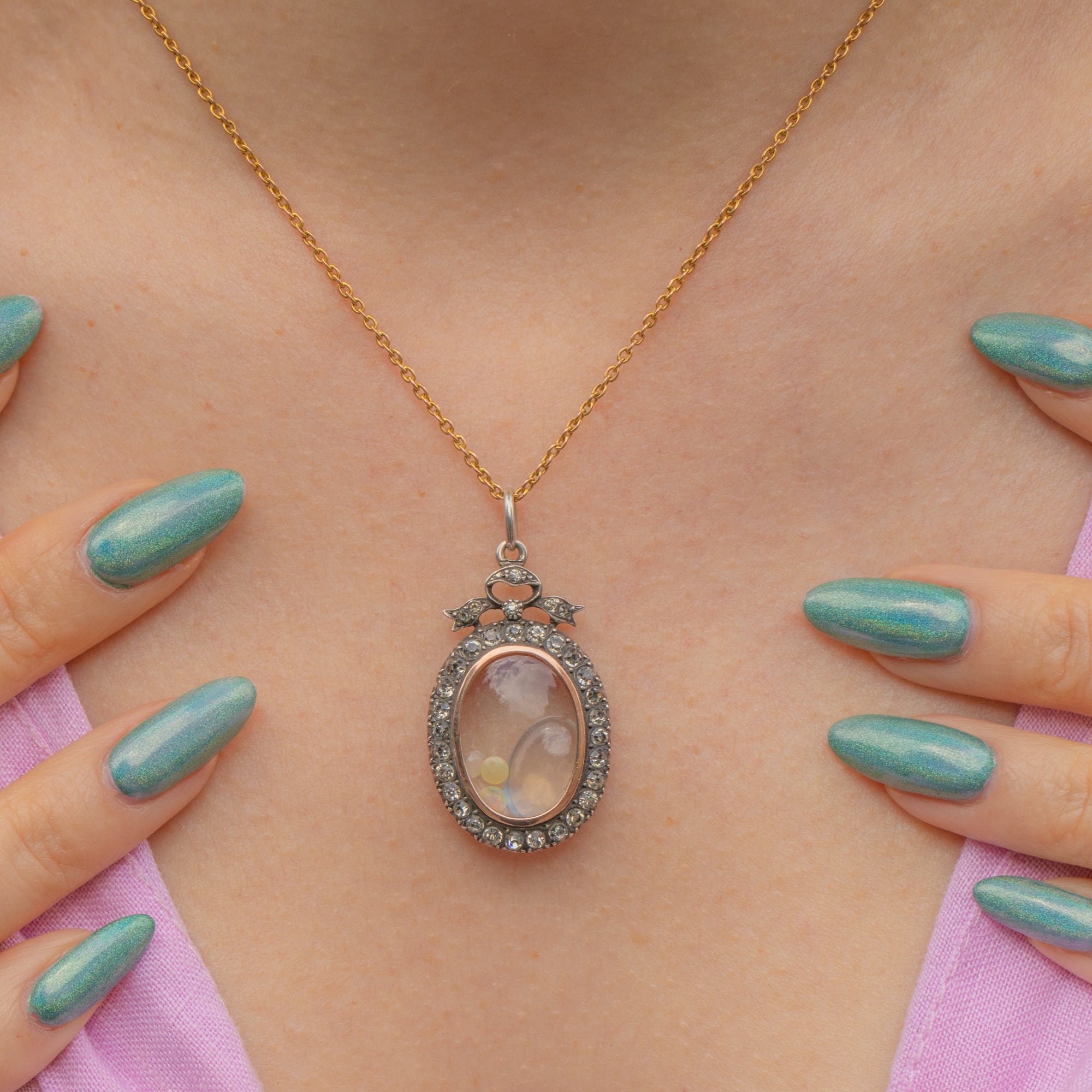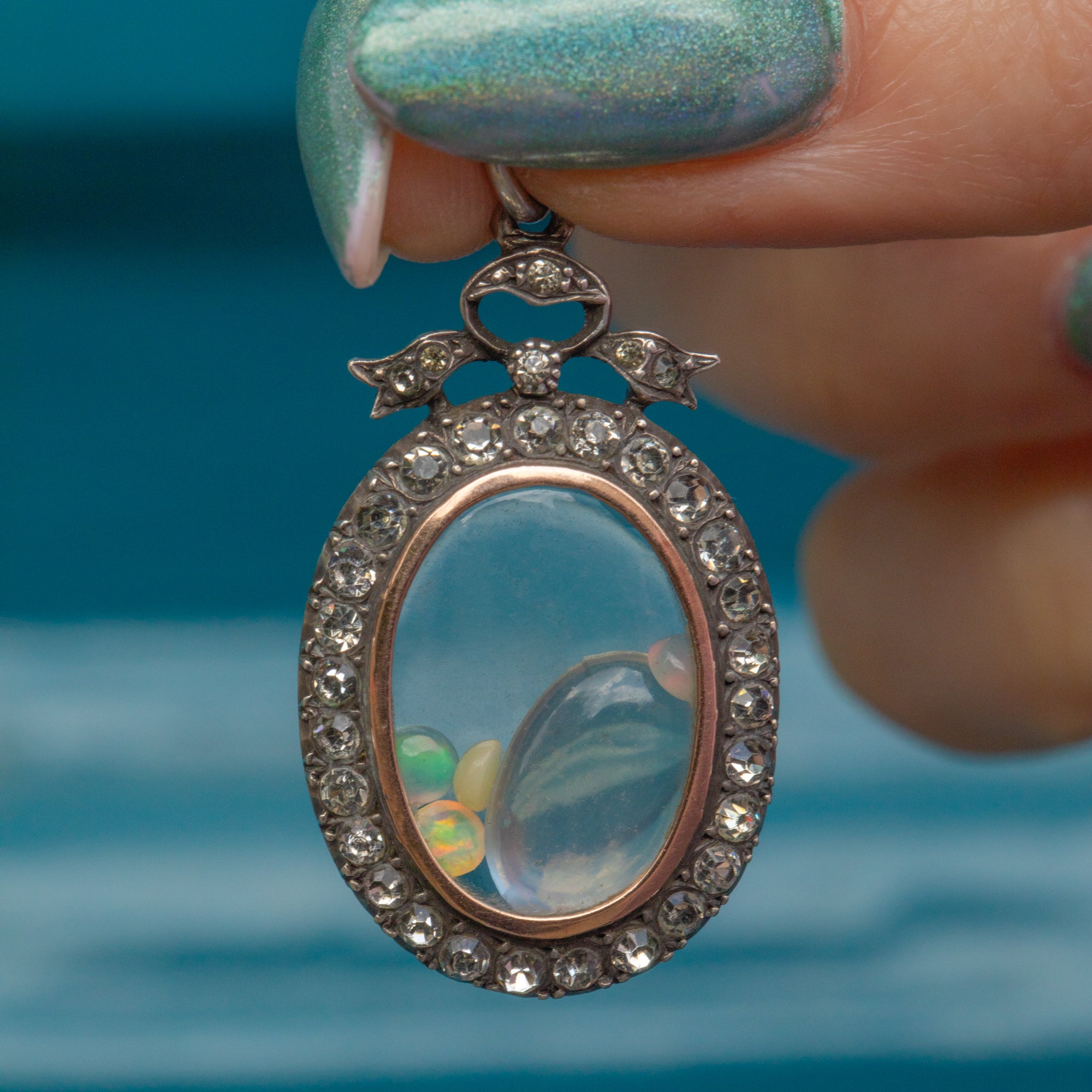 This Edwardian Silver Paste shaker locket is a sparkling statement that will catch the eye of any on-looker! Not only does she have a border of scintillating Paste that glisten from every angle, but she is also filled with vibrant Opals and Moonstones inside.