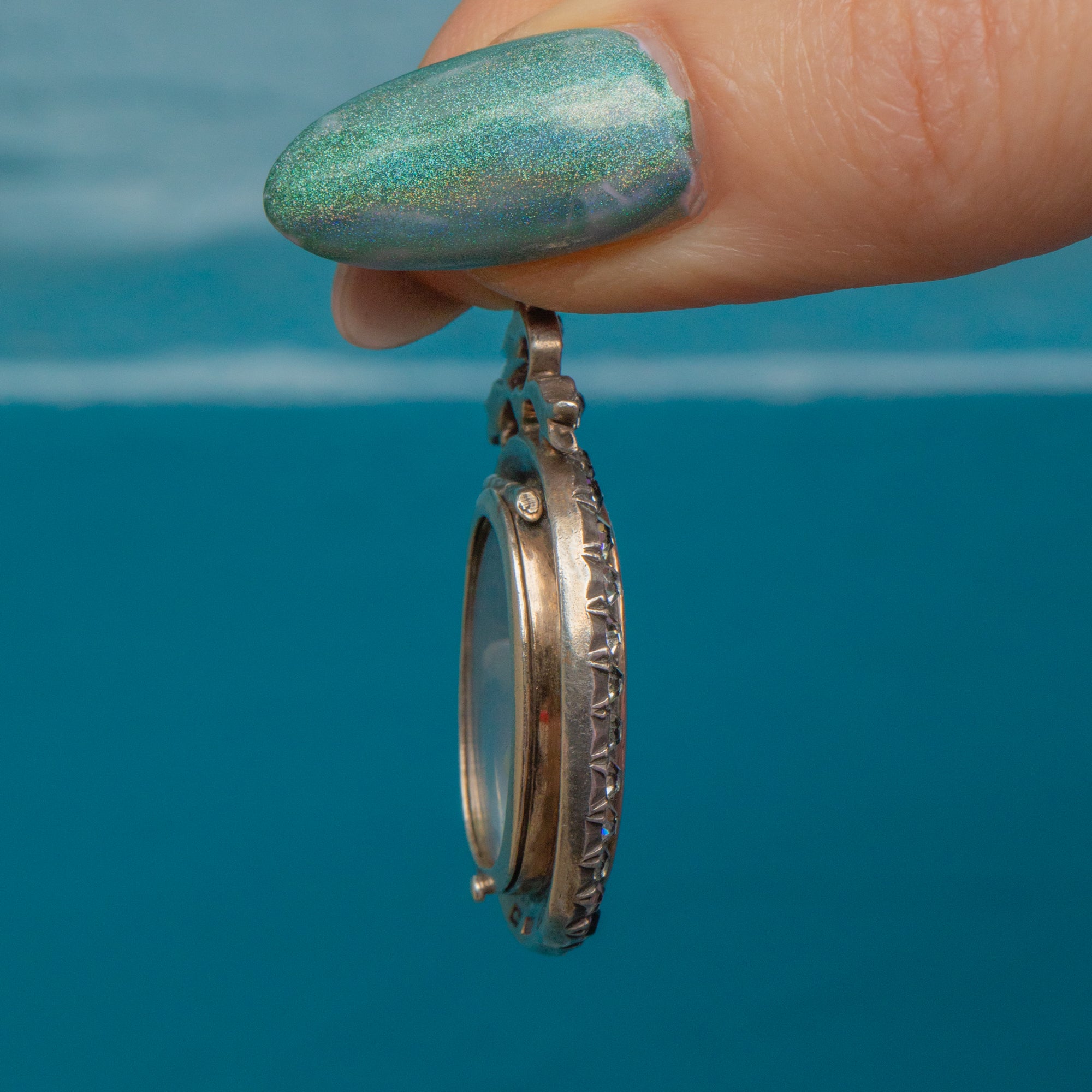 VERY GOOD-EXCELLENT. This Edwardian Silver Paste shaker locket is in very good to excellent condition. The Paste are pristine, completely free from any chips or fleabites, and securely set into robust Silver. The glass panes have subtle wear to the outside but nothing that affects you being able to see her otherworldly gemstones!