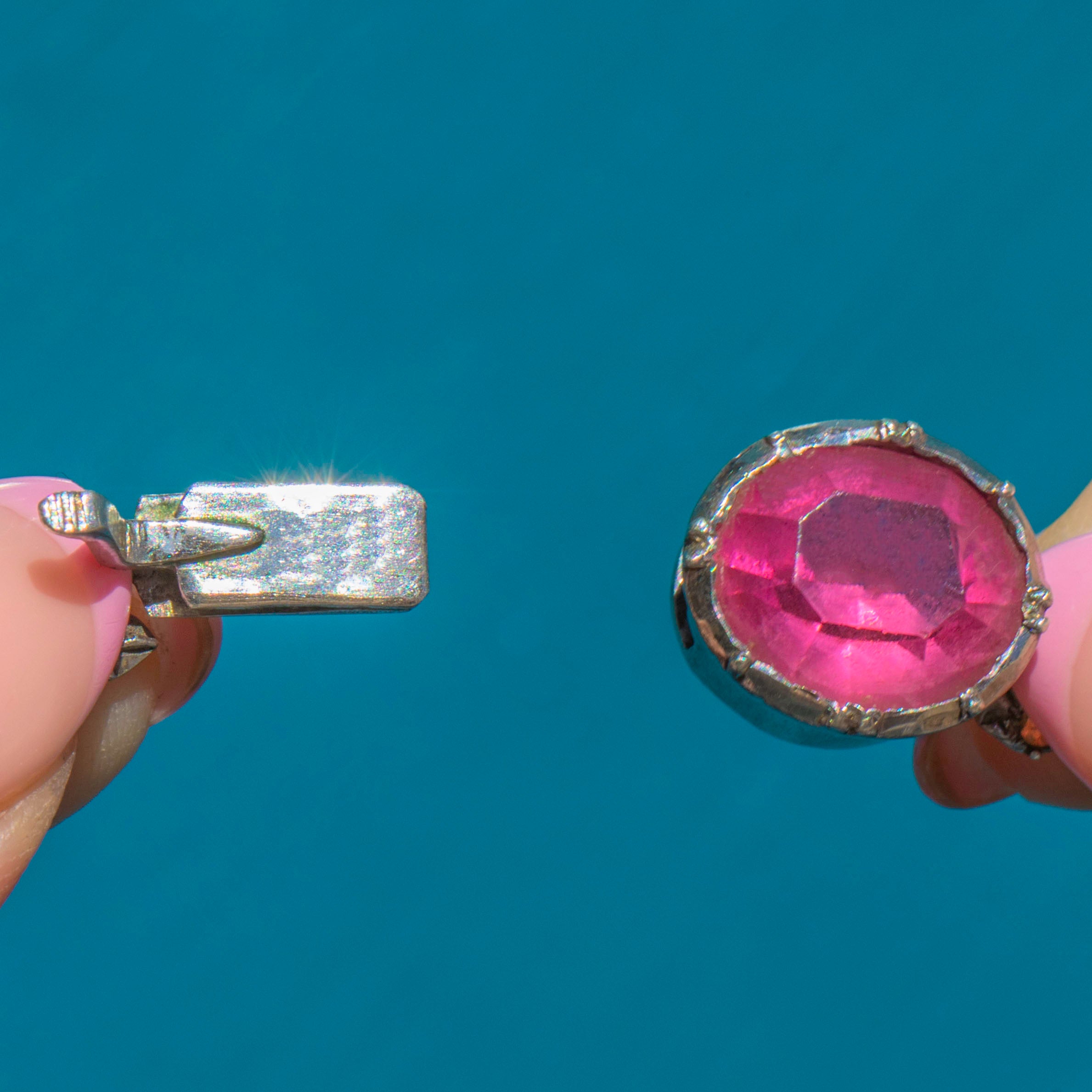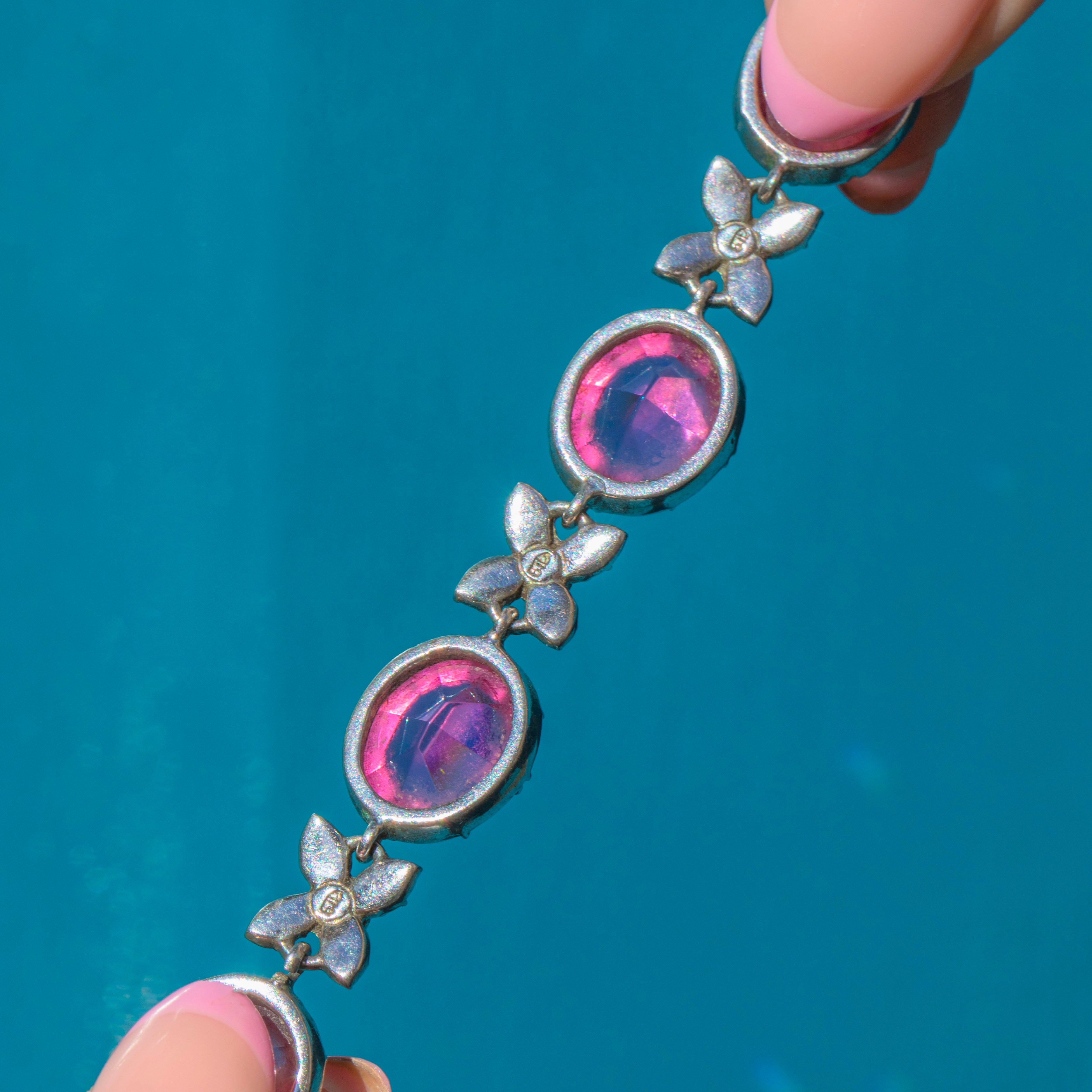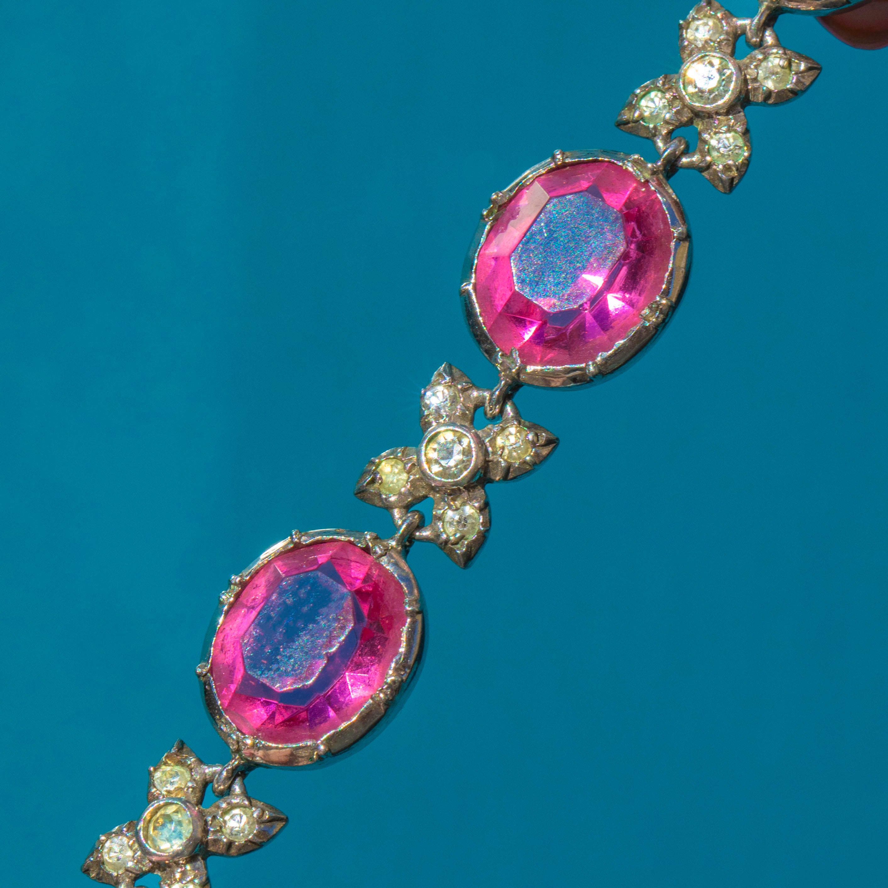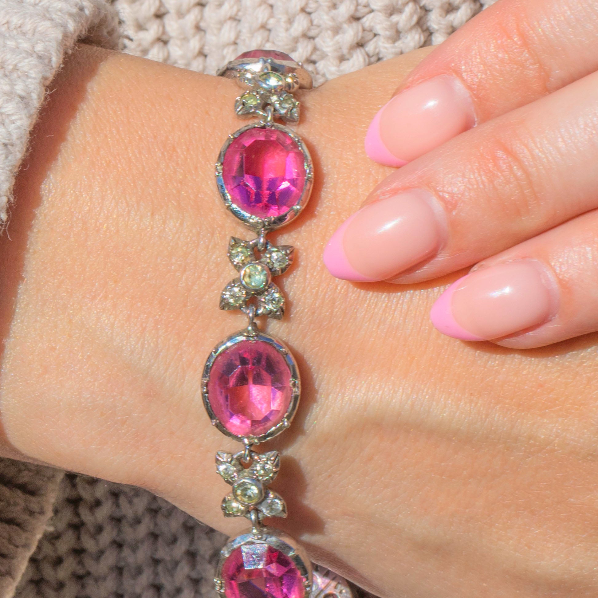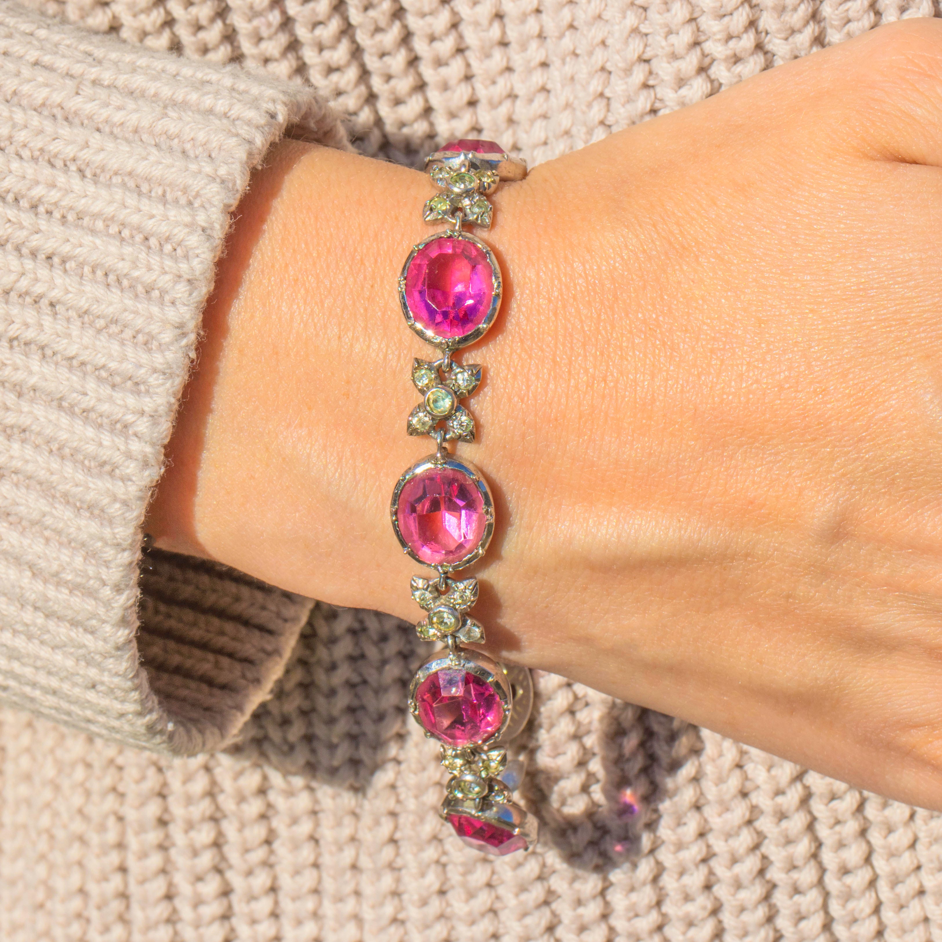 Pretty and pink, this Edwardian Silver pink Paste bracelet will make a feminine addition to your antique jewellery collection! Her 7.5" length is formed of glistening fuchsia-hued Paste, complimented by crisp white Paste accents set within floral links.