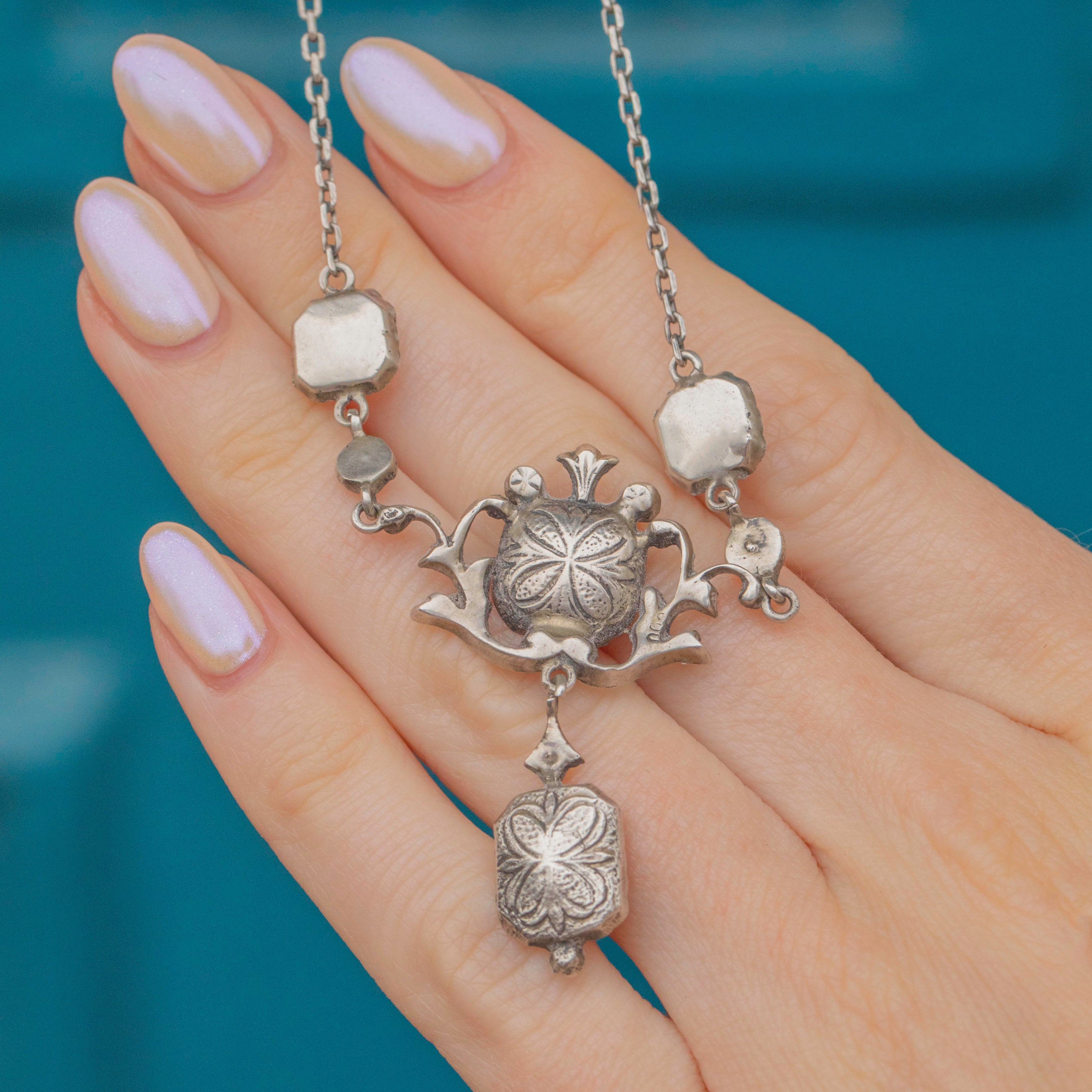 Delicately crafted, this piece embodies the elegance and refinement of the early 1900s. Suspended from a fine Silver chain, she offers a graceful statement for any antique jewellery collection!