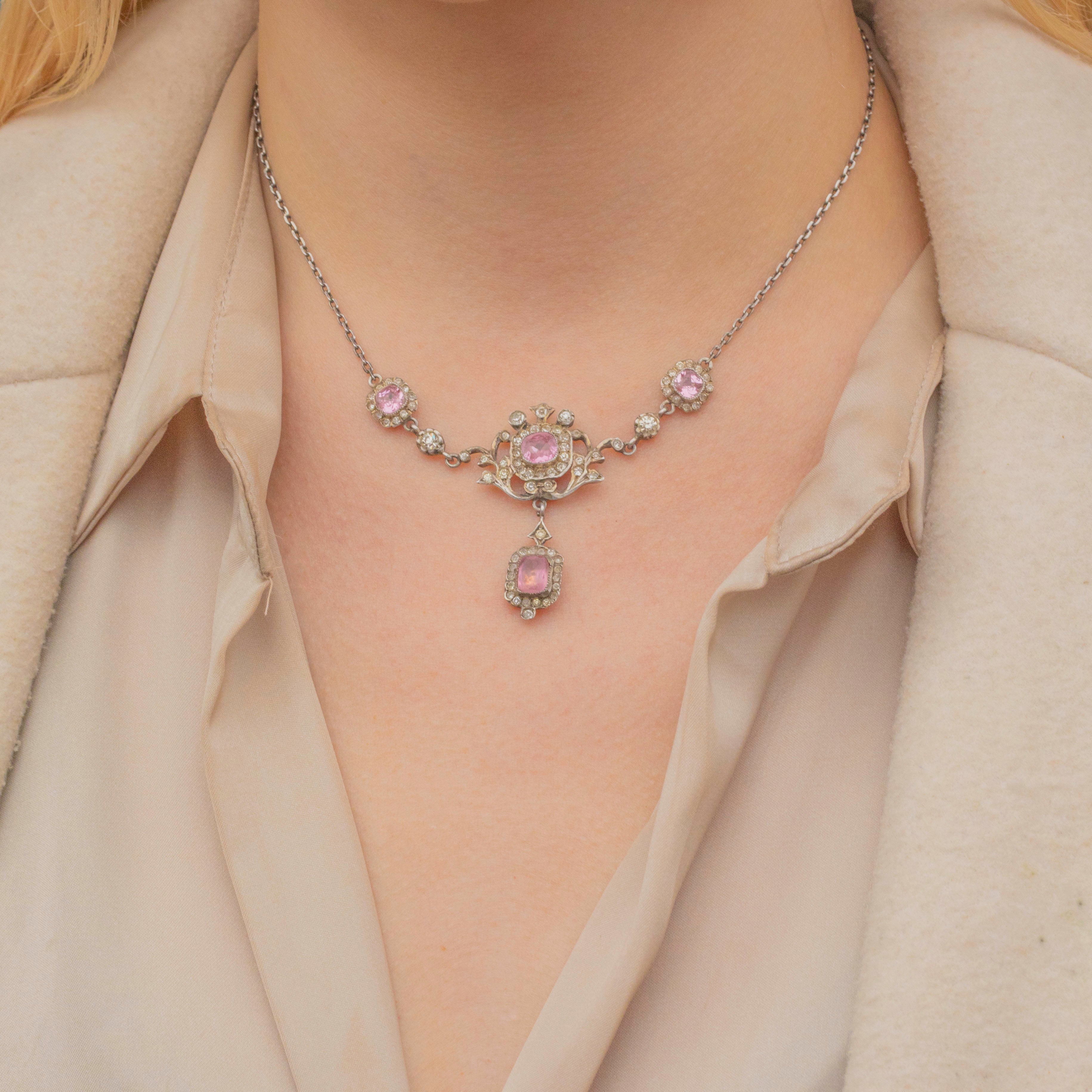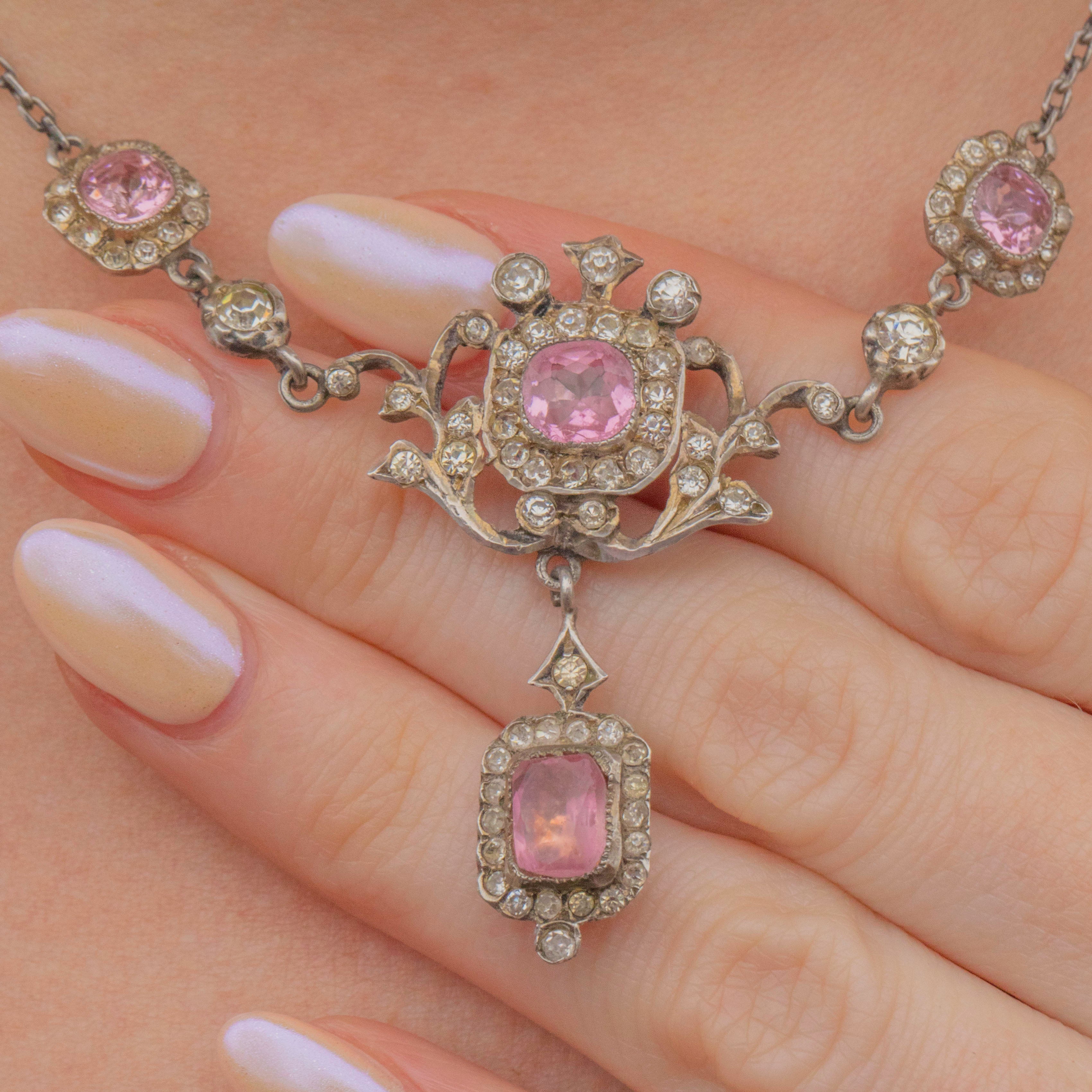 VERY GOOD: This Edwardian Silver pink Paste lavalier necklace is in very good condition. Her Pink Paste gemstones are bright with the most gorgeous baby pink hue. There is some discolouration to the White Paste, however, this is only truly noticeable under close inspection. The silver shows a natural patina, enhancing her Edwardian character, and the clasp is fully functional.