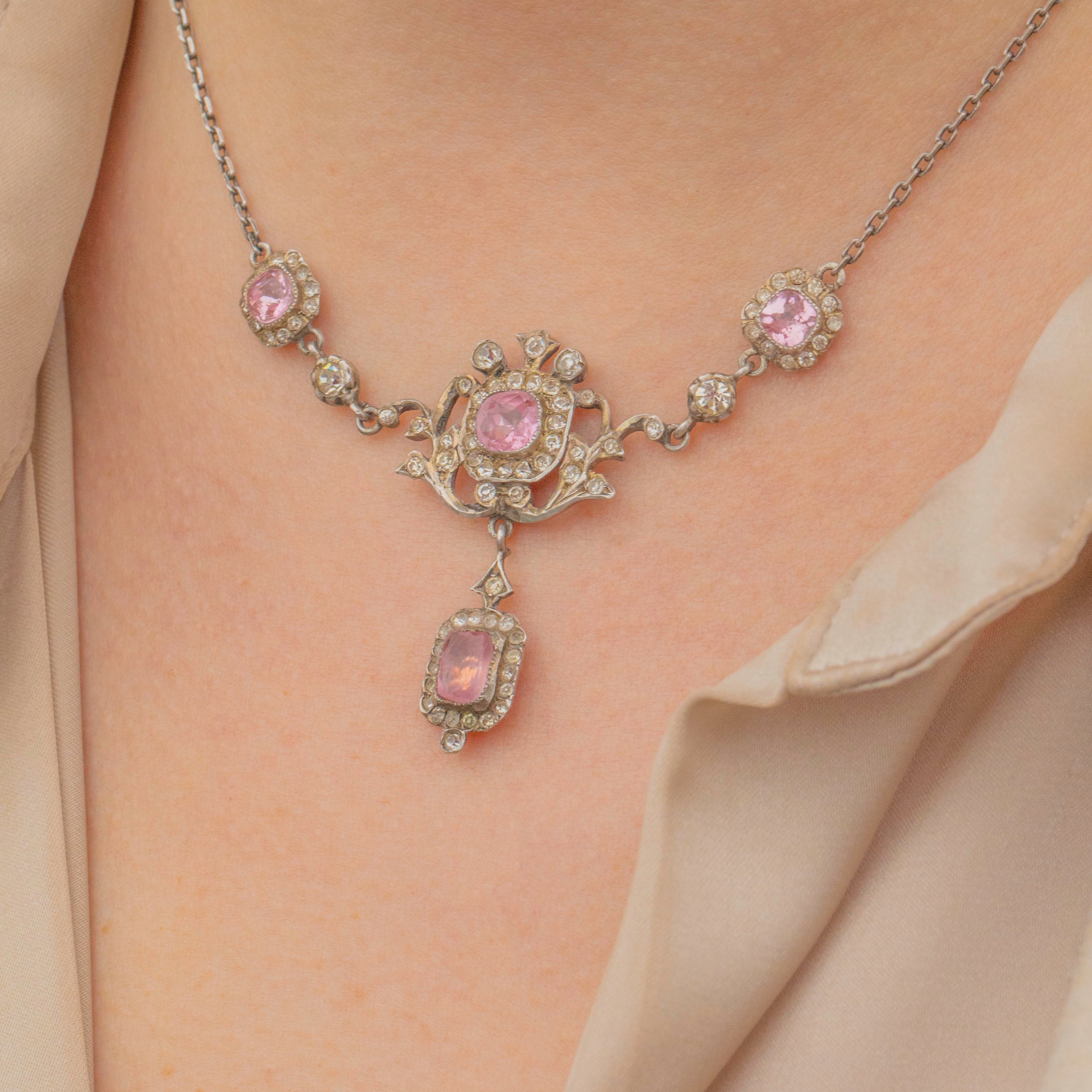 Edwardian Silver Pink Paste Lavalier Necklace