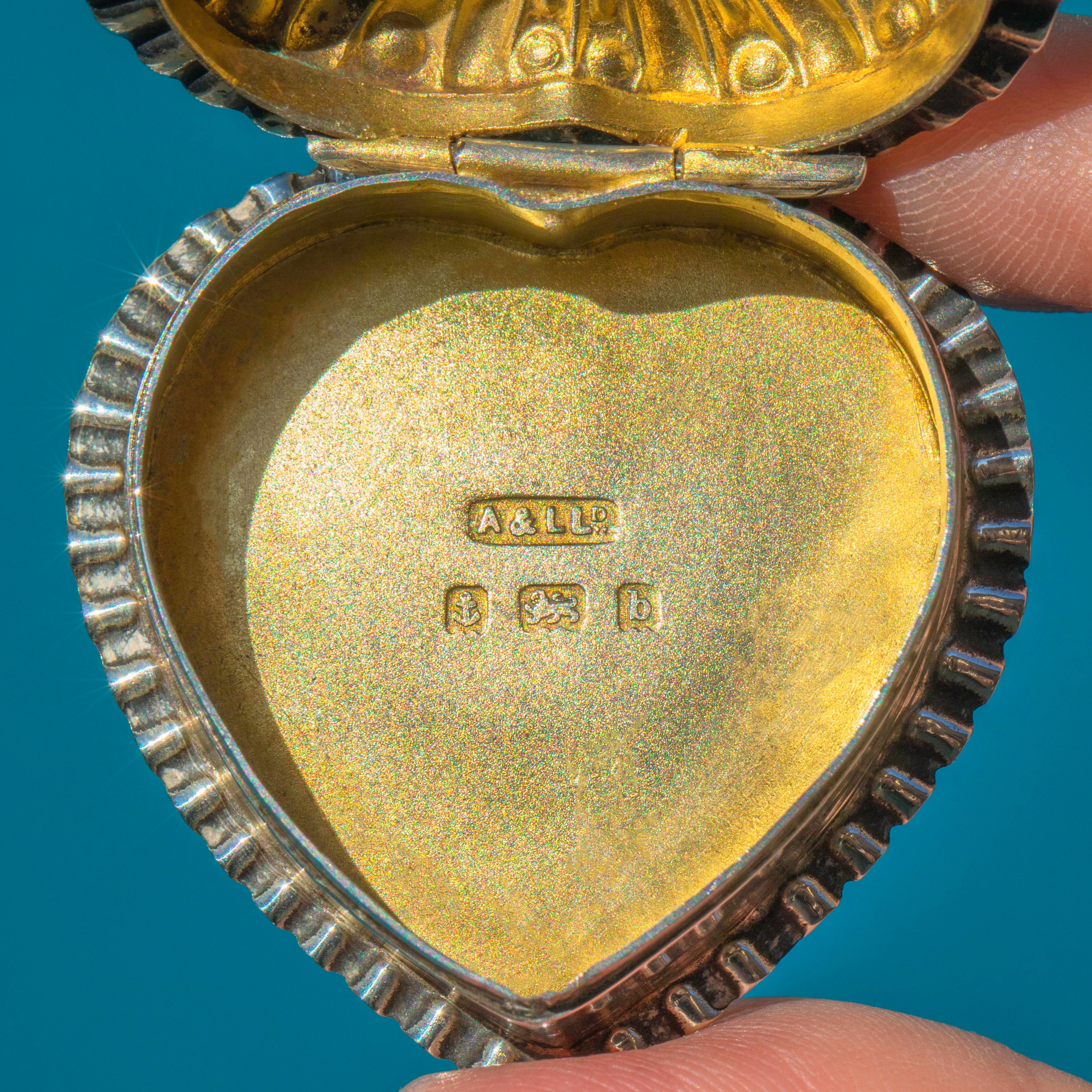 VERY GOOD. This Edwardian Silver repoussé heart trinket box is in very good condition! The repoussé detailing is pristine and flaunts a deep patina within the grooves emphasising its eye-catching form. The Gold gilt does have a few signs of wear but this does not affect her functionality and the hallmarks remain crisp allowing us to accurately date this antique collectible to 1901. With a lid that closes securely, you can store your most precious trinkets with utmost confidence!