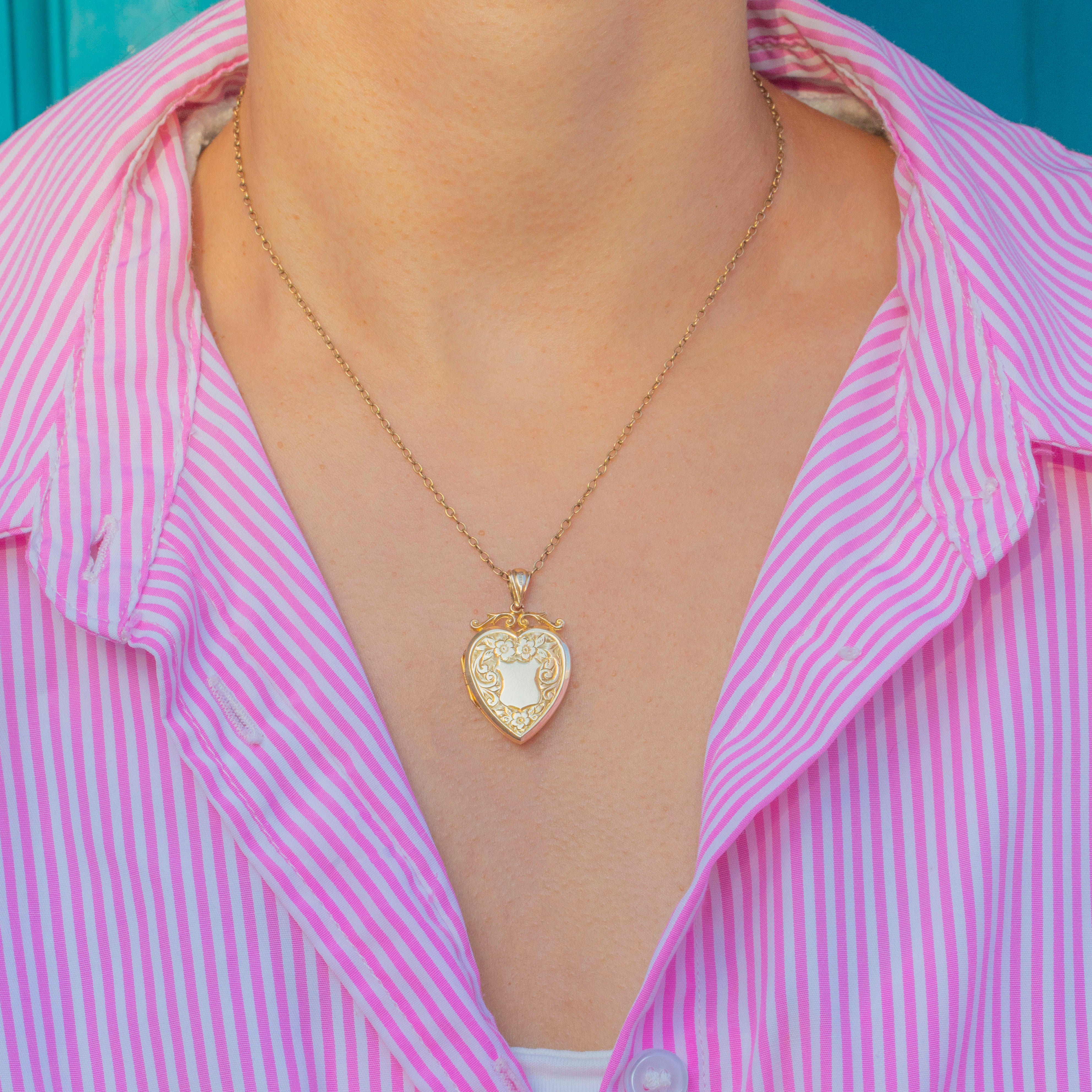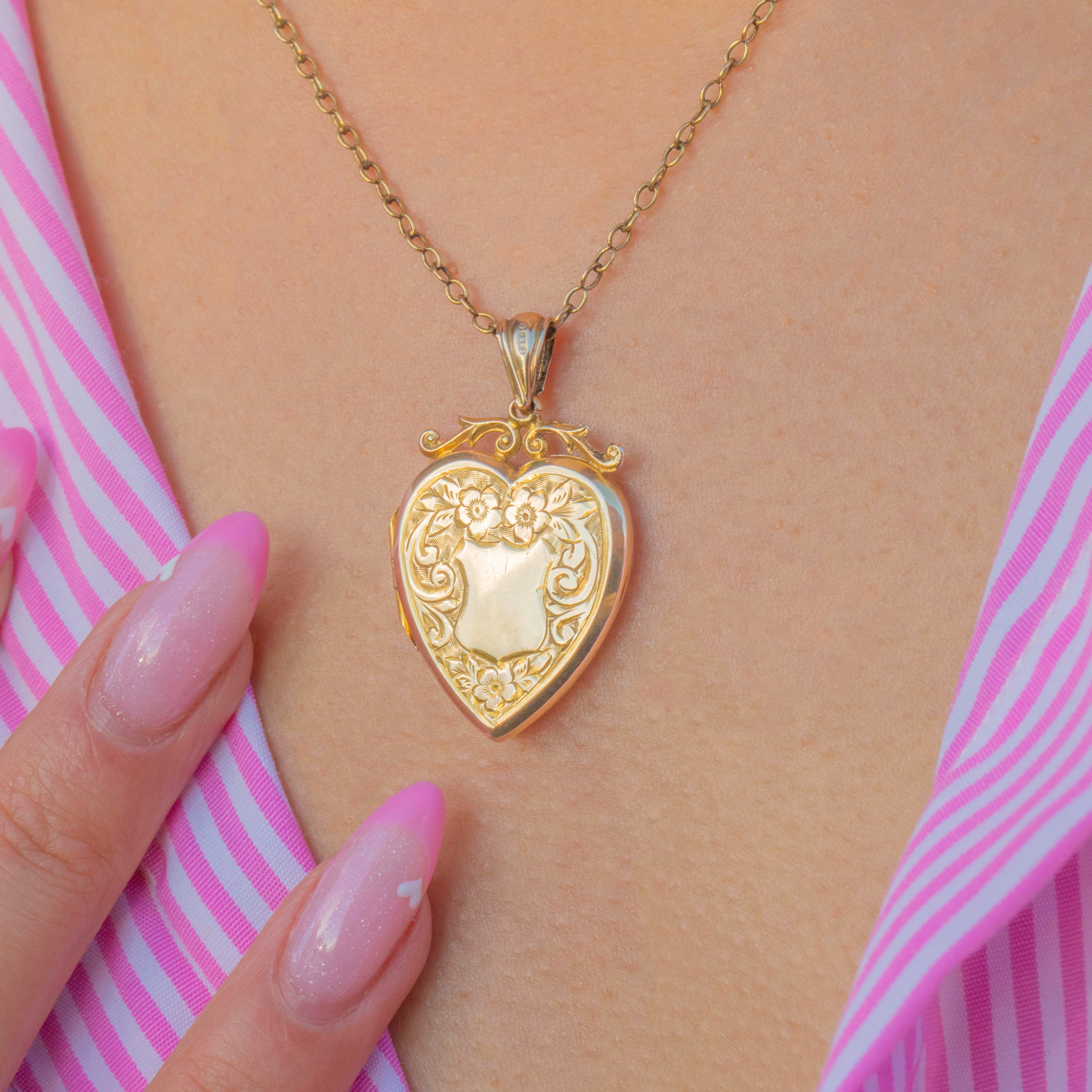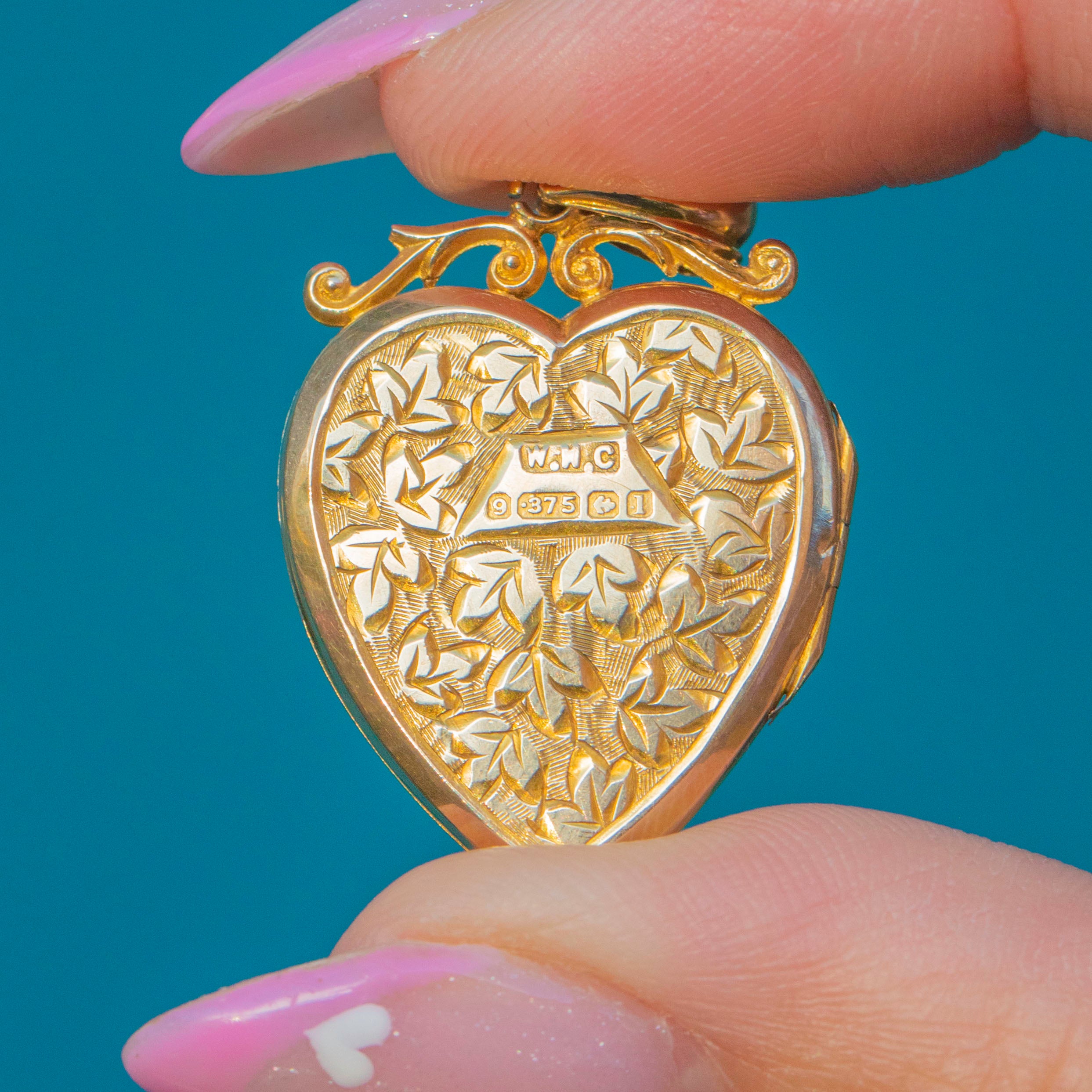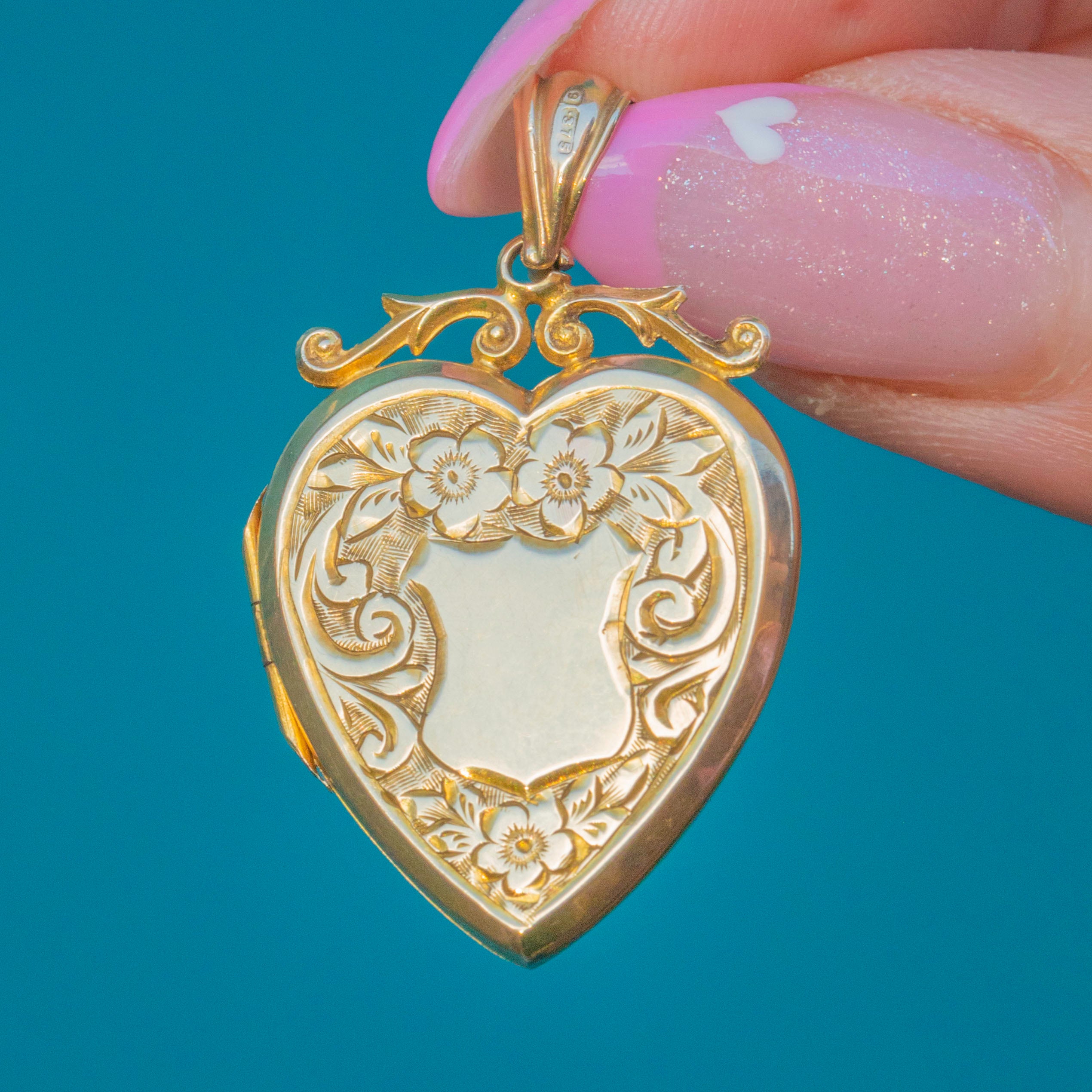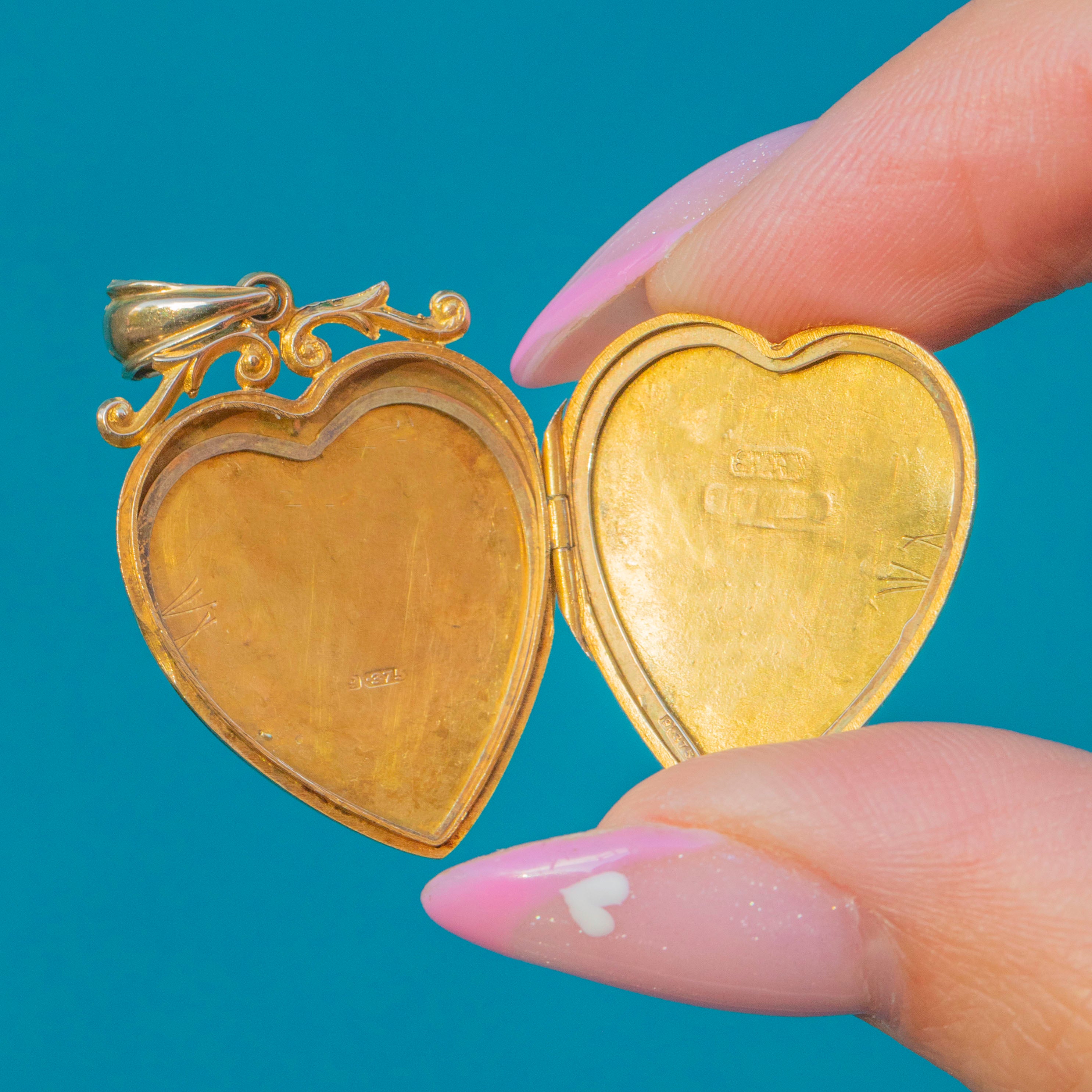 Romantic and refined, this Edwardian 9ct Gold heart-shaped locket dates to 1910 and captures the timeless sentiment of early 20th-century design. Its smooth, glossy surface has a soft antique glow and opens to reveal two original frame retainers ready to hold cherished photographs or keepsakes.