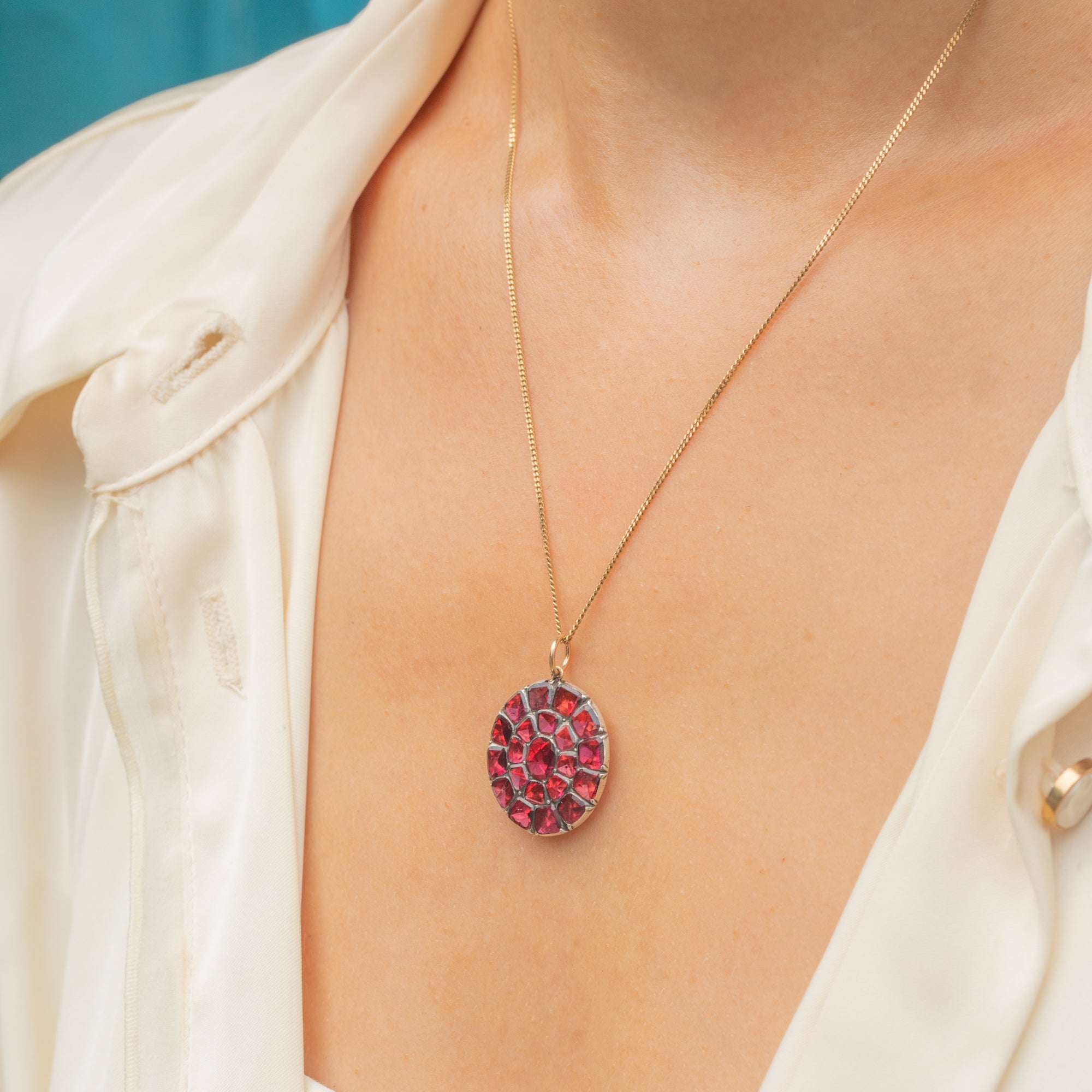 A beautiful English Georgian cluster pendant set with glowing, foiled flat-cut Garnets in graduating sizes.