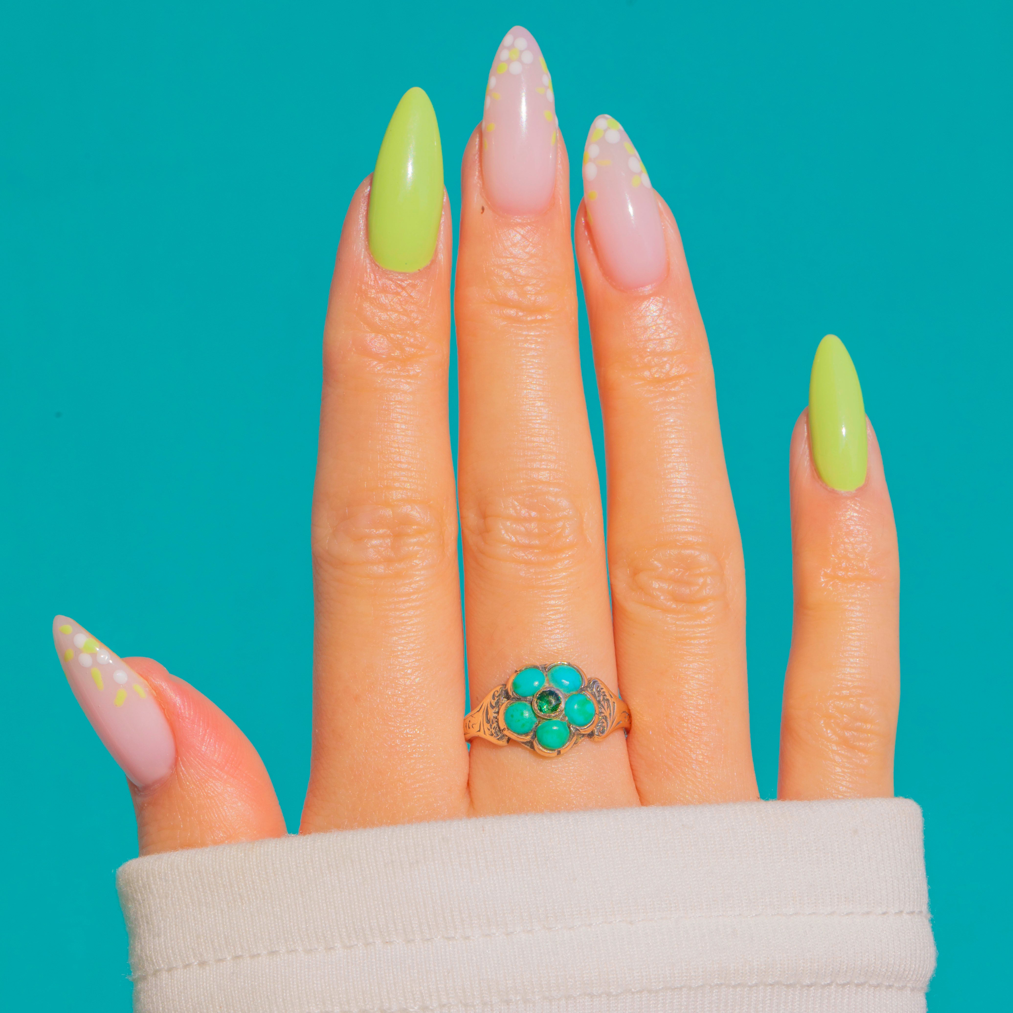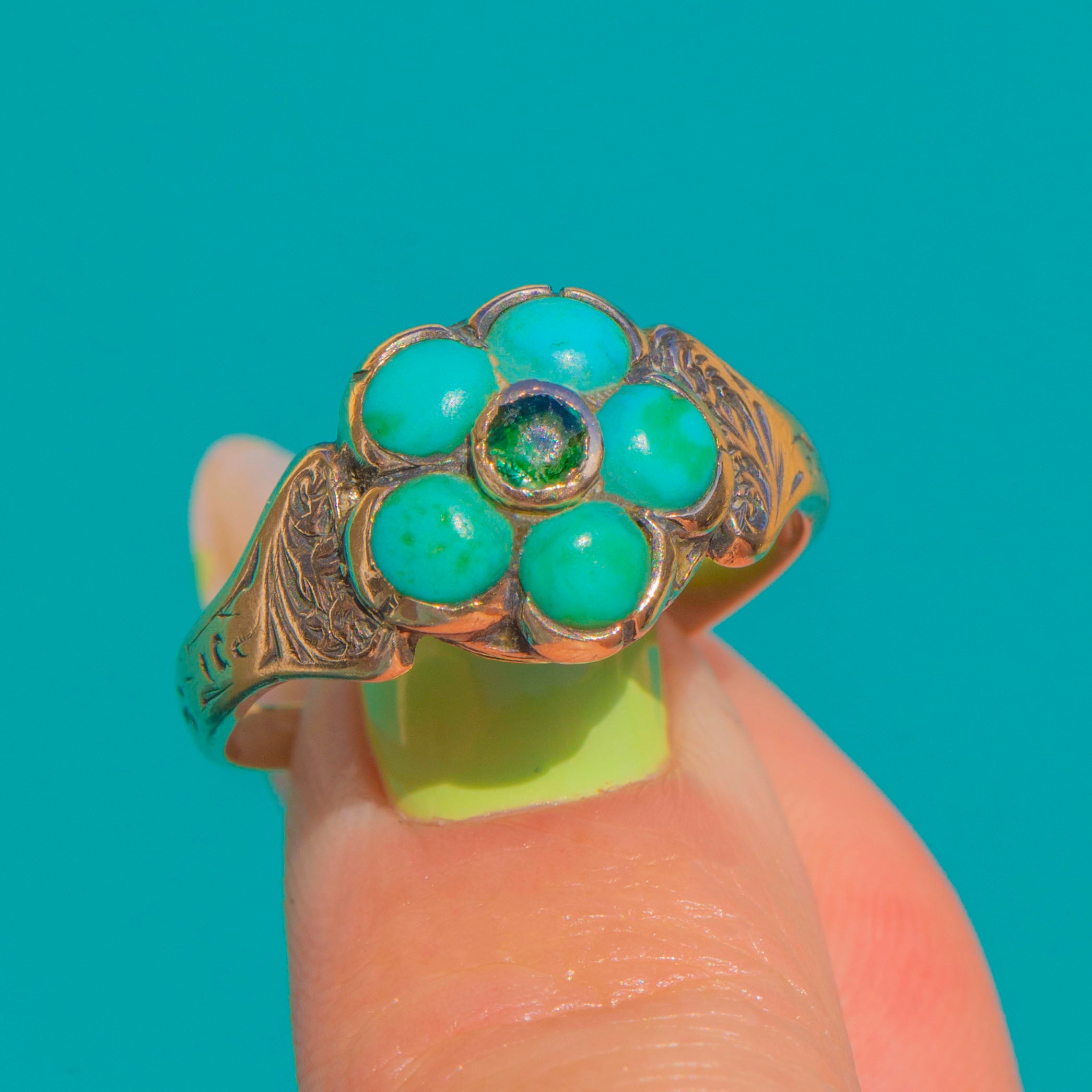 ロマンティックなVictorian時代の「フォーゲット・ミー・ノット」フラワーリング。9ctゴールドに、5石のナチュラルターコイズ・カボションが配され、中心にはフォイルド・グリーンペーストが輝きます。低めのベゼルが可憐な花束を形作り、温かみのある手仕上げのシャンクには、ショルダー部分に繊細な植物模様のエングレービングが施されています。ターコイズは柔らかなブルーグリーンの色調を放ち、フォイルドペーストはシルバーやフォレストグリーンの煌めきを添えています。