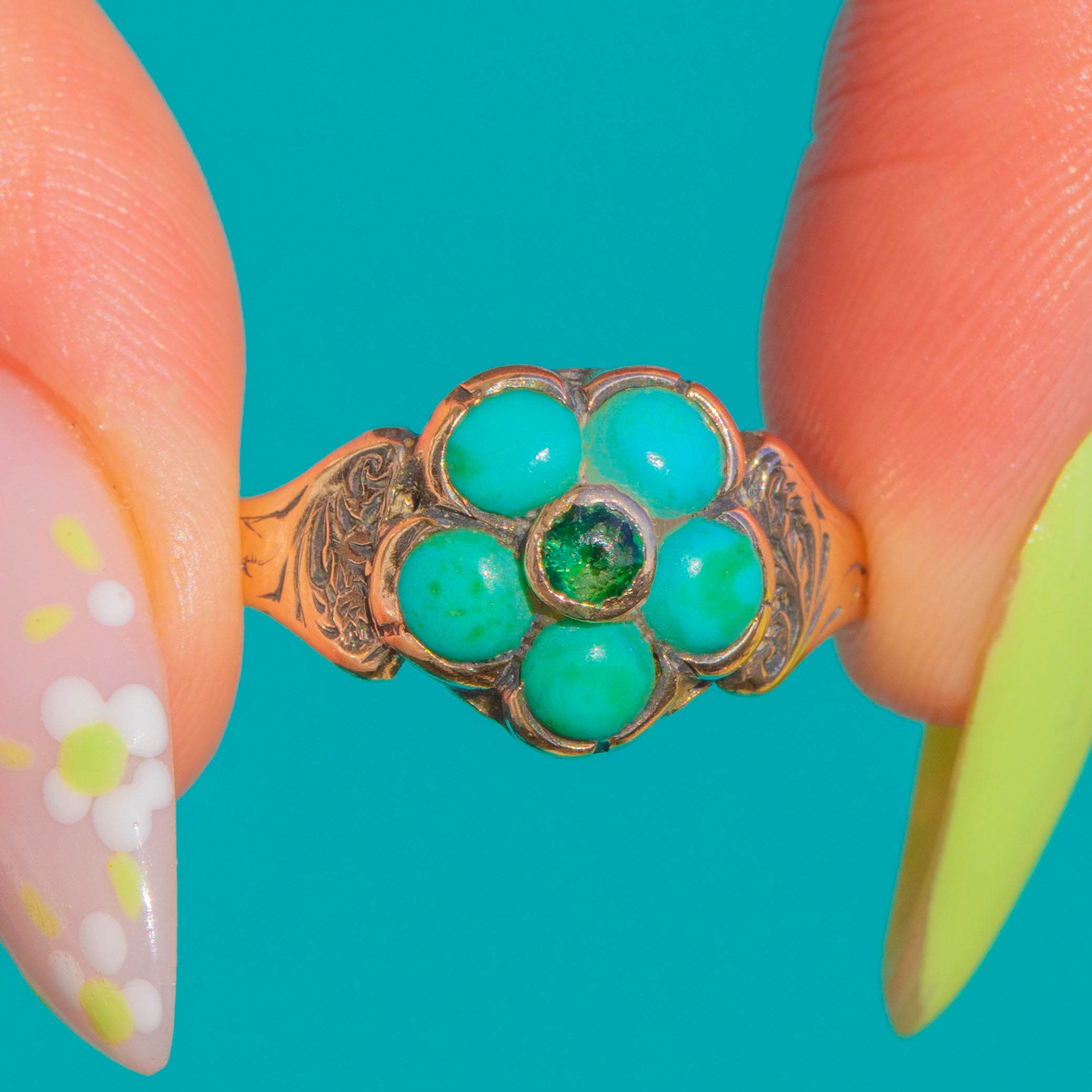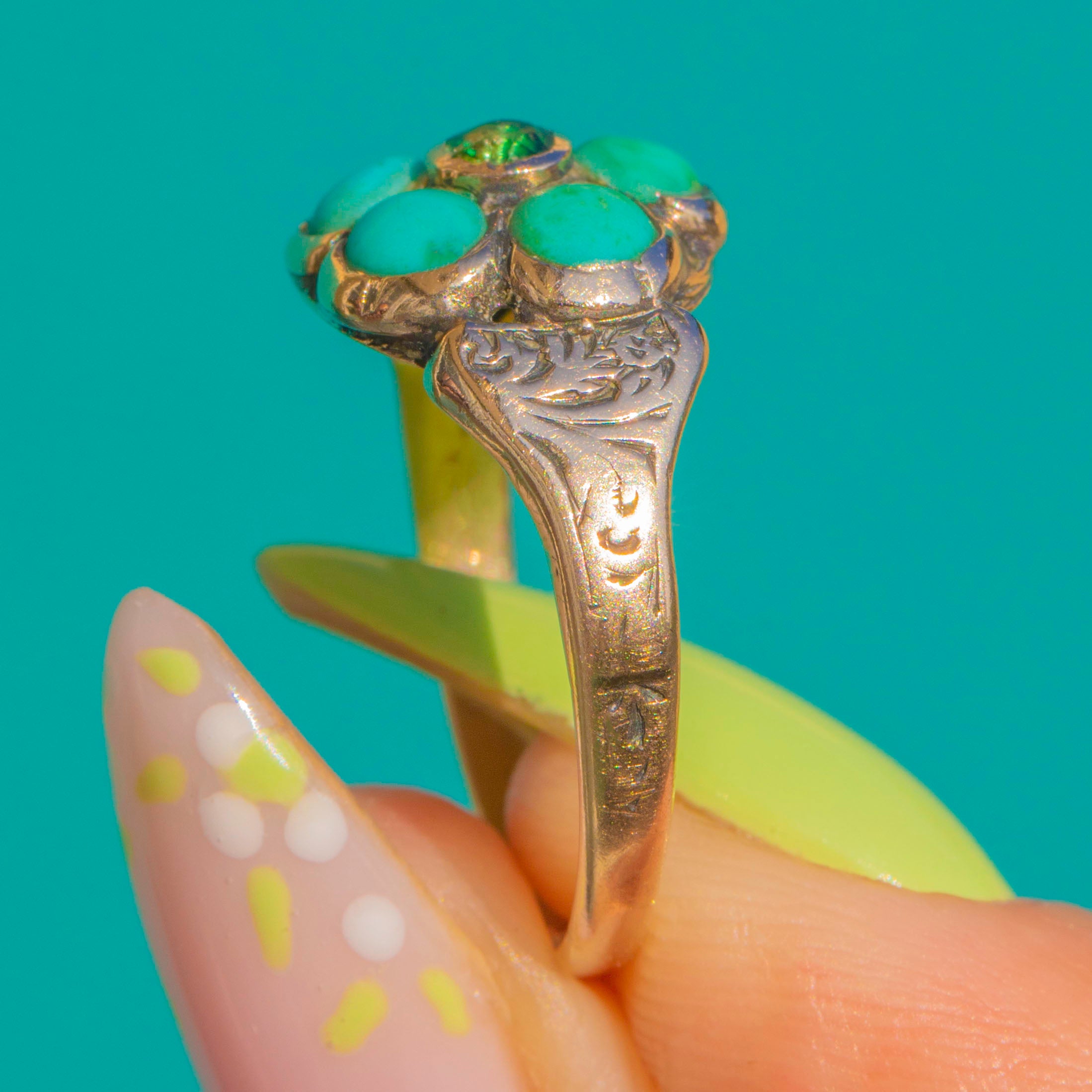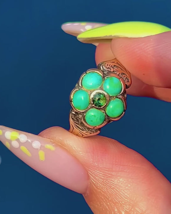 エングレーブド 9ct ゴールド Victorian ターコイズ&グリーンペースト フラワーリング