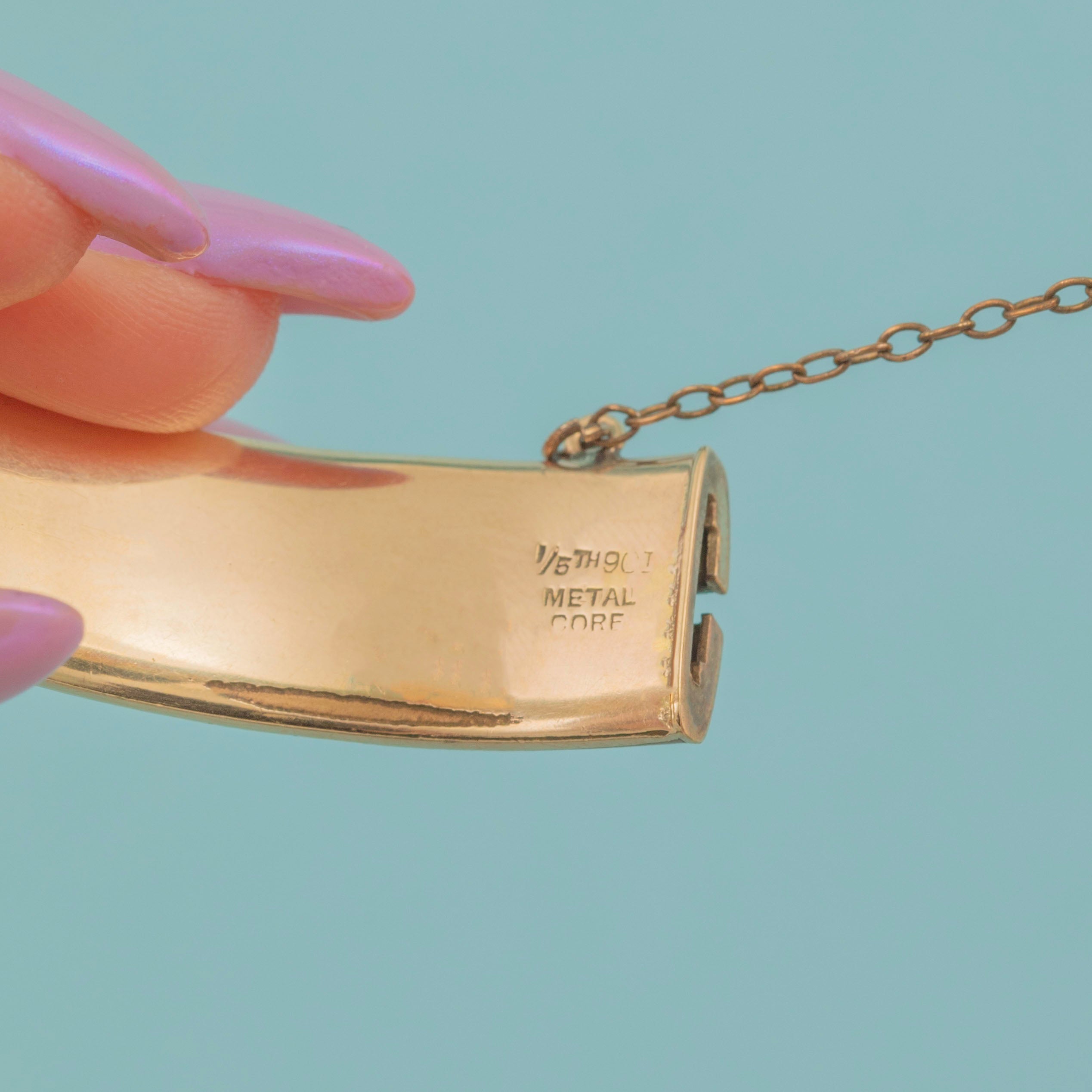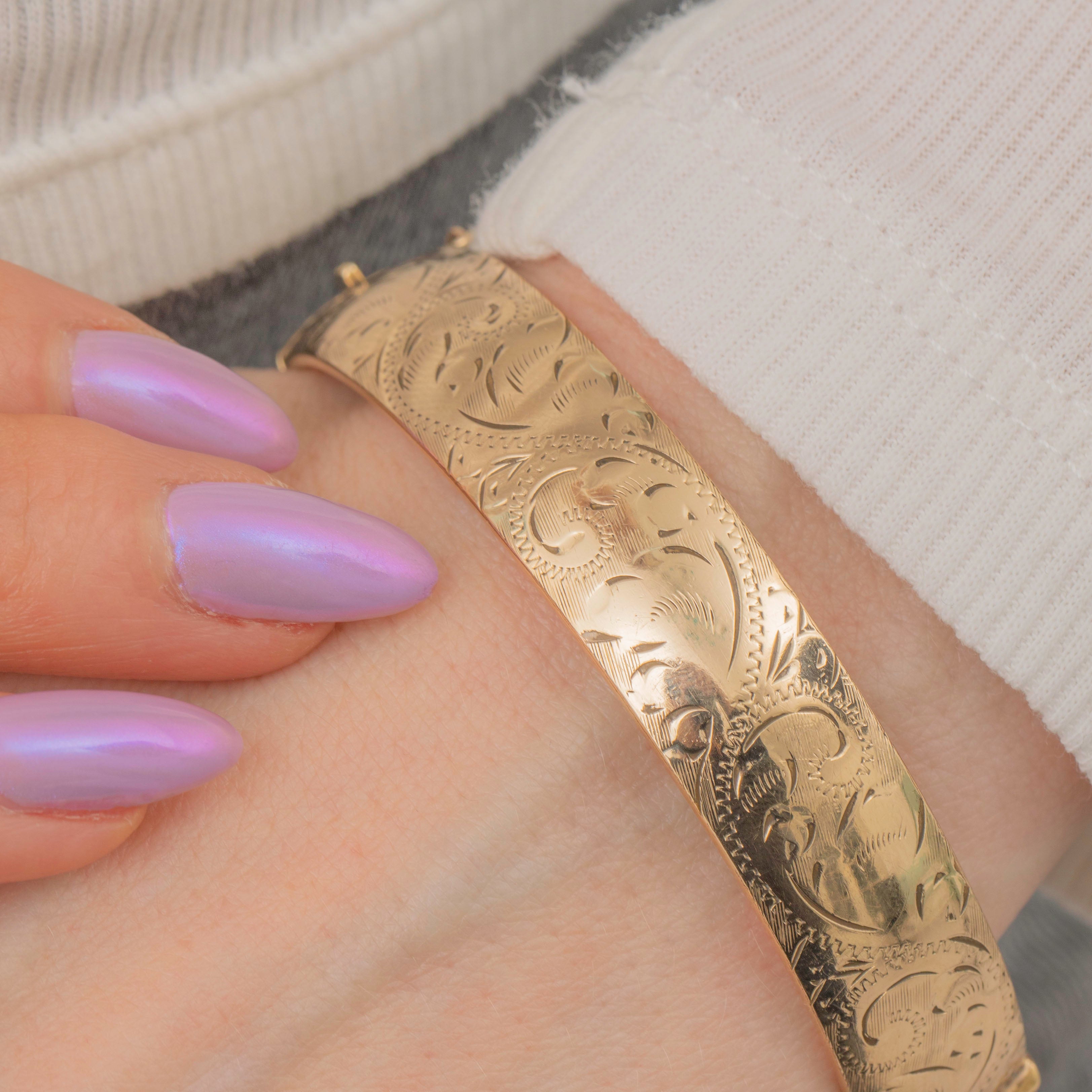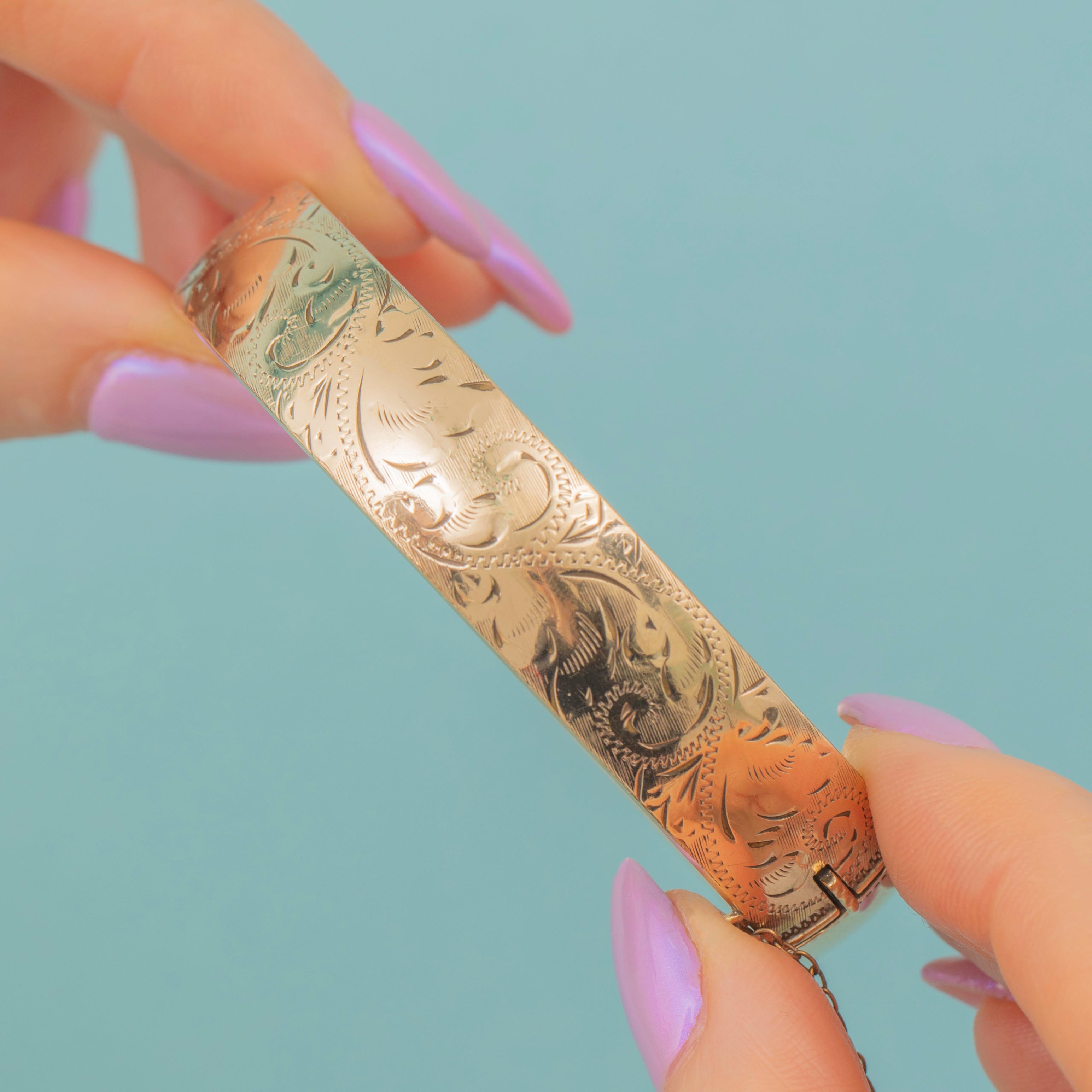 GOOD. This engraved 9ct rolled Gold bangle is in good condition, featuring a rich Gold tone and lovely engravings. Both the hinge and slide clasp are in perfect working order. The Rolled Gold on the inside of the bangle shows noticeable wear, though this won’t be visible when worn, and some of the engraved details have worn over the years. The safety chain adds an extra layer of security, ensuring this vintage bangle provides confident, secure wear for generations to come.