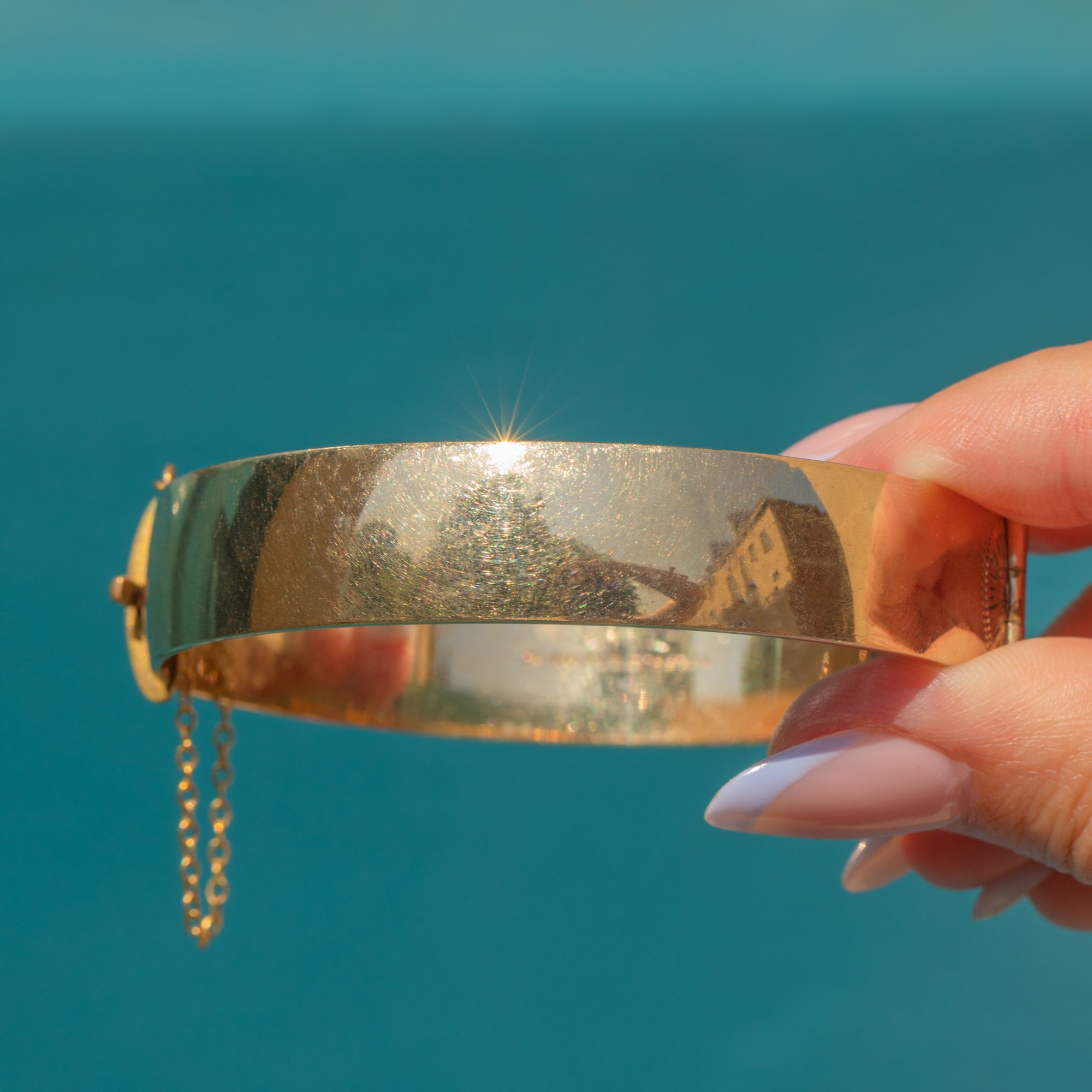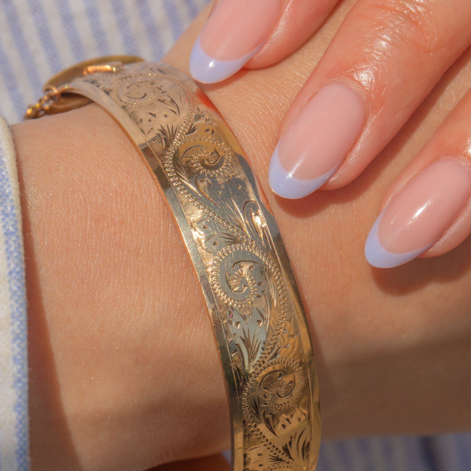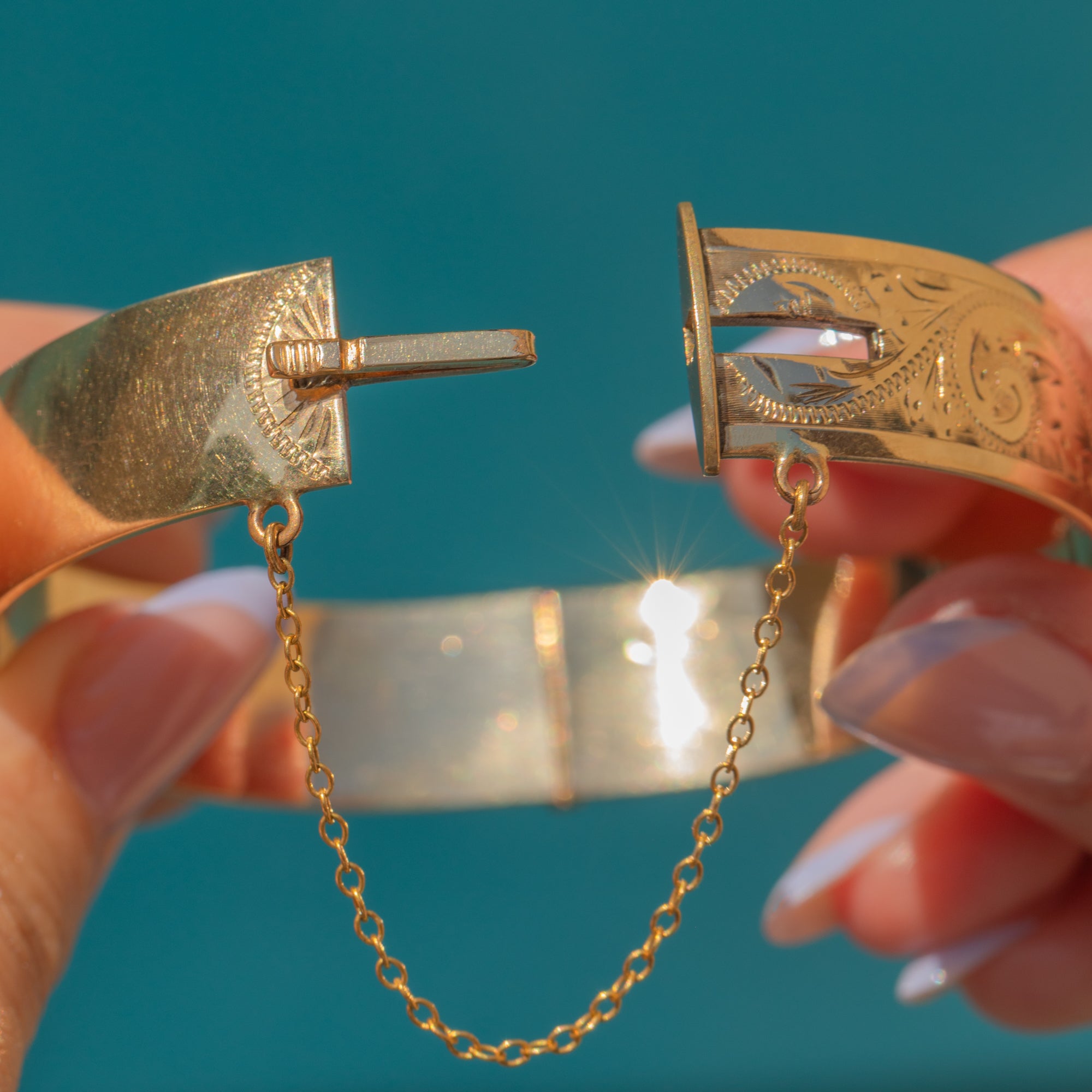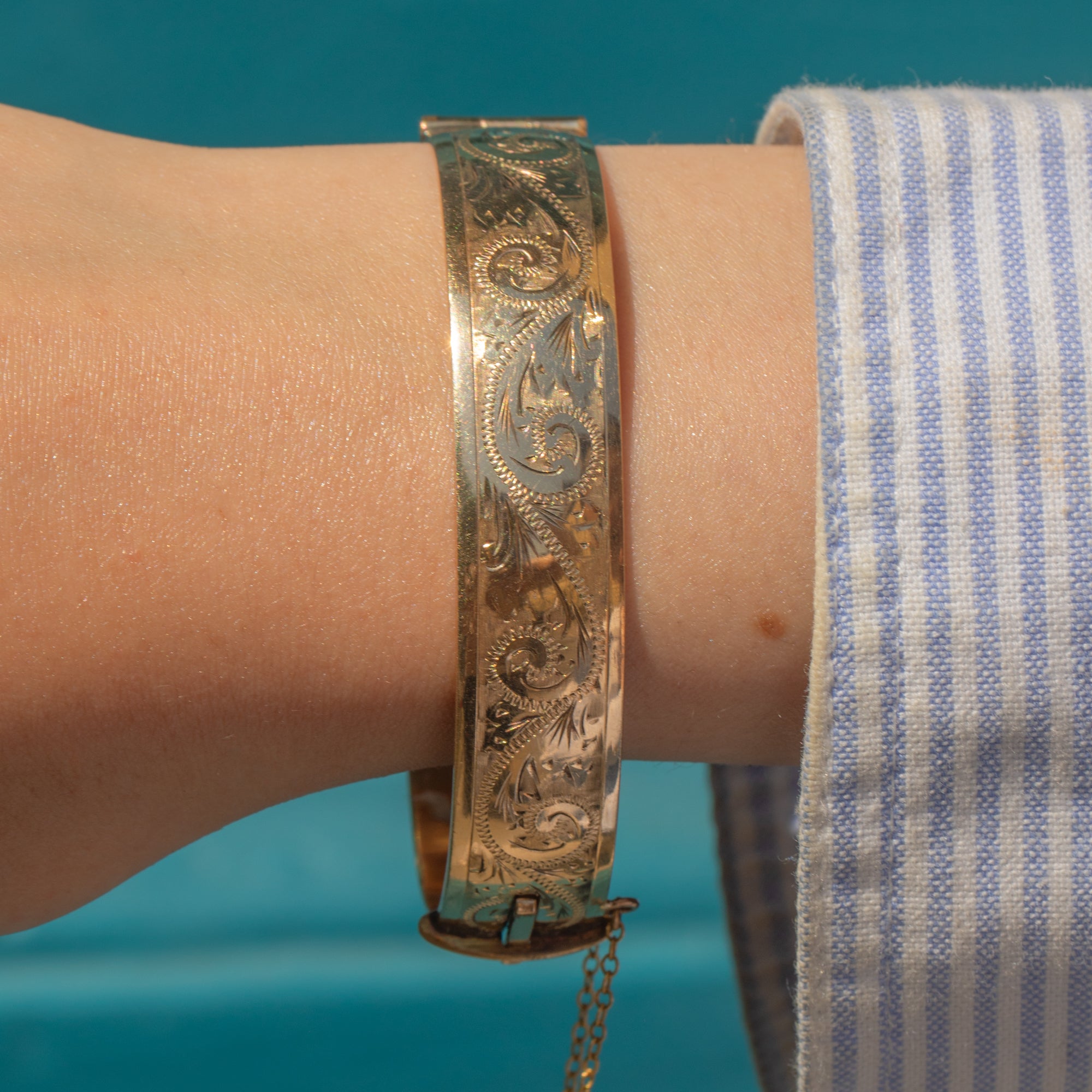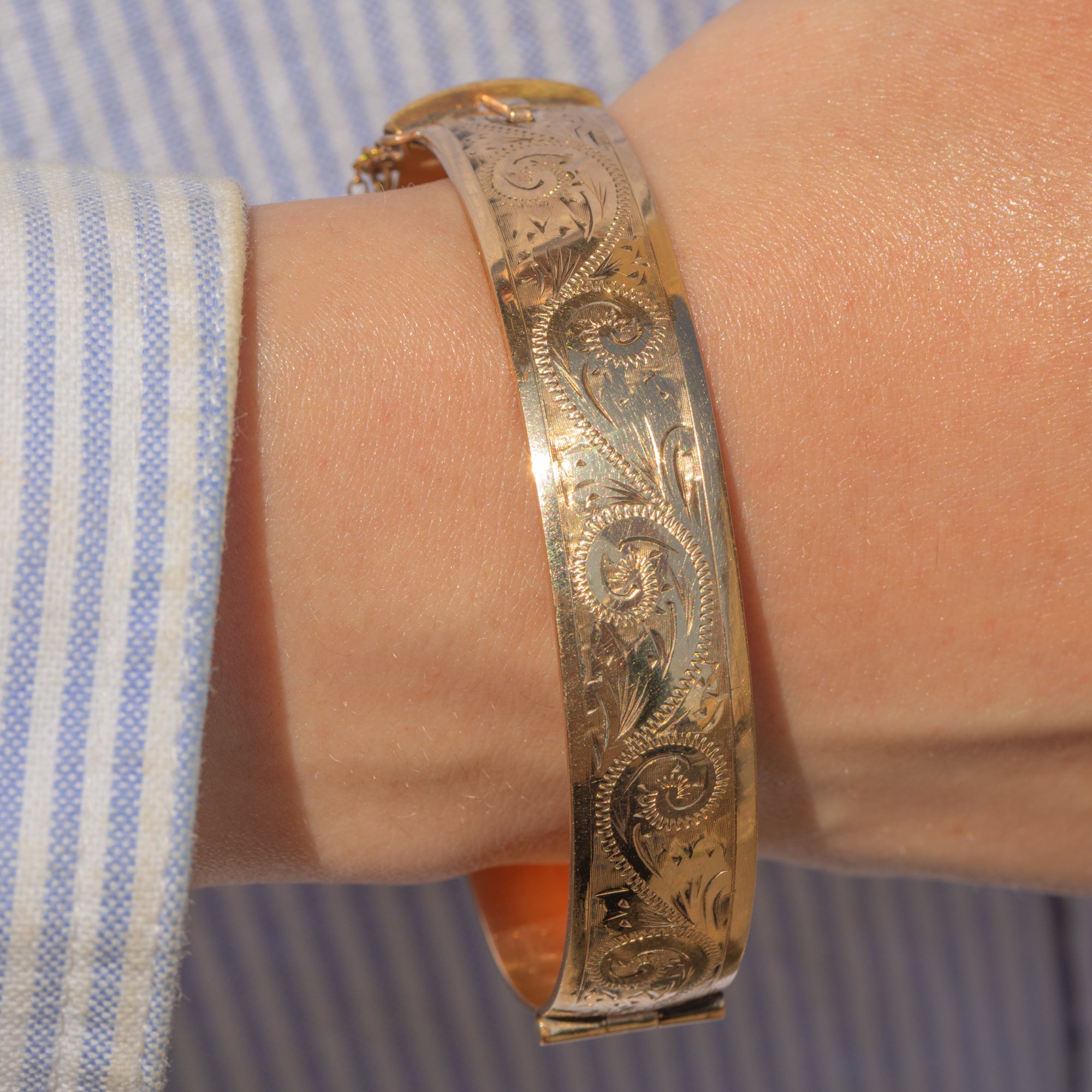 VERY GOOD. This engraved 9ct rolled Gold bangle is in very good condition! The bangle only has minor surface wear to note, commensurate with age. It closes securely and can be worn confidently, especially with the added safety chain.