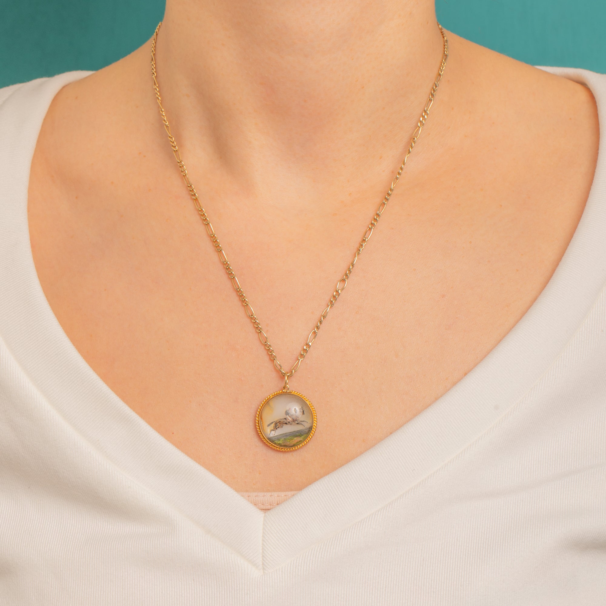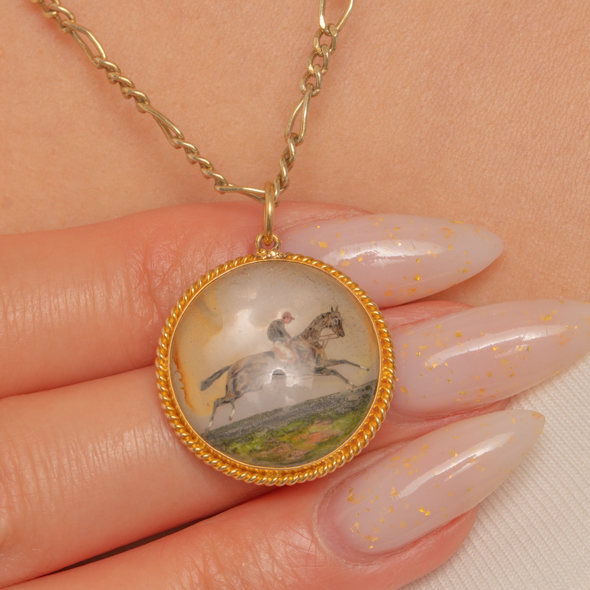 A charming Victorian equestrian Essex Crystal pendant, finely carved in reverse intaglio to depict a jockey mid-gallop. The miniature comes alive beneath the domed crystal, its depth enhanced by a luminous Mother of Pearl backing that adds a soft iridescence and a sense of motion to the scene.